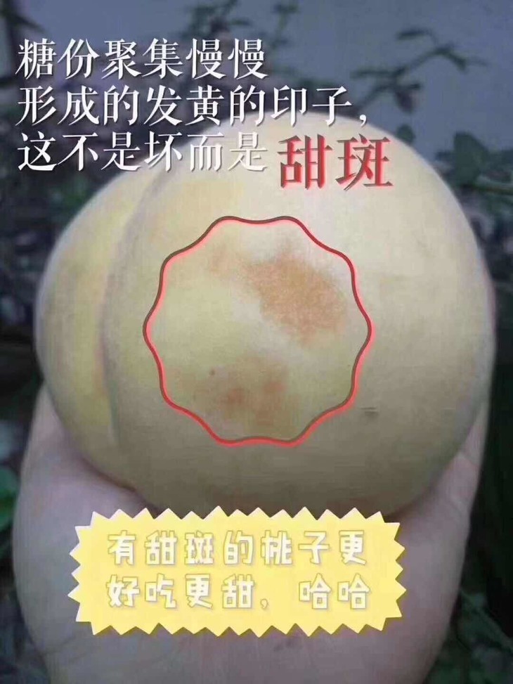 B、所有湖景桃,在一侧均有自然熟斑,跟香蕉熟透的道理一样,是判断正宗湖景桃的主要直观方式,不影响食用。