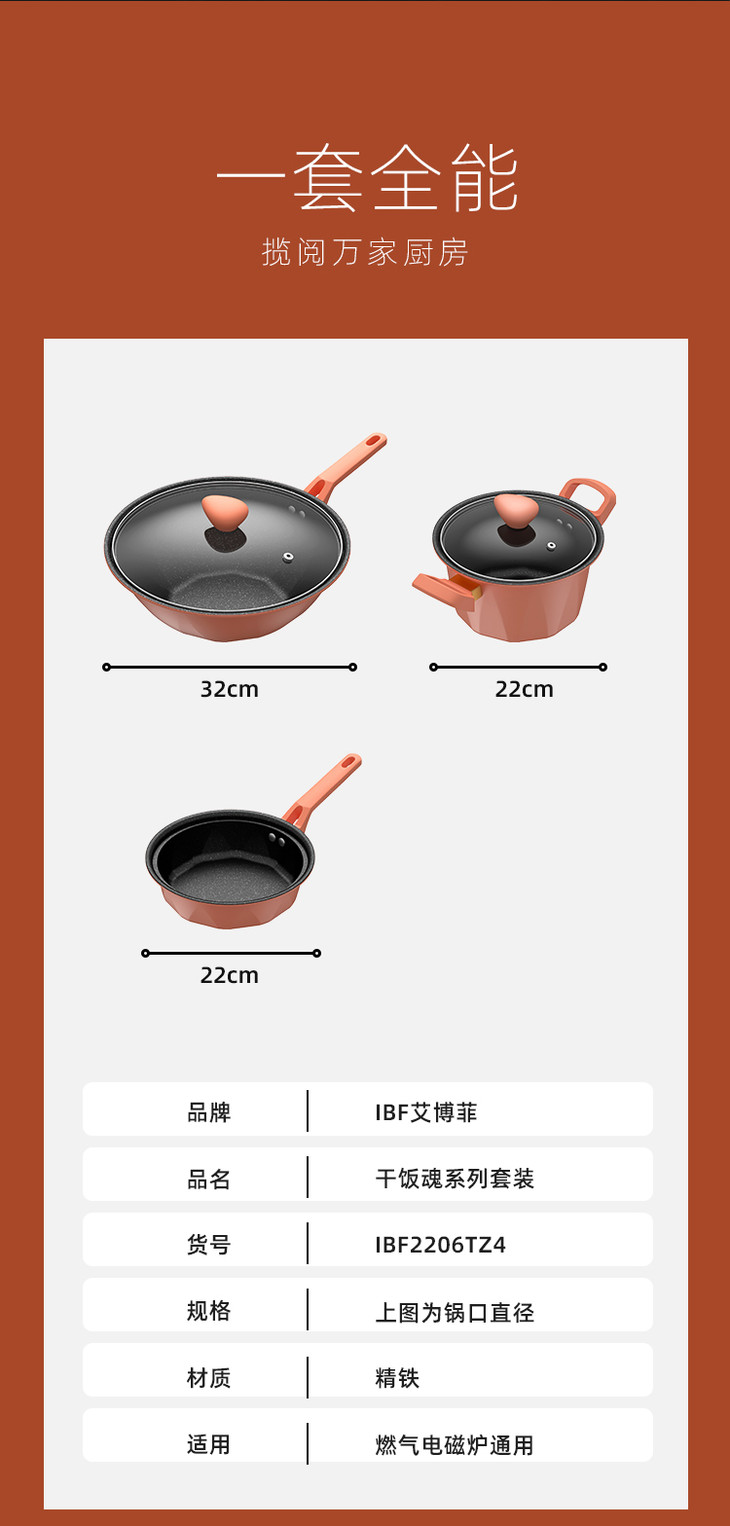 | 【品名】IBF艾博菲干饭魂三件套 【规格】煎锅+汤锅(带锅盖)+炒锅 【材质】精铁 【适用范围】燃气电磁炉通用 【产地】金华 【发货快递】中通 【不发货地区】新疆、西藏、海南、港澳台不发 【补邮费地区】青海、内蒙、甘肃、宁夏+15元运费 【发货时效】72小时发货,周末节假日顺延 |