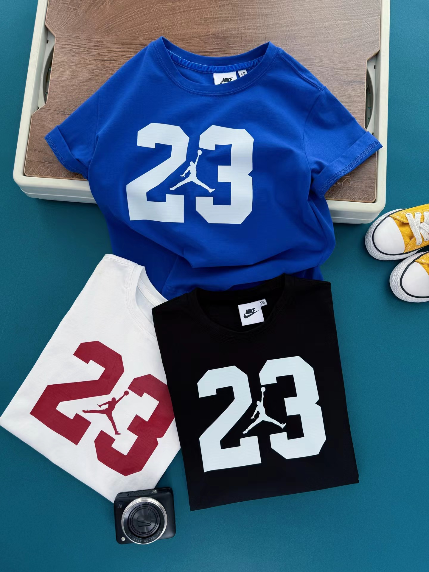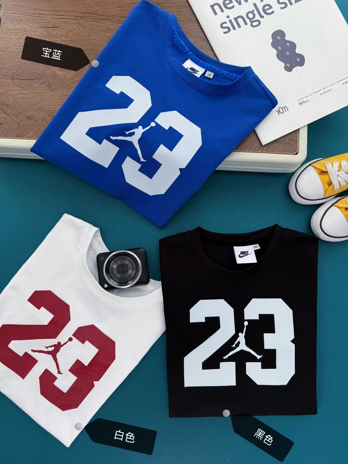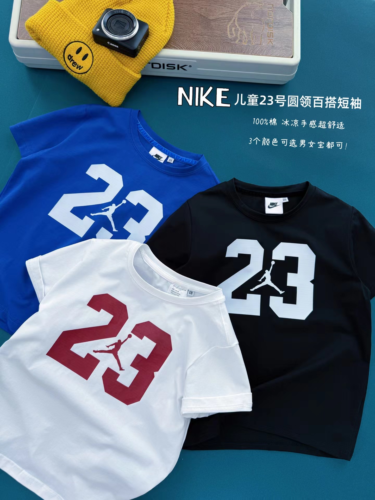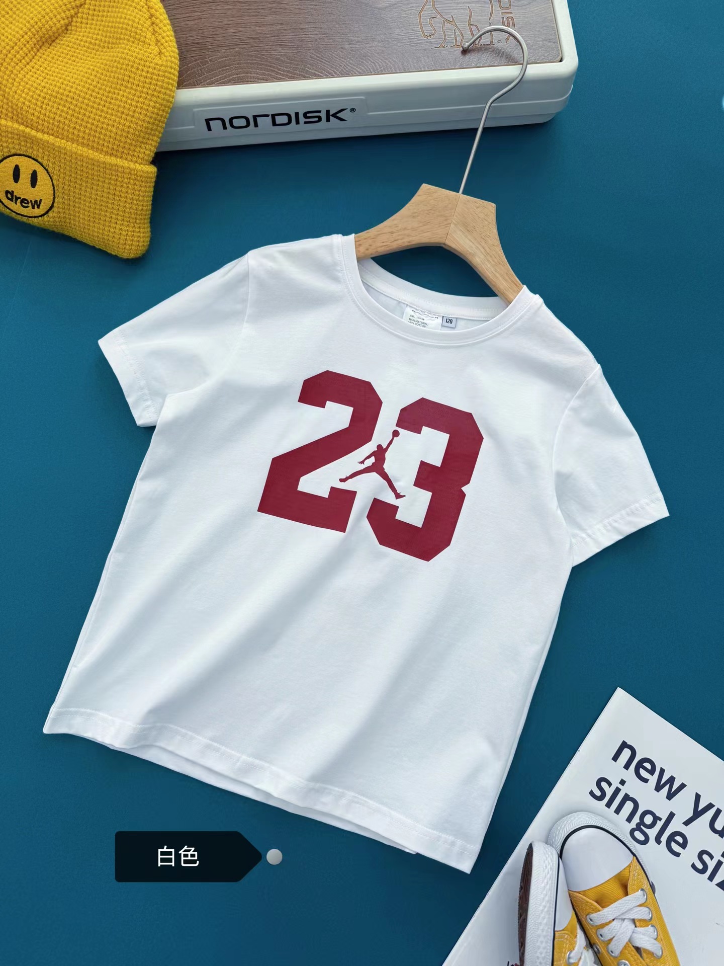 【夏日刚需】儿童23号圆领短袖|凉感棉感+运动风拉满100纯棉冰凉手感,经dian23号飞人印花,男女宝通吃的百搭wang炸款! 面料党狂喜:精选100精梳棉,上手自带凉感,透气不闷汗,夏天疯玩也不粘身,软糯亲肤不磨宝宝娇嫩肌肤。颜值即正义:经dian23号+飞人剪影印花,运动风拉满,配短裤、运动裤都超吸睛,男宝女宝都能穿出潮娃感。细节控安心:圆领贴合颈部不卡脸,走线工整耐造,机洗不变形,日常遛娃、幼儿园、运动课都能穿,实穿度拉满