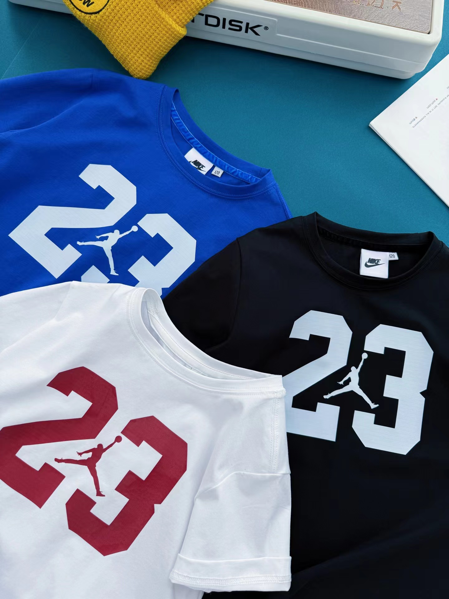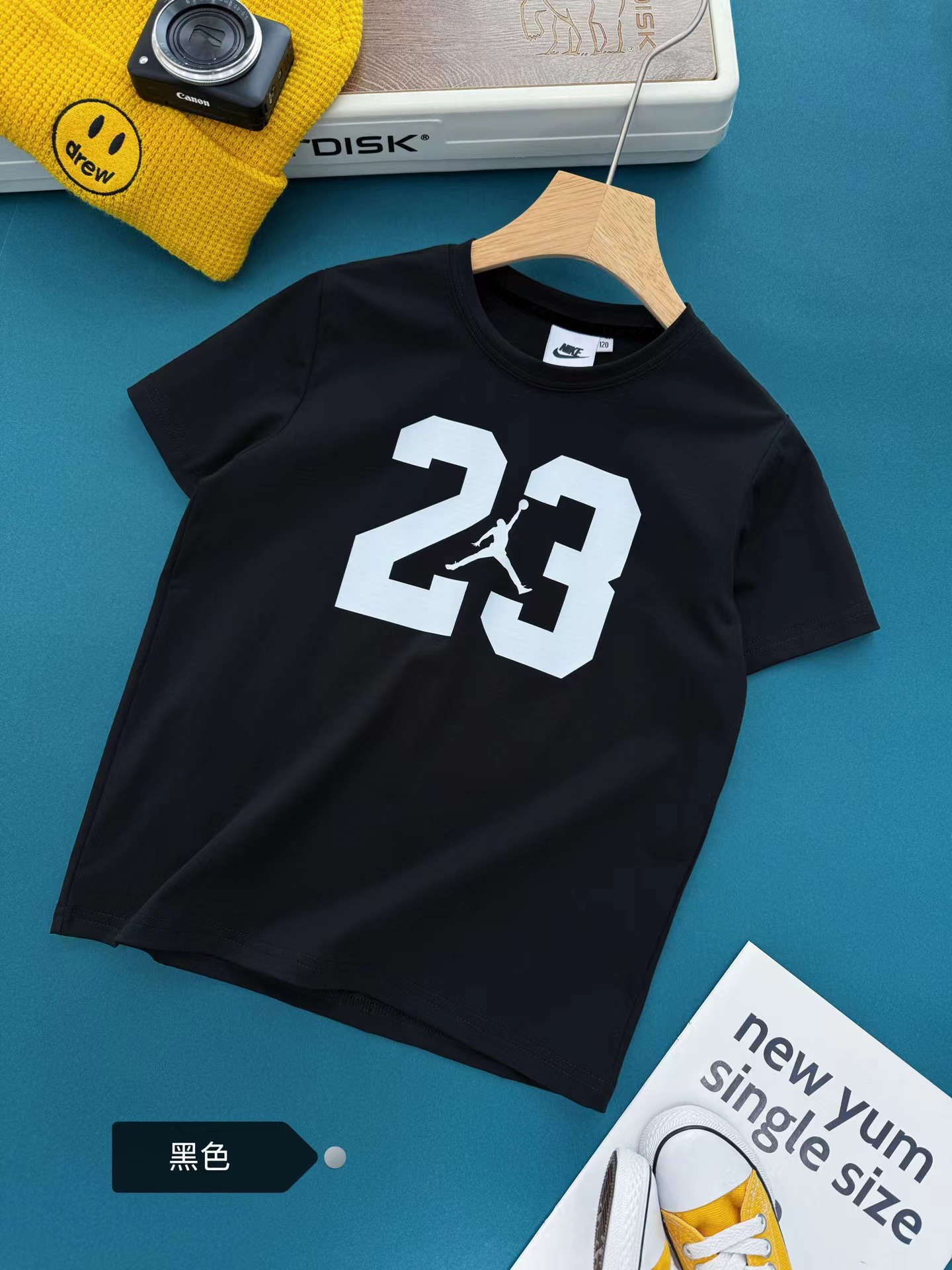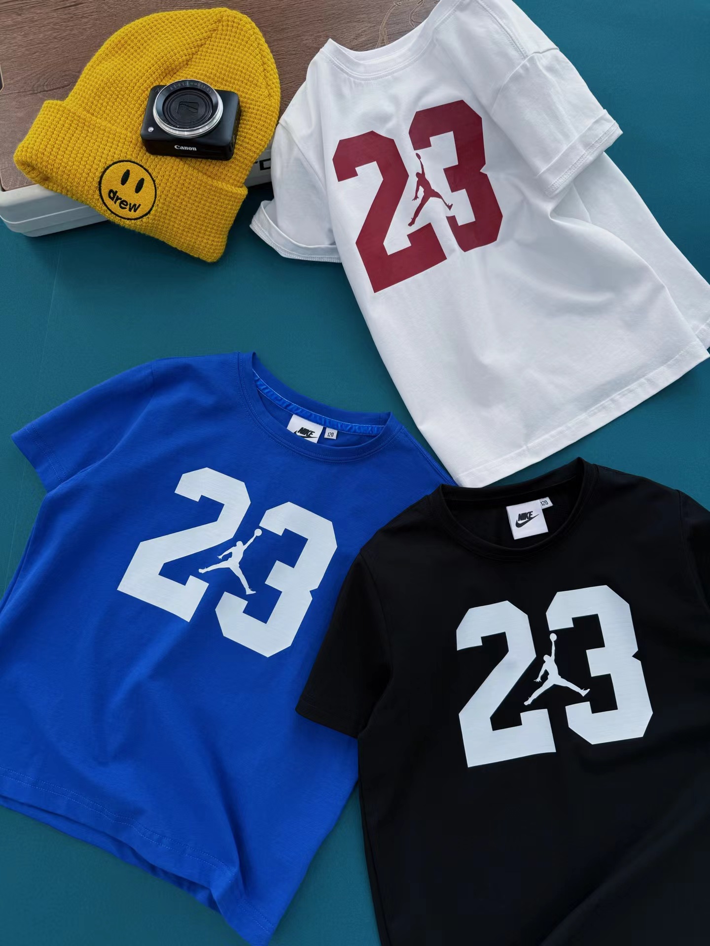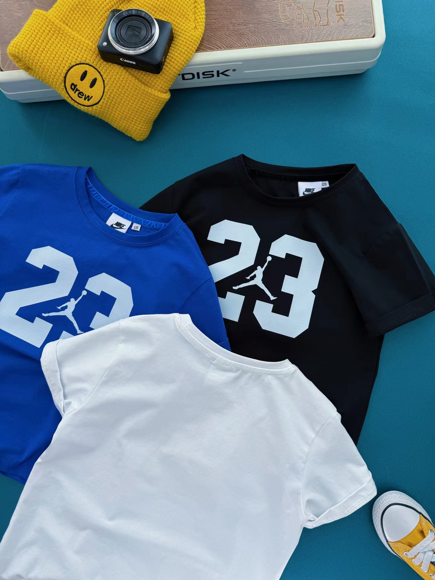 【夏日刚需】儿童23号圆领短袖|凉感棉感+运动风拉满100纯棉冰凉手感,经dian23号飞人印花,男女宝通吃的百搭wang炸款! 面料党狂喜:精选100精梳棉,上手自带凉感,透气不闷汗,夏天疯玩也不粘身,软糯亲肤不磨宝宝娇嫩肌肤。颜值即正义:经dian23号+飞人剪影印花,运动风拉满,配短裤、运动裤都超吸睛,男宝女宝都能穿出潮娃感。细节控安心:圆领贴合颈部不卡脸,走线工整耐造,机洗不变形,日常遛娃、幼儿园、运动课都能穿,实穿度拉满