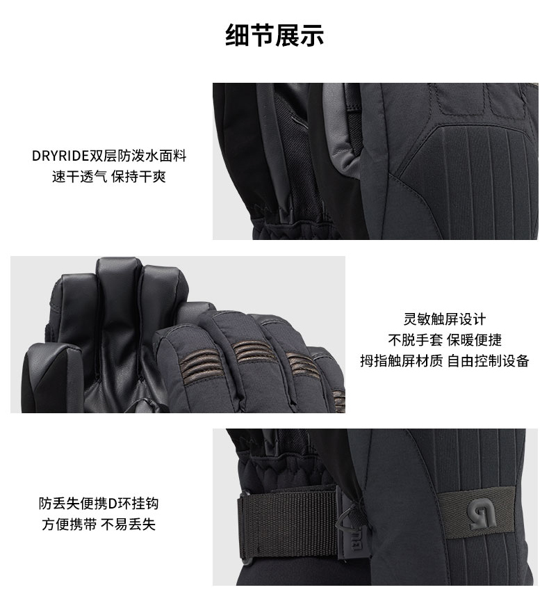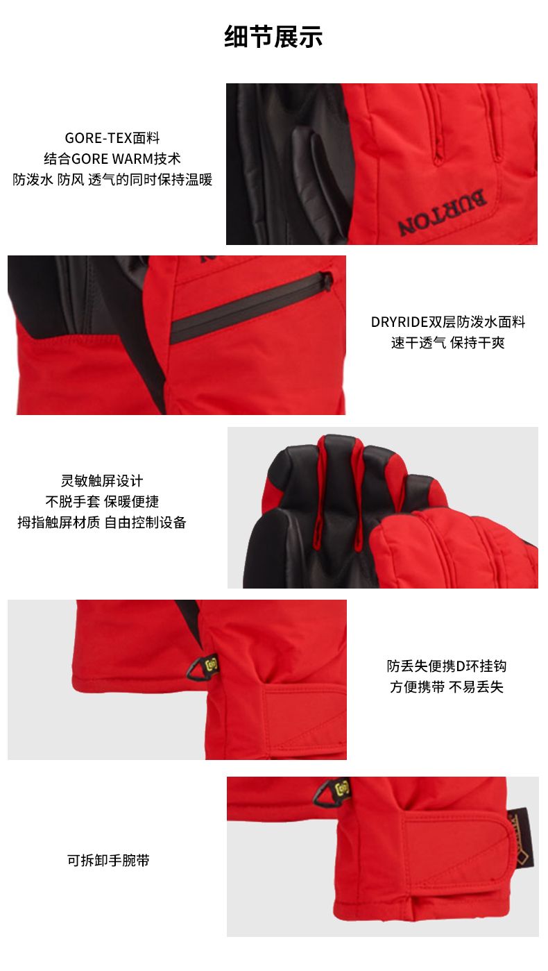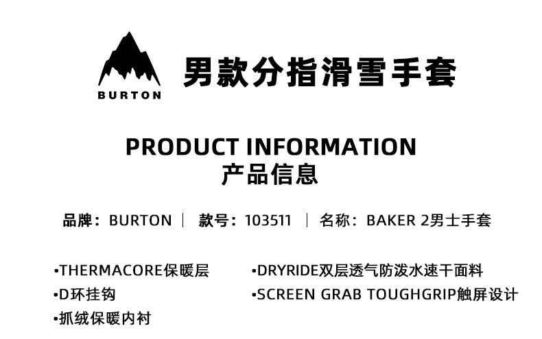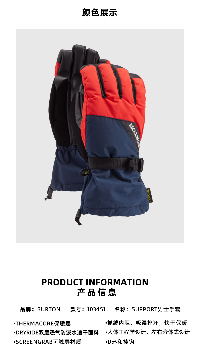 【断码六折】抓板手套BURTON/伯顿男款分指并指手套PROSPECT单板滑雪手套防风保暖103051