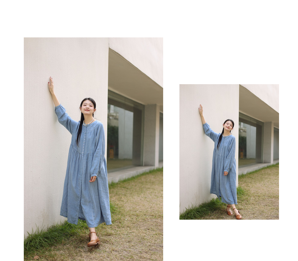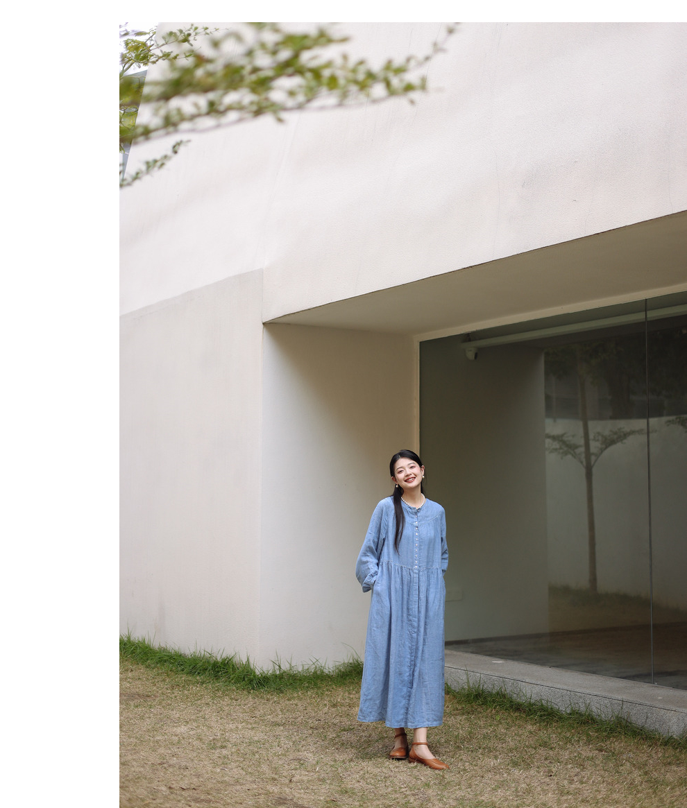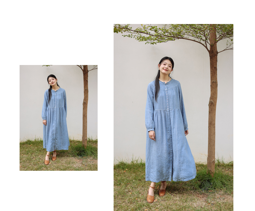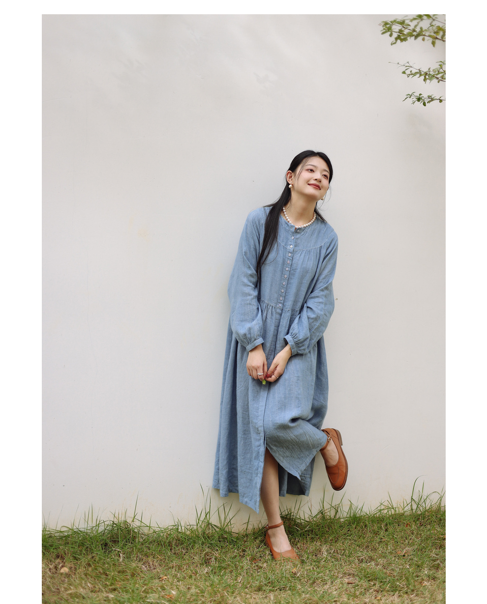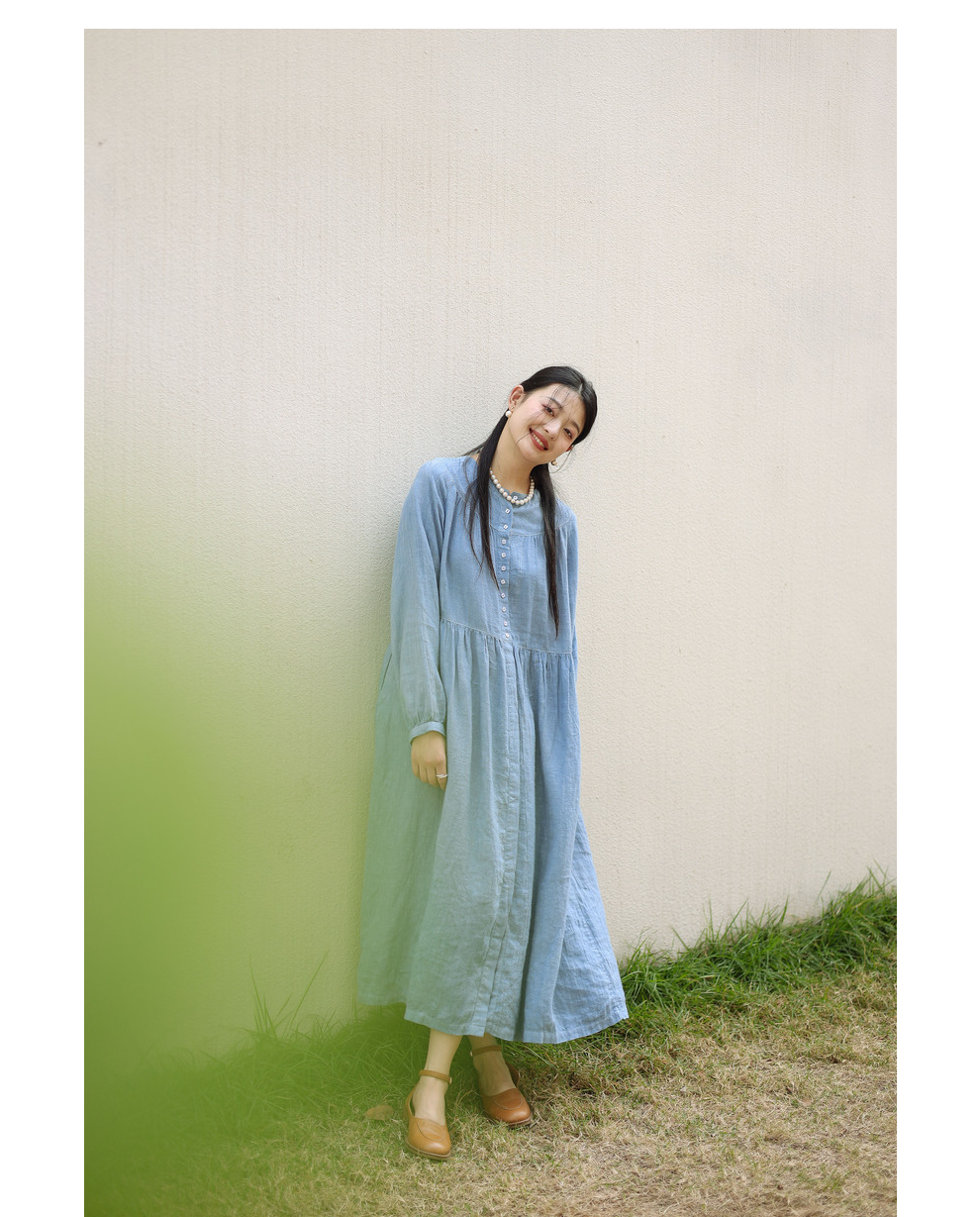 绽放051朵/雾蓝色亚麻磨毛成衣染色碎褶长袖文艺旅游穿搭连衣裙