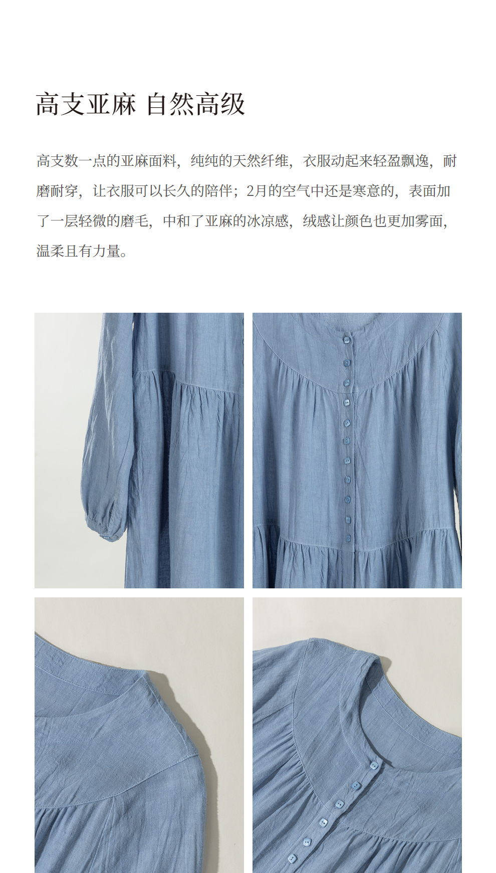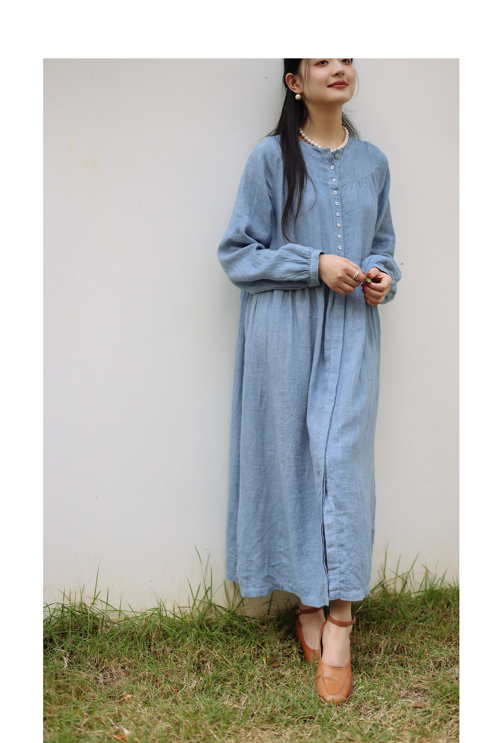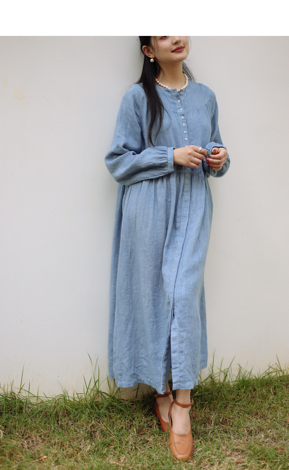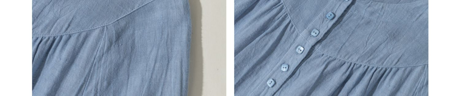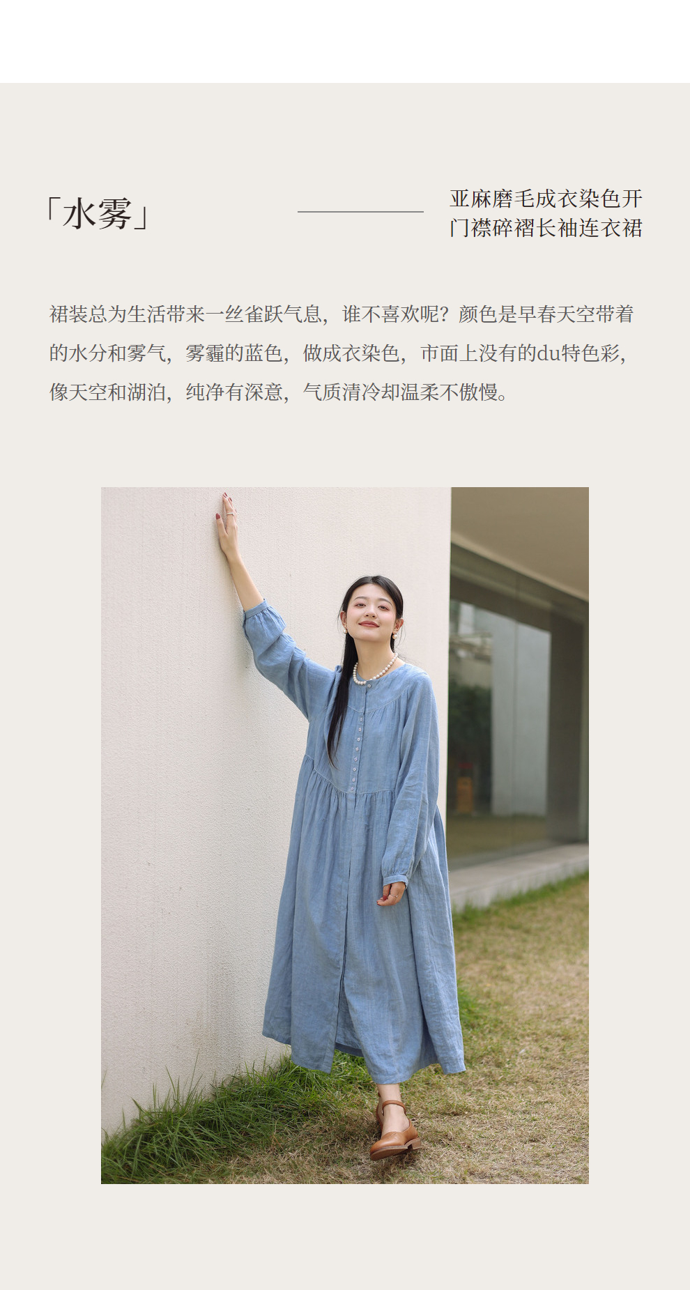 绽放051朵/雾蓝色亚麻磨毛成衣染色碎褶长袖文艺旅游穿搭连衣裙
