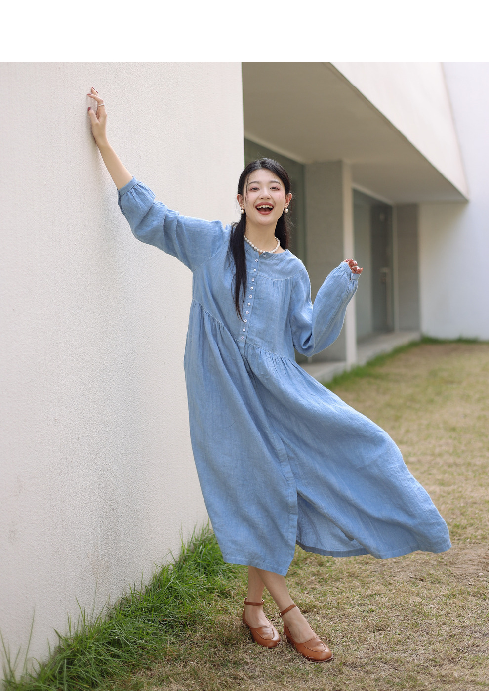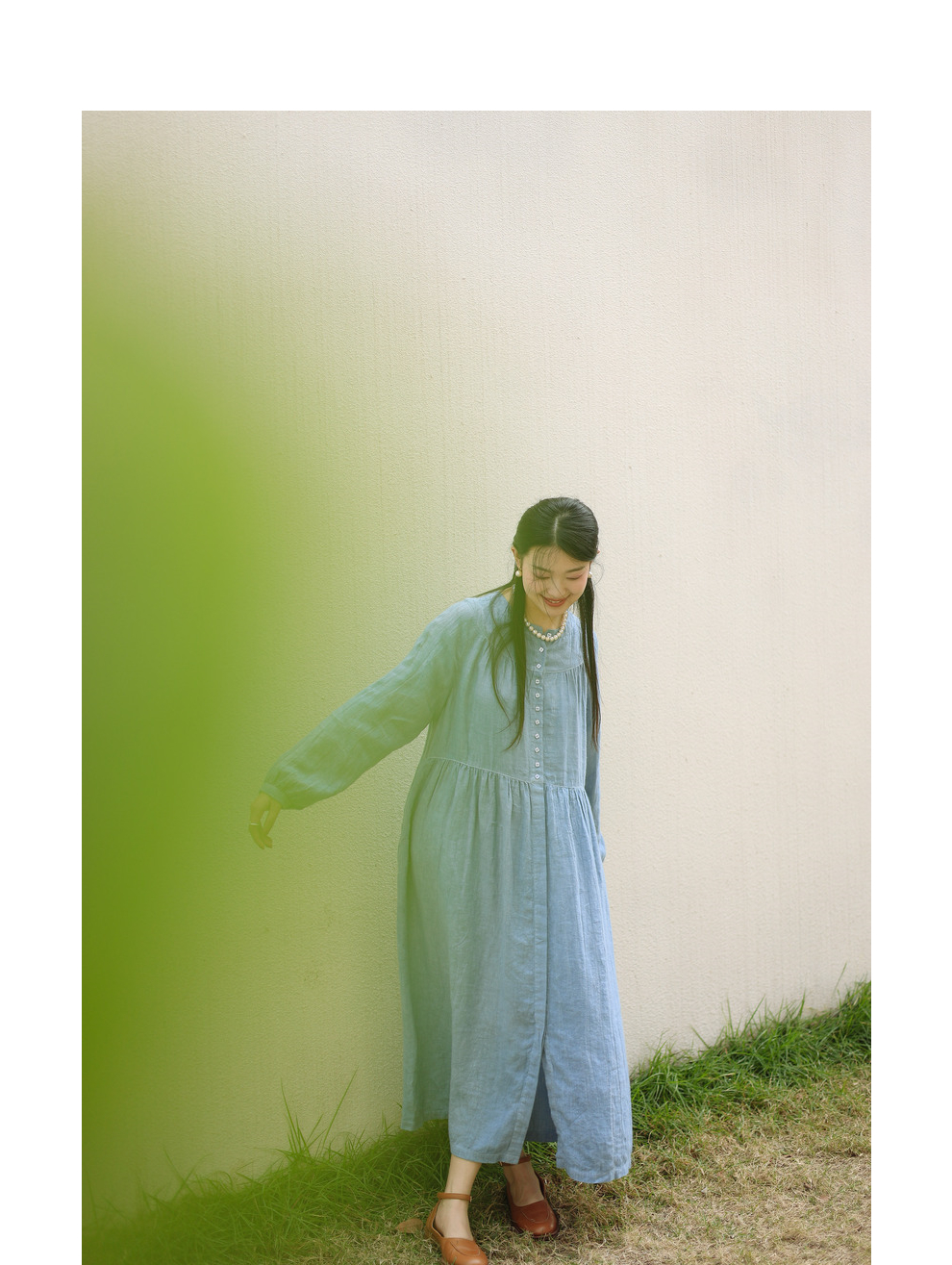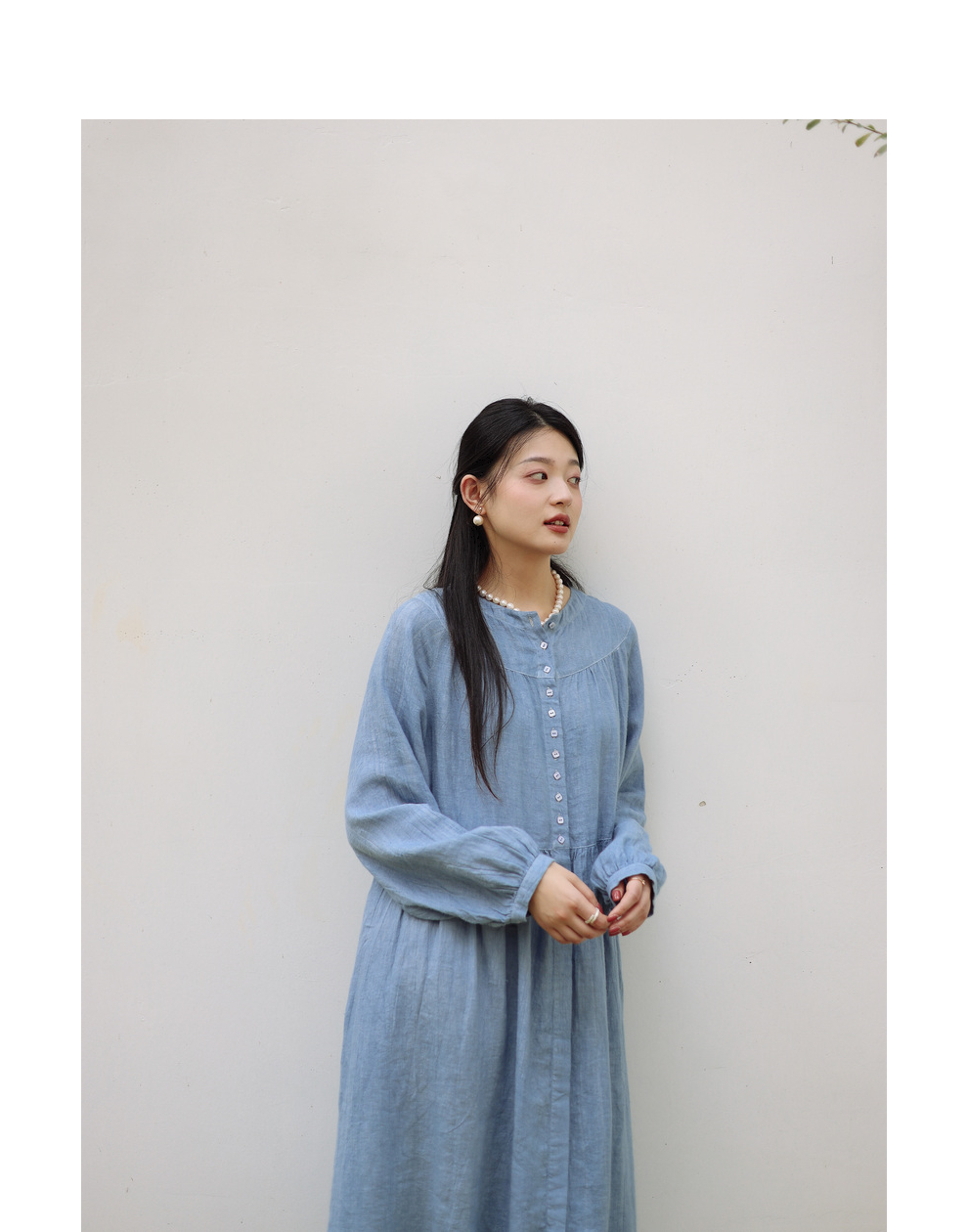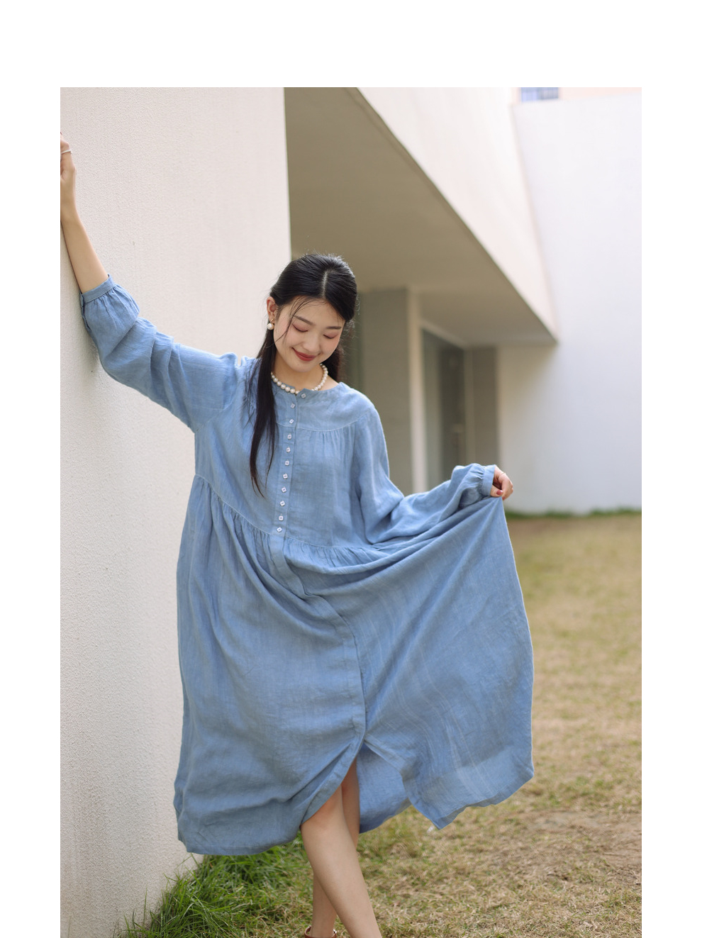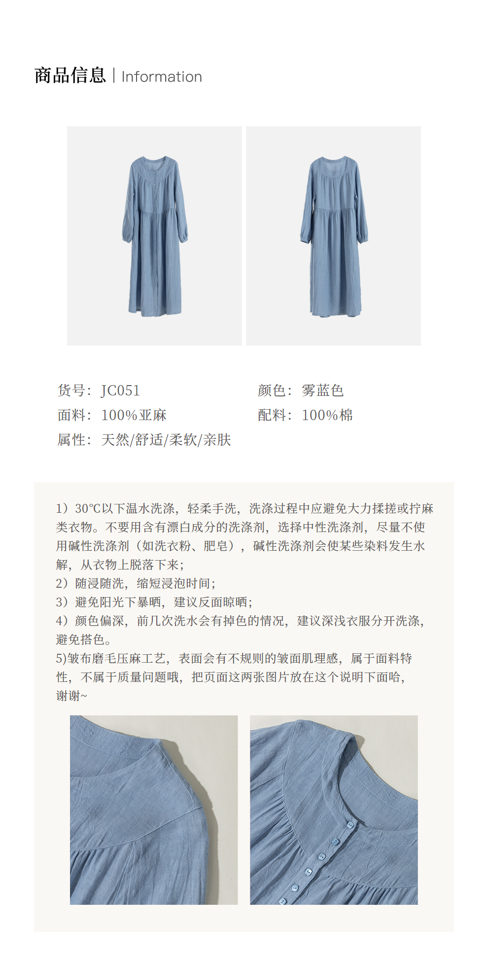 绽放051朵/雾蓝色亚麻磨毛成衣染色碎褶长袖文艺旅游穿搭连衣裙