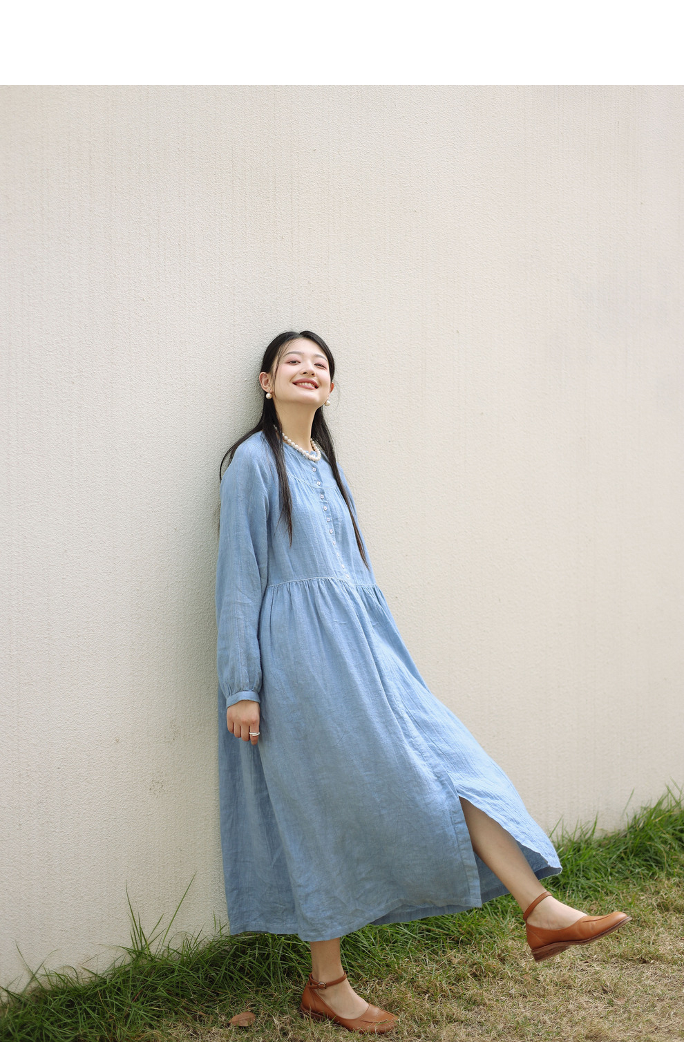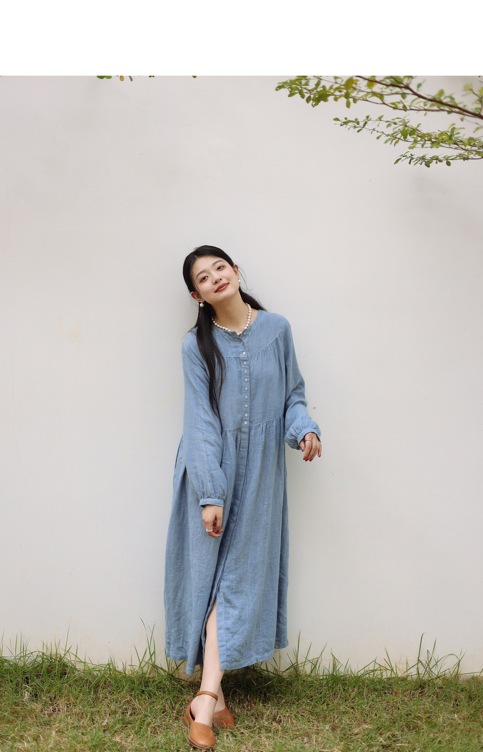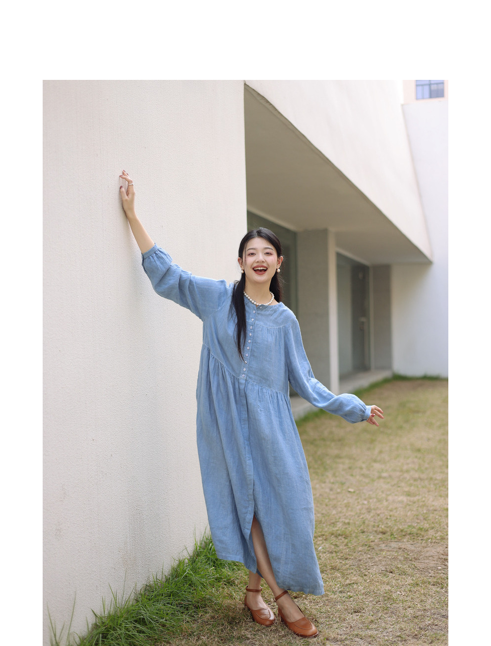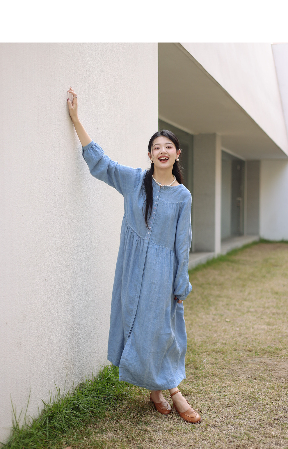 绽放051朵/雾蓝色亚麻磨毛成衣染色碎褶长袖文艺旅游穿搭连衣裙