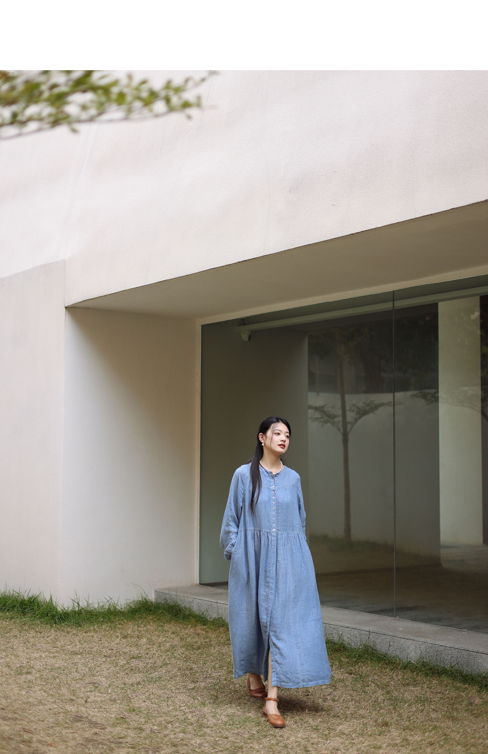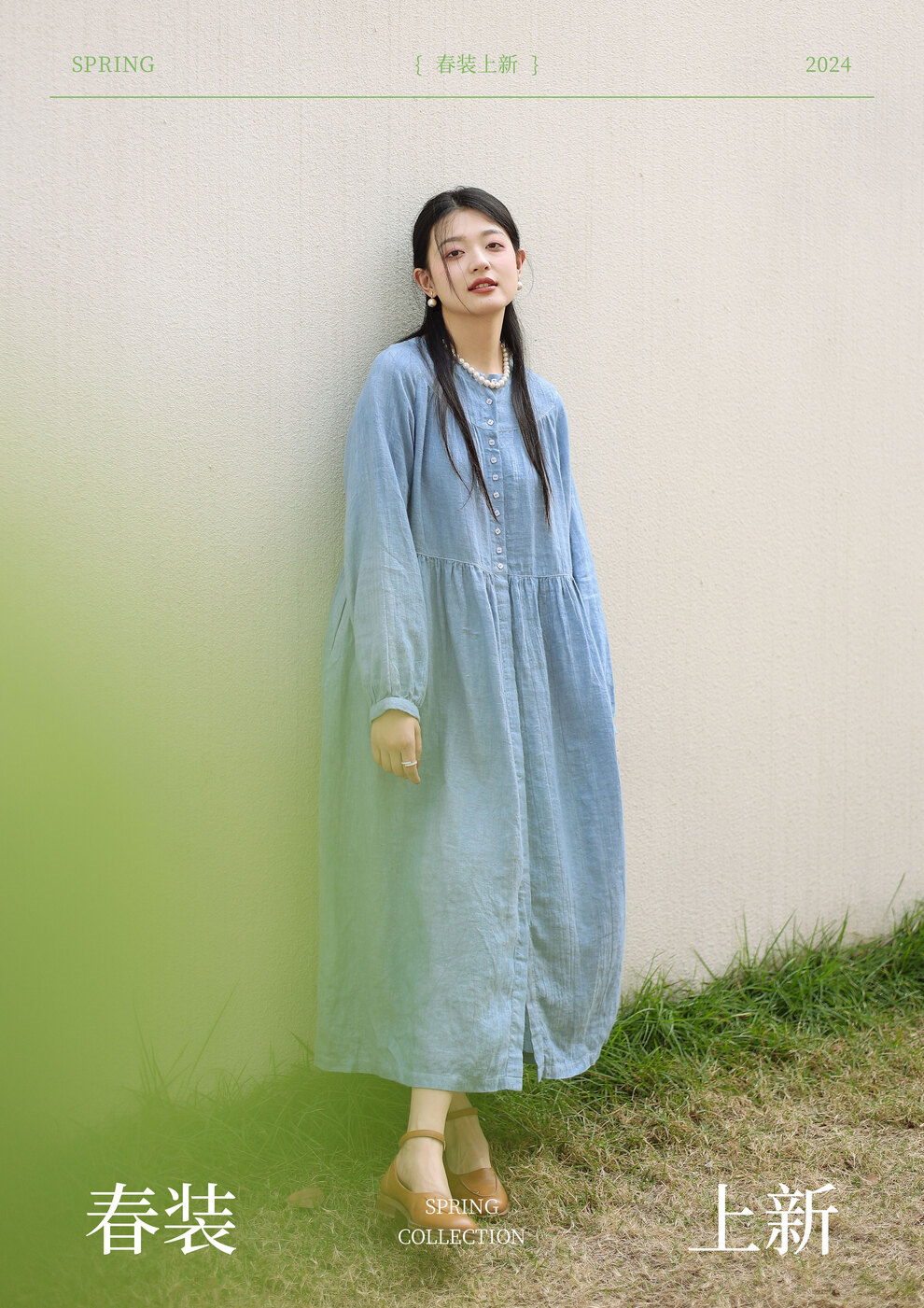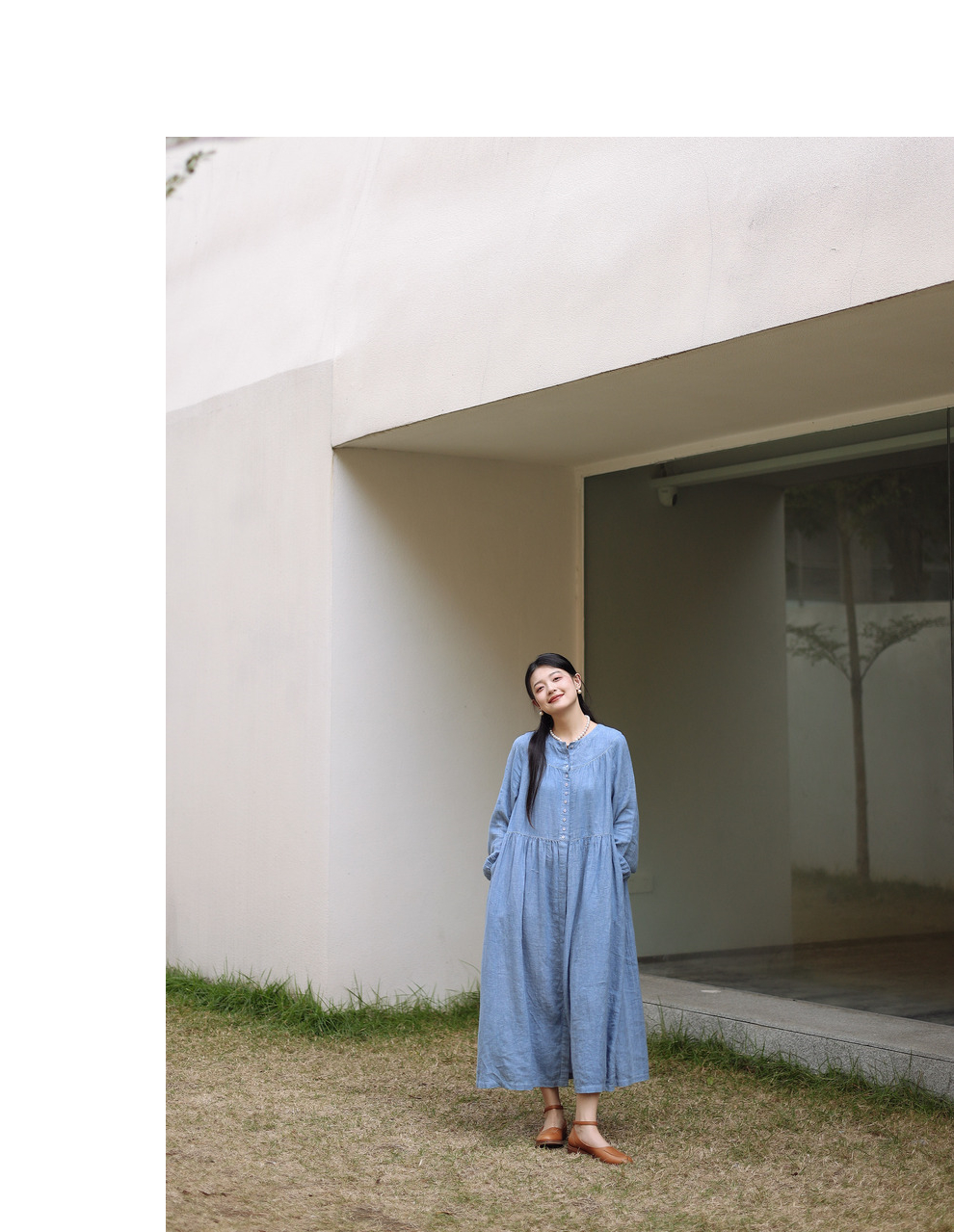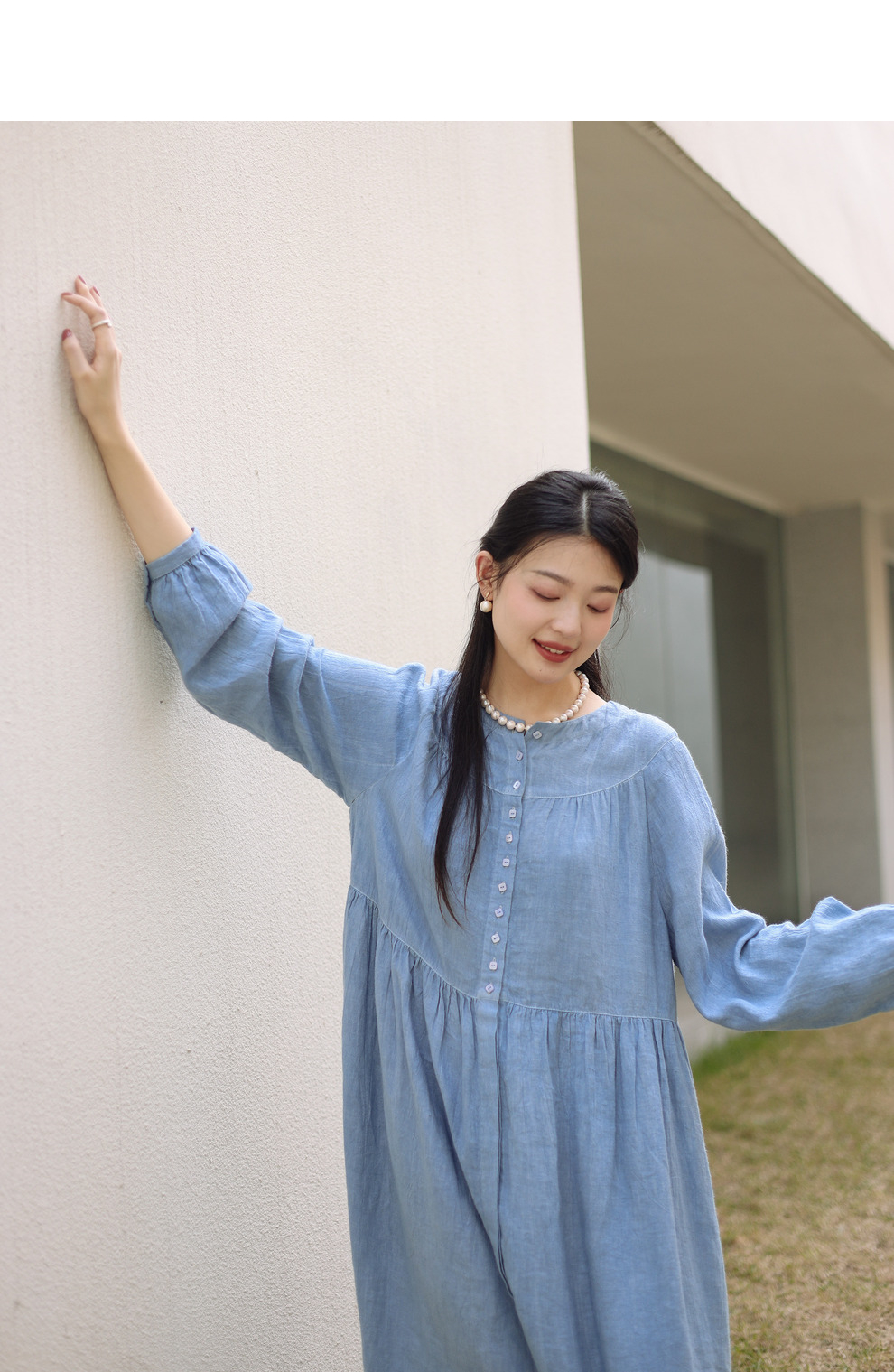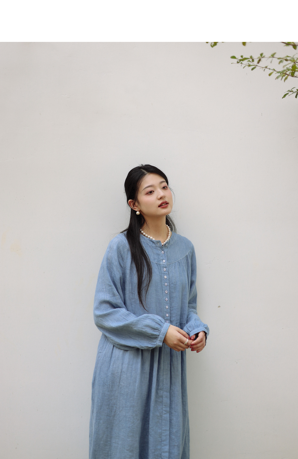 绽放051朵/雾蓝色亚麻磨毛成衣染色碎褶长袖文艺旅游穿搭连衣裙