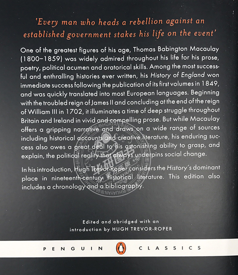 Thomas Babington Macaulay(1800-59) was widely admired throughout his life for his prose, poetry, political acumen and oratorical skills. Among the most successful and enthralling histories ever written, his History of England won instantaneous success following the publication of its first volumes in 1849, and was rapidly translated into most European languages.