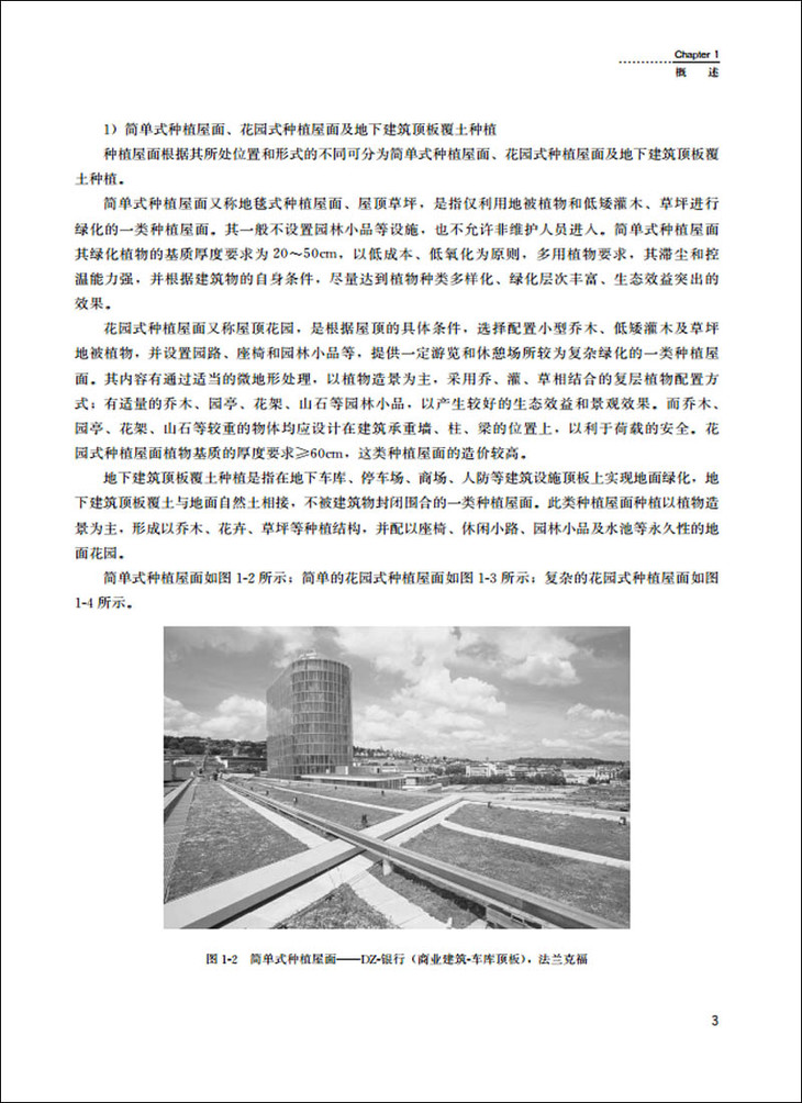 进行屋顶绿化不仅能为都市居民在紧张的工作之余提供一个良好的休闲环境,更是一项保护生态、调节气候、净化空气、遮阴覆盖、降低室温和美化城市市容的重要措施。种植屋面的设计与施工不同于地面绿化的设计与施工,其不仅是叠山理水、种植花草、营造小品,而且在其建筑屋面防排水、整体形状、空间布局等诸多方面有所开创和发展。《种植屋面的设计与施工技术》一书以《种植屋面工程技术规范》JGJ 155—2013等现行国家标准和国家建筑标准设计图集《种植屋面建筑构造》14J 206等图集为依据,以德国威达公司的种植屋面技术为主要实例,侧重介绍了当前国内外先进的屋面绿化技术。