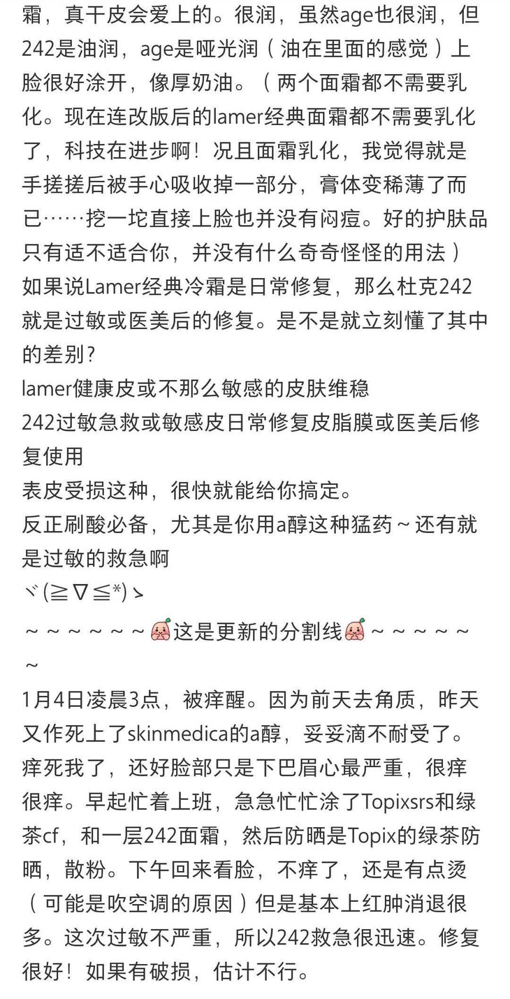 大家都知道,我屏障受损蛮长时间了,所以在用皮脂膜箱前,我基本上就是【可丽金】、【雅漾大白】,最多加上个【角鲨烷和神经酰胺】。可是,雅漾大白虽然有效,但日常不太合适,也不能用很多时间。等泛红干痒长小红点等状态有改善了,再过度一段,就可以换用这款修丽可的皮脂膜霜,继续修复到健康状态,再继续加更多的功能性护肤。