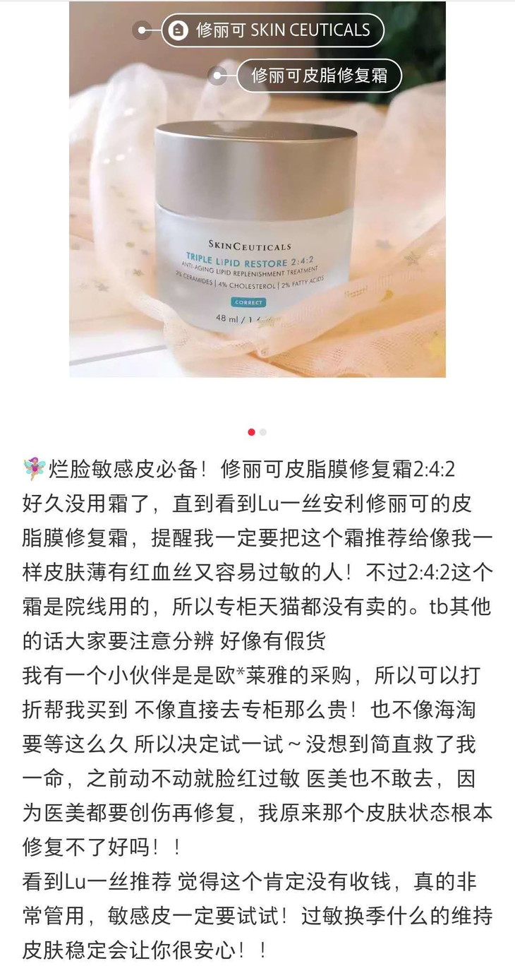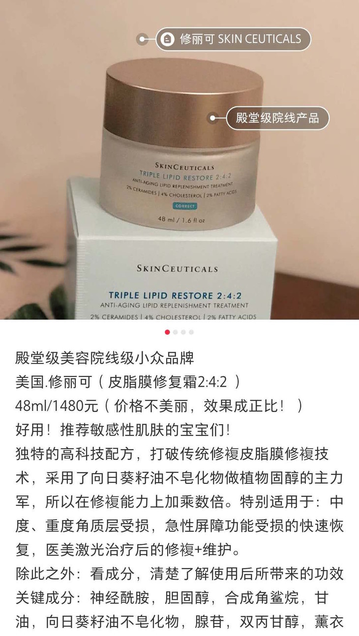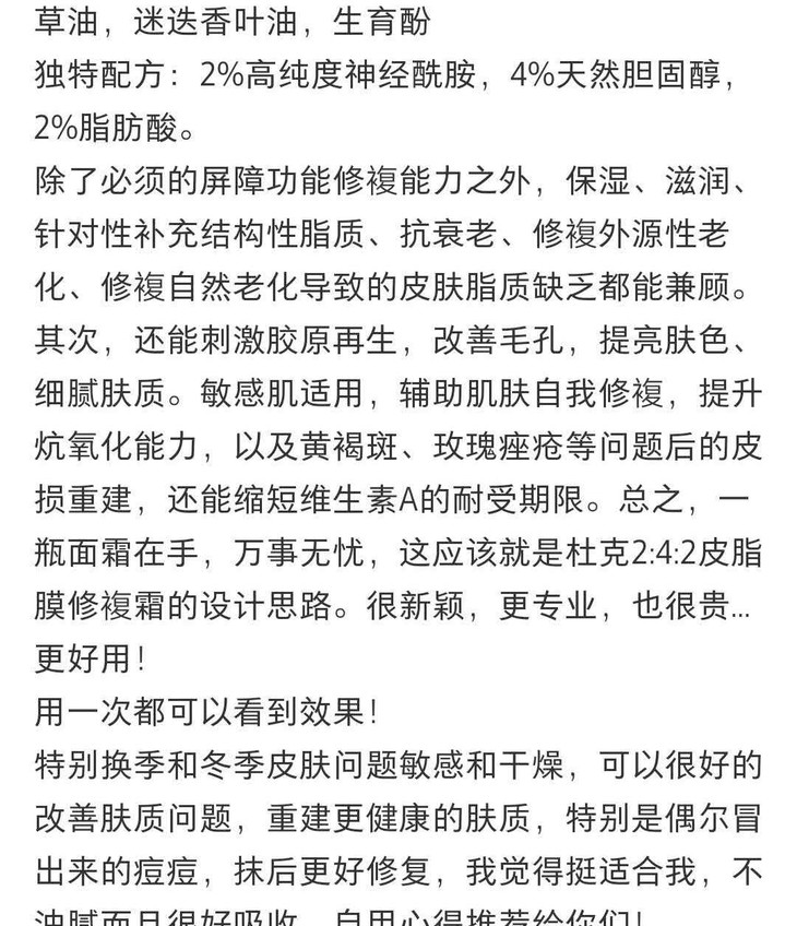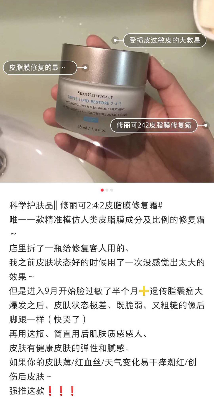 修丽可的皮脂膜修复霜,也就是2:4:2霜,它是用神经酰胺、胆固醇和脂肪酸按2:4:2比例调配的,对皮肤屏障受损修FU很棒。