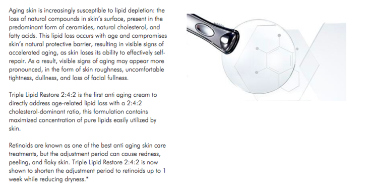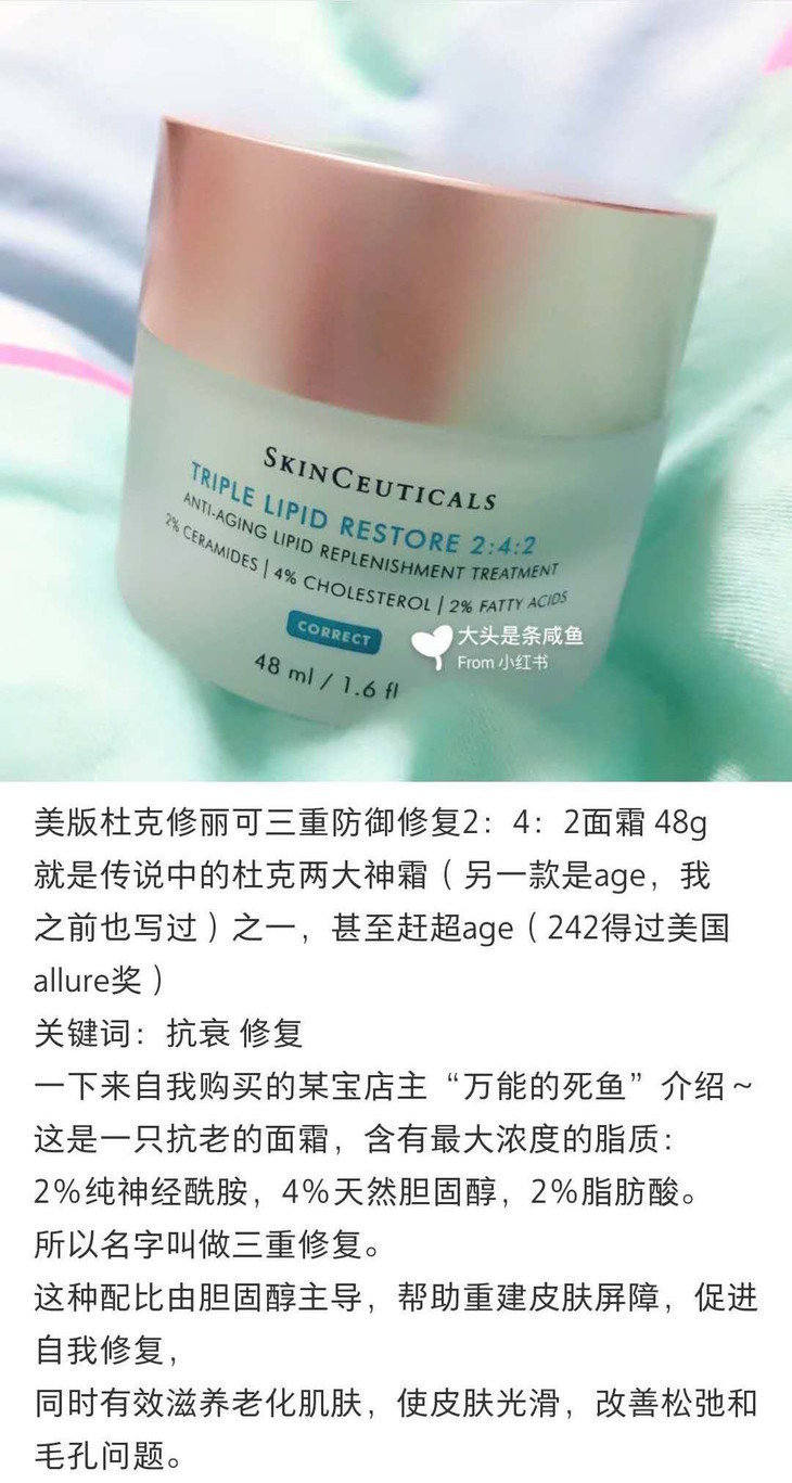 TRIPLE LIPID RESTORE 2:4:2杜克三重防御修复面霜,针对皮肤松弛,日光辐射和不平滑等问题,2:4:2分别是2%纯神经酰胺、4%天然胆固醇和2%脂肪酸。这个比例可以加强帮助皮肤的自我修复,滋养能力,还可以起到抗SHUAI老作用,24小时保湿滋润,抗YANG化强,CU进皮肤胶原蛋白增生,8周使用,皮肤变得紧致,弹性更柔滑