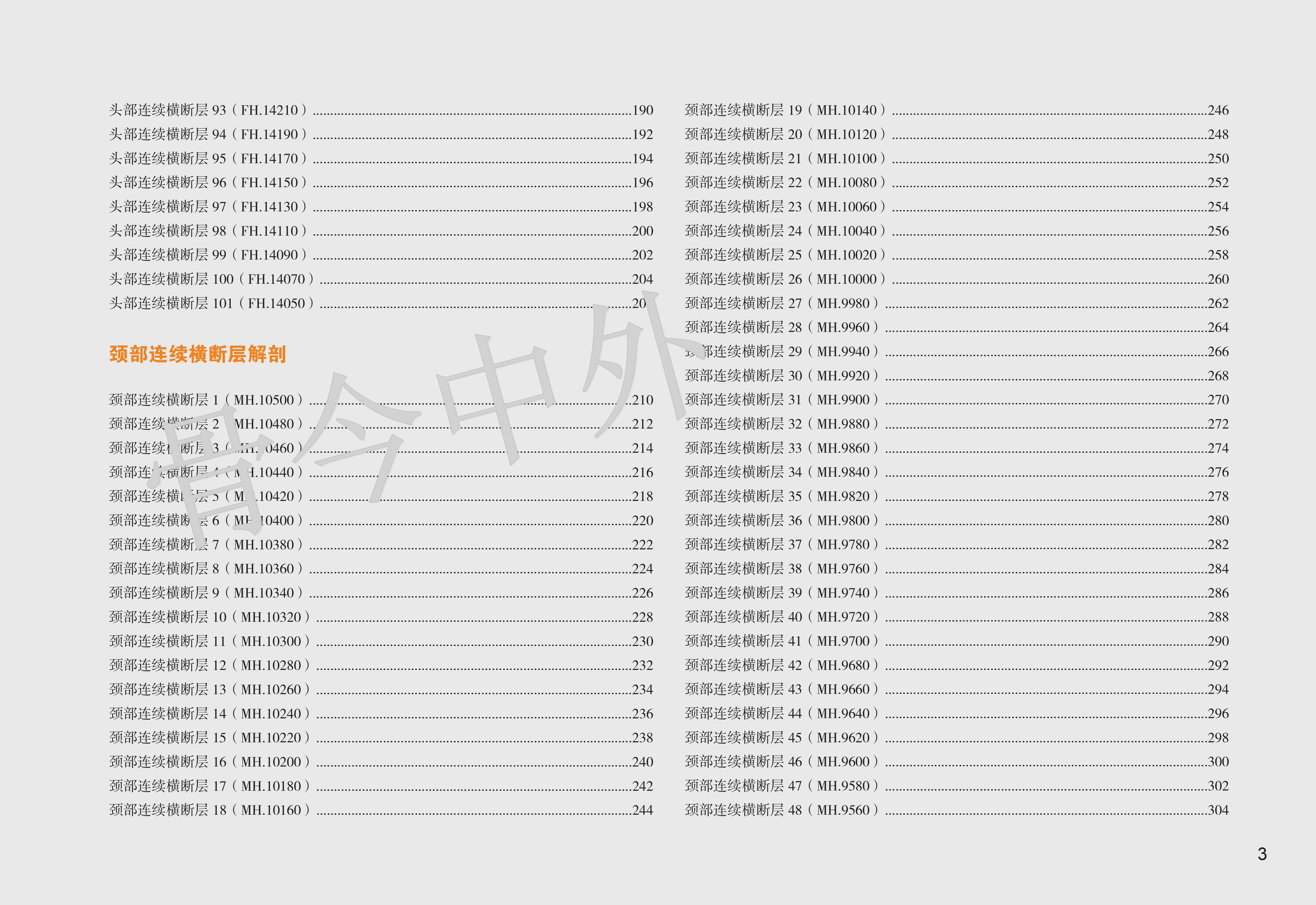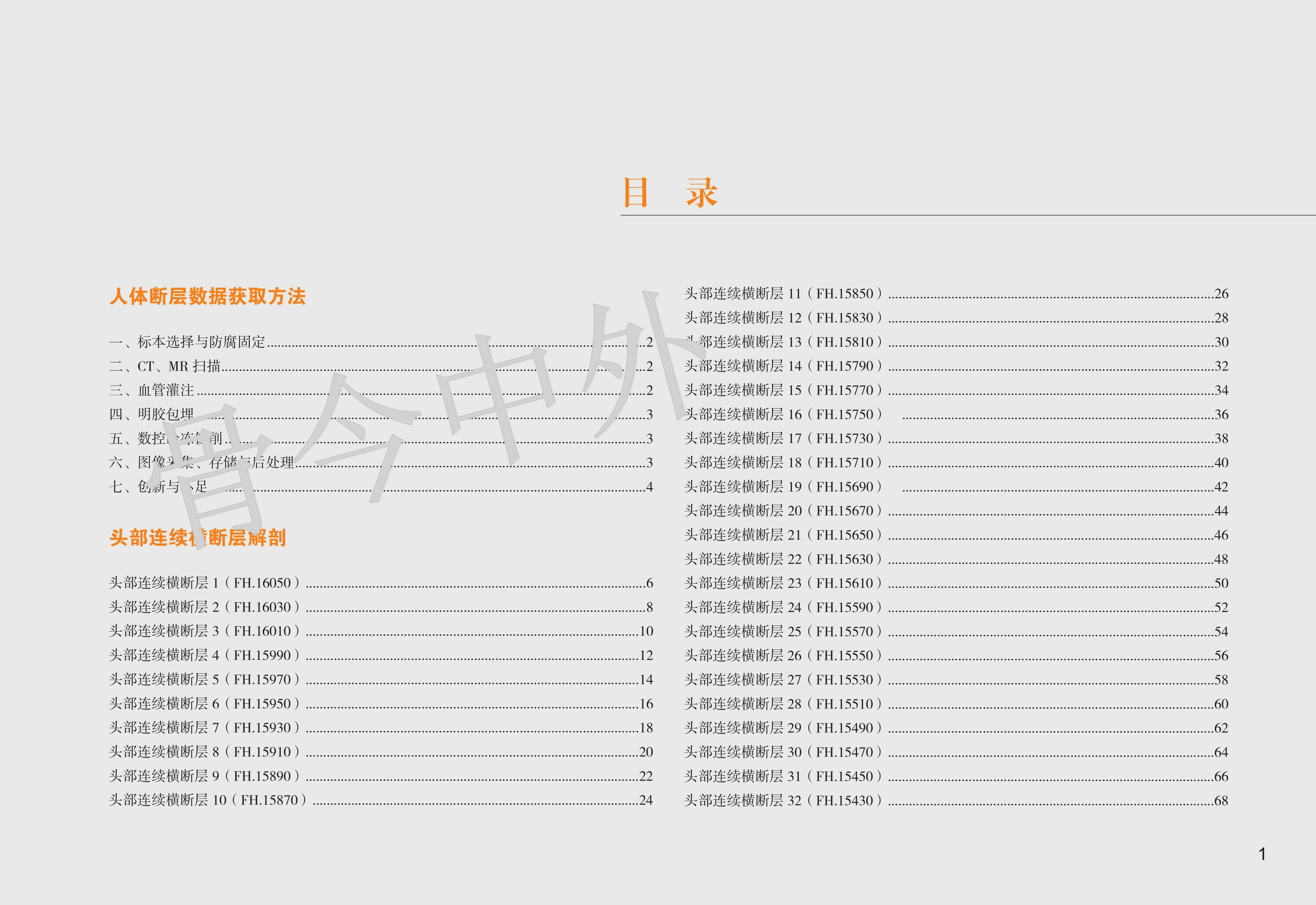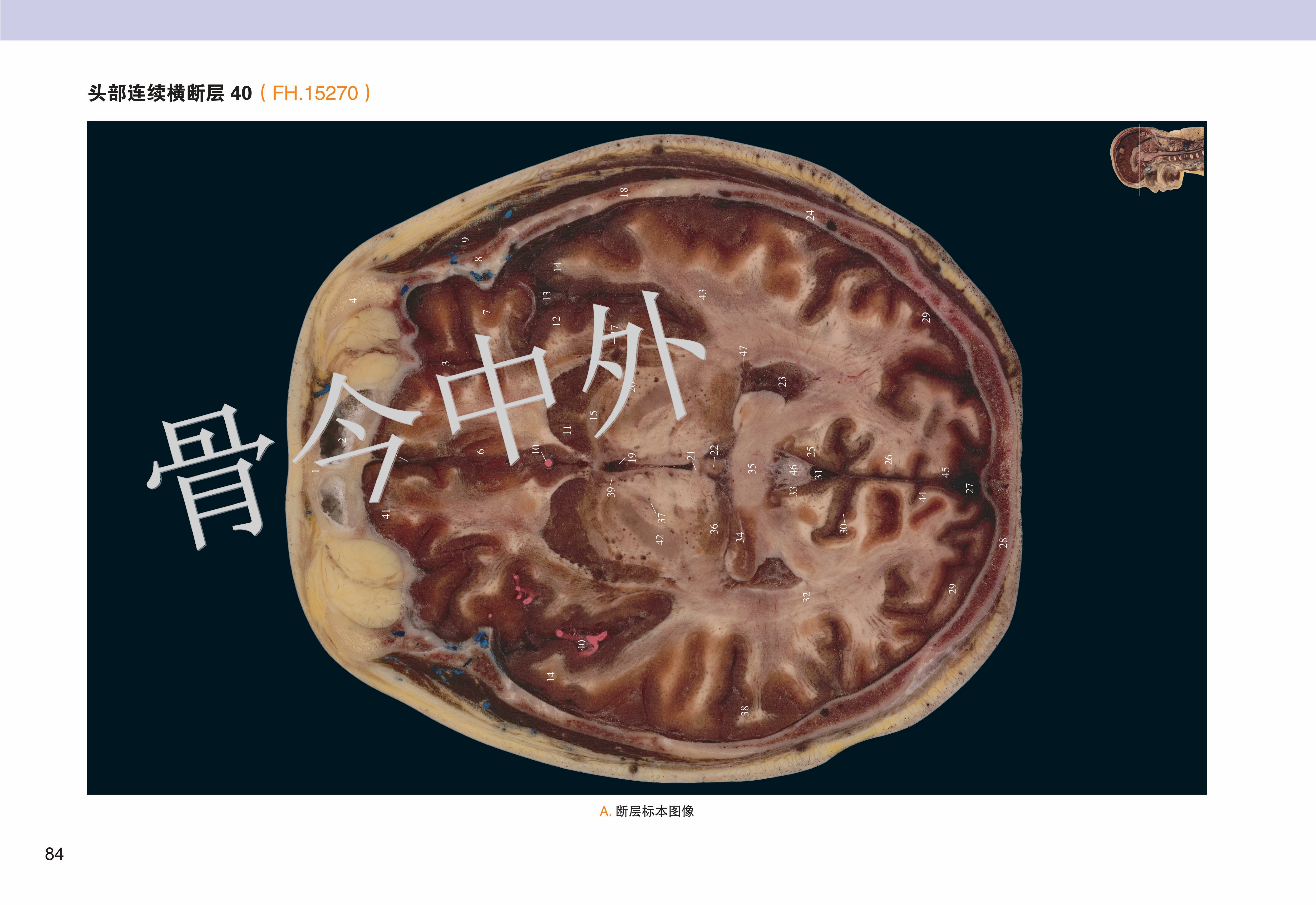《数字人连续横断层彩色解剖学图谱·头颈部分册》包括三篇:第一篇简述了人体断层数据获取方法,第二、三篇分别介绍了头部和颈部的薄层连续横断层解剖及 CT、MR 图像。本例头部标本共有 101 层,由上而下可分为 6 段。 第1段,16050 ~ 15570 层面,共 25 层,胼胝体尚未出现,主要的解剖结构有头皮、颅顶骨、蛛网膜粒、上矢状窦与大脑上静脉、大脑镰、大脑额叶与顶叶;第 2 段,15550 ~ 15270 层面,共 15 层,以胼胝体出现为标志,主要表现为颞肌、脑颅骨、胼胝体、侧脑室、大脑主要沟回、基底核区与间脑、大脑前动脉、大脑中动脉和大脑外侧窝池;第 3 段,15250 ~ 15090 层面,共 9 层,从前后连合层面至垂体出现层面,主要出现枕额肌与颞肌、脑颅骨、大脑半球(颞叶、枕叶与边缘叶)、上丘脑与后丘脑、中脑、脑桥、第 1 4 脑神经、脑血管(大脑前、中、后动脉)、小脑幕、蝶鞍区和视器;第 4 段,15070 14730 层面,共 18 层,从垂体出现至寰枕关节层面,由前向后,主要出现眶下部、鼻腔与鼻旁窦、蝶鞍区与颅中窝(第 5 12 对脑神经、脑血管、海绵窦、垂体、大脑颞叶与枕叶)、颞骨岩部和颅后窝(脑桥、延髓、小脑),其间充填以颌面筋膜间隙;第 5 段,14710 ~ 14390 层面,共 17 层,从寰枕关节至下牙槽出现层面,主要出现口腔(重点为舌)、腮腺咬肌区和枕骨大孔区(重点为小脑扁桃体、颈静脉孔区和脑血管);第 6 段,14370 ~ 14050 层面,共 17 层,从下牙槽出现至下颌骨消失层面,主要出现下颌骨、口底结构(舌、三大唾液腺)、颈动脉鞘、颈外动脉及其分支和淋巴结。颈部上方从枕骨大孔平面开始,下方至胸骨颈静脉切迹平面结束,共有 82 层,由上而下,可分为 4 段。第1段,10500 ~ 10020 层面,共 25 层,从枕骨大孔平面至舌骨大角平面,断面前份为颌面部结构,后份为脊柱区颈段,两侧为颈动脉鞘;第2段,10000 ~ 9430层面,共 30 层,从舌骨大角平面至环状软骨下缘平面,颈部断面可明显地区分为四个格,即前份的内脏格(咽、喉、甲状腺侧叶和甲状旁腺)、两侧的血管神经格(颈动脉鞘)和后份的支持格(脊柱区颈段);第3段,9420 ~ 9330 层面,共 10 层,从环状软骨下缘平面至第 1 胸椎体上缘平面,内脏格表现为气管、食管、甲状腺和甲状旁腺,血管神经格和支持格同上;第4段,9320 ~ 9160 层面,共 17 层,从第 1 胸椎体上缘平面至胸骨颈静脉切迹平面,主要为颈根部,重点关注斜角肌间隙、星状神经节、胸膜顶和肺尖等。