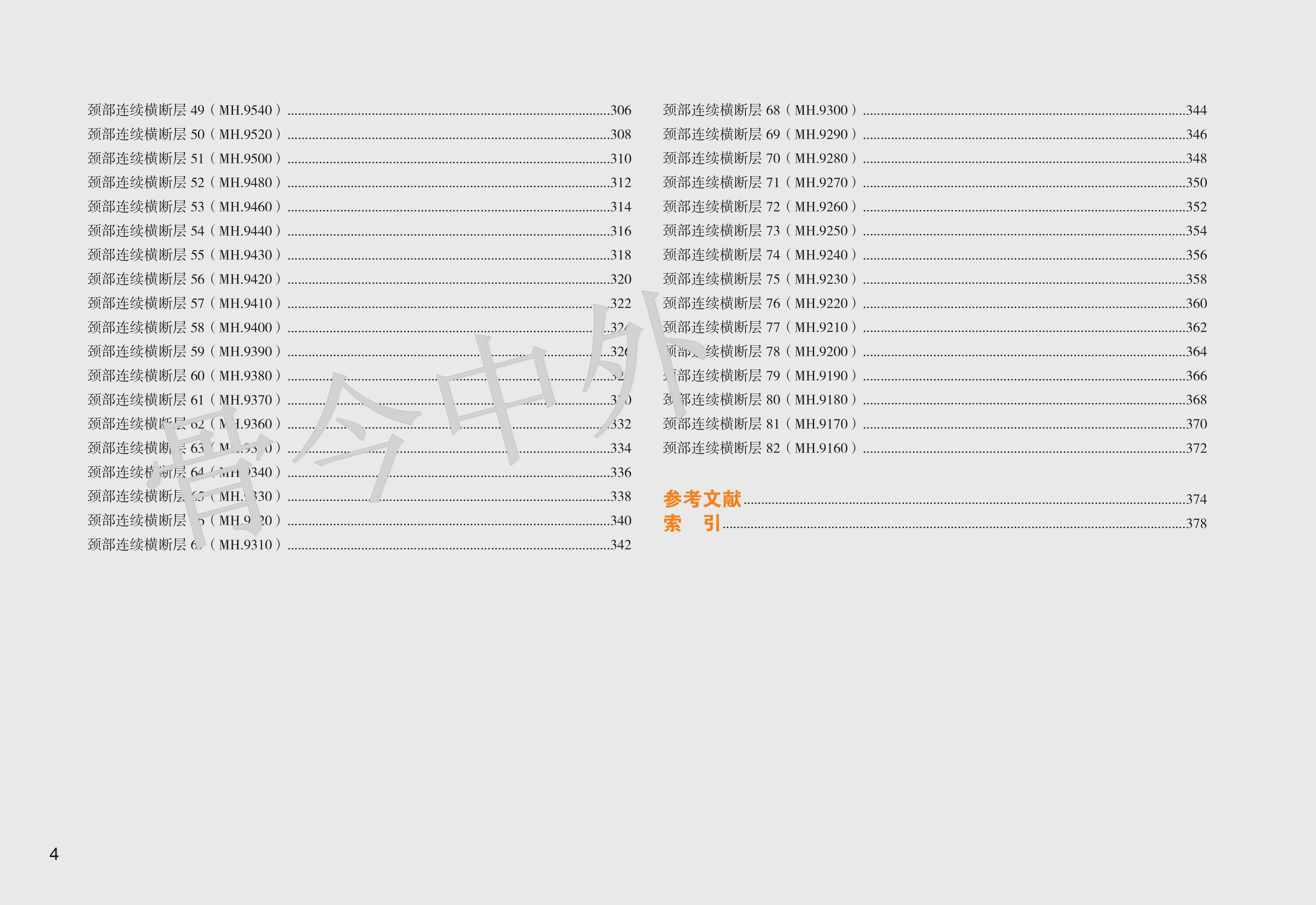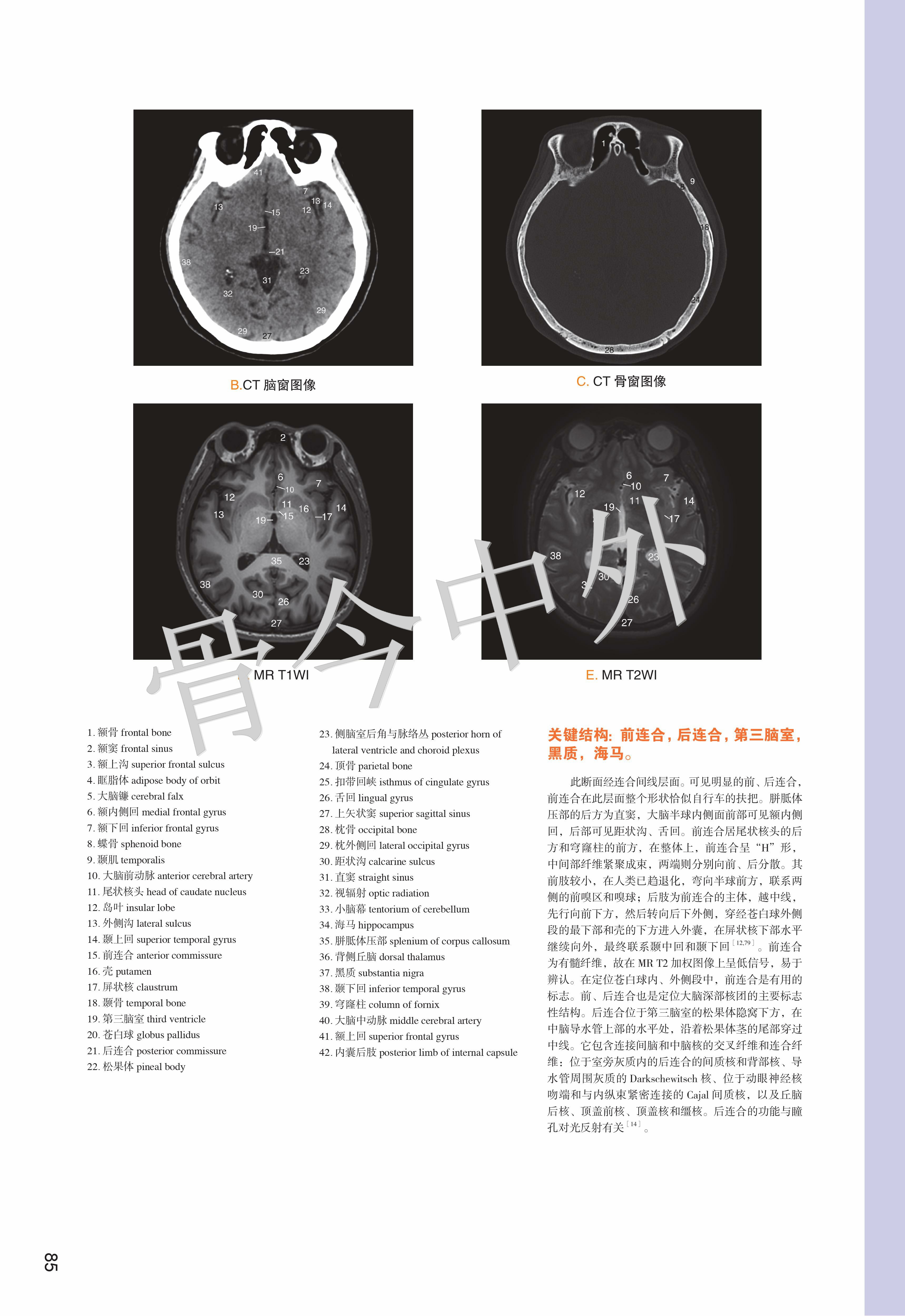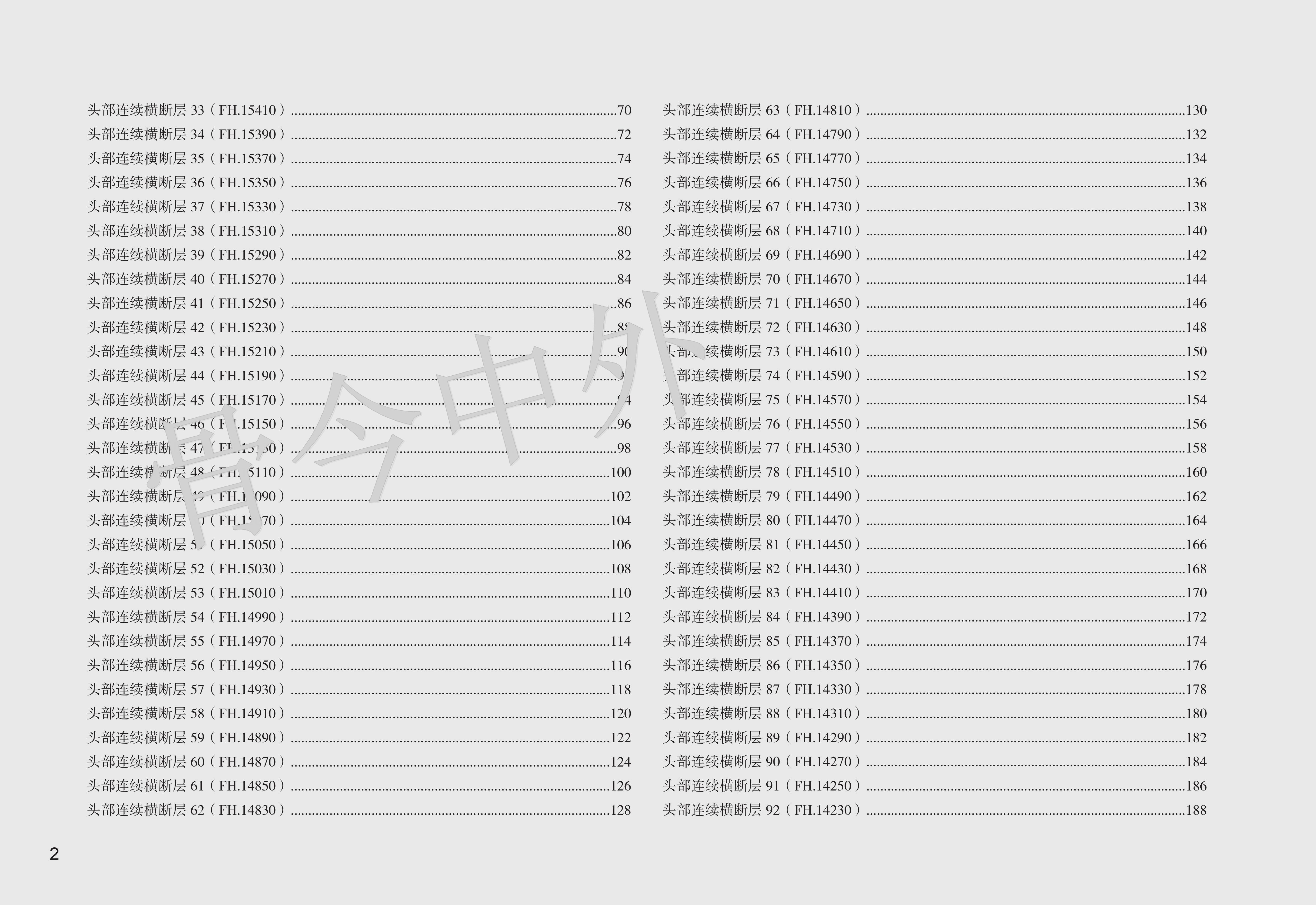 《数字人连续横断层彩色解剖学图谱·头颈部分册》包括三篇:第一篇简述了人体断层数据获取方法,第二、三篇分别介绍了头部和颈部的薄层连续横断层解剖及 CT、MR 图像。本例头部标本共有 101 层,由上而下可分为 6 段。 第1段,16050 ~ 15570 层面,共 25 层,胼胝体尚未出现,主要的解剖结构有头皮、颅顶骨、蛛网膜粒、上矢状窦与大脑上静脉、大脑镰、大脑额叶与顶叶;第 2 段,15550 ~ 15270 层面,共 15 层,以胼胝体出现为标志,主要表现为颞肌、脑颅骨、胼胝体、侧脑室、大脑主要沟回、基底核区与间脑、大脑前动脉、大脑中动脉和大脑外侧窝池;第 3 段,15250 ~ 15090 层面,共 9 层,从前后连合层面至垂体出现层面,主要出现枕额肌与颞肌、脑颅骨、大脑半球(颞叶、枕叶与边缘叶)、上丘脑与后丘脑、中脑、脑桥、第 1 4 脑神经、脑血管(大脑前、中、后动脉)、小脑幕、蝶鞍区和视器;第 4 段,15070 14730 层面,共 18 层,从垂体出现至寰枕关节层面,由前向后,主要出现眶下部、鼻腔与鼻旁窦、蝶鞍区与颅中窝(第 5 12 对脑神经、脑血管、海绵窦、垂体、大脑颞叶与枕叶)、颞骨岩部和颅后窝(脑桥、延髓、小脑),其间充填以颌面筋膜间隙;第 5 段,14710 ~ 14390 层面,共 17 层,从寰枕关节至下牙槽出现层面,主要出现口腔(重点为舌)、腮腺咬肌区和枕骨大孔区(重点为小脑扁桃体、颈静脉孔区和脑血管);第 6 段,14370 ~ 14050 层面,共 17 层,从下牙槽出现至下颌骨消失层面,主要出现下颌骨、口底结构(舌、三大唾液腺)、颈动脉鞘、颈外动脉及其分支和淋巴结。颈部上方从枕骨大孔平面开始,下方至胸骨颈静脉切迹平面结束,共有 82 层,由上而下,可分为 4 段。第1段,10500 ~ 10020 层面,共 25 层,从枕骨大孔平面至舌骨大角平面,断面前份为颌面部结构,后份为脊柱区颈段,两侧为颈动脉鞘;第2段,10000 ~ 9430层面,共 30 层,从舌骨大角平面至环状软骨下缘平面,颈部断面可明显地区分为四个格,即前份的内脏格(咽、喉、甲状腺侧叶和甲状旁腺)、两侧的血管神经格(颈动脉鞘)和后份的支持格(脊柱区颈段);第3段,9420 ~ 9330 层面,共 10 层,从环状软骨下缘平面至第 1 胸椎体上缘平面,内脏格表现为气管、食管、甲状腺和甲状旁腺,血管神经格和支持格同上;第4段,9320 ~ 9160 层面,共 17 层,从第 1 胸椎体上缘平面至胸骨颈静脉切迹平面,主要为颈根部,重点关注斜角肌间隙、星状神经节、胸膜顶和肺尖等。