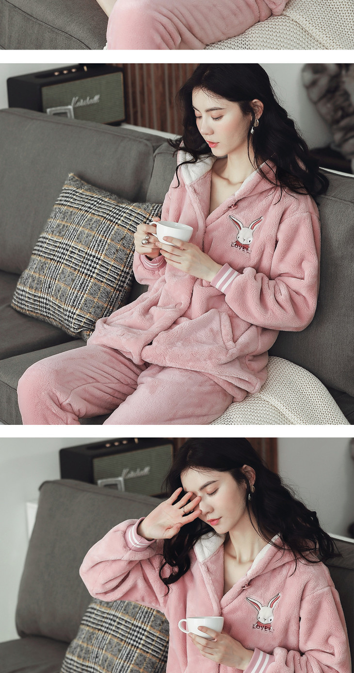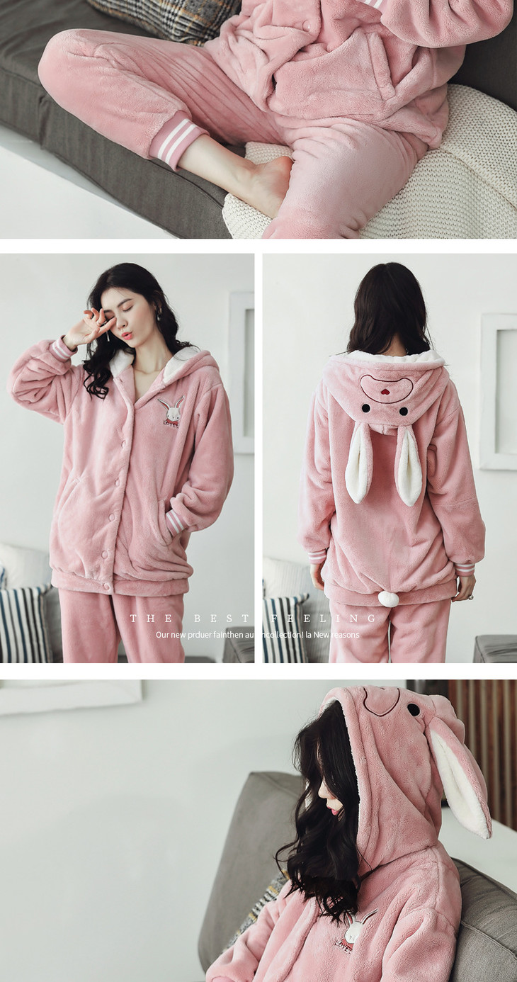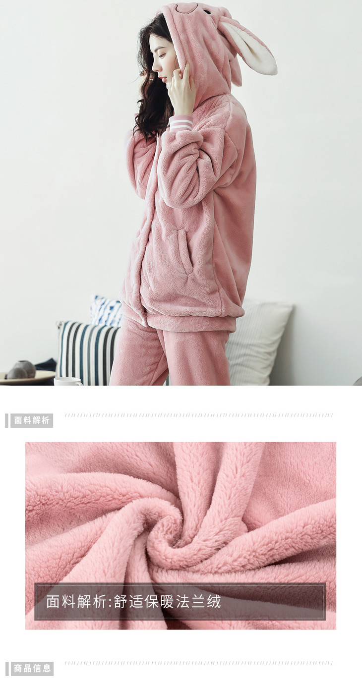 【睡衣女】*睡衣女秋冬季法兰绒套装 活泼可爱小兔子连帽女士家居服套装