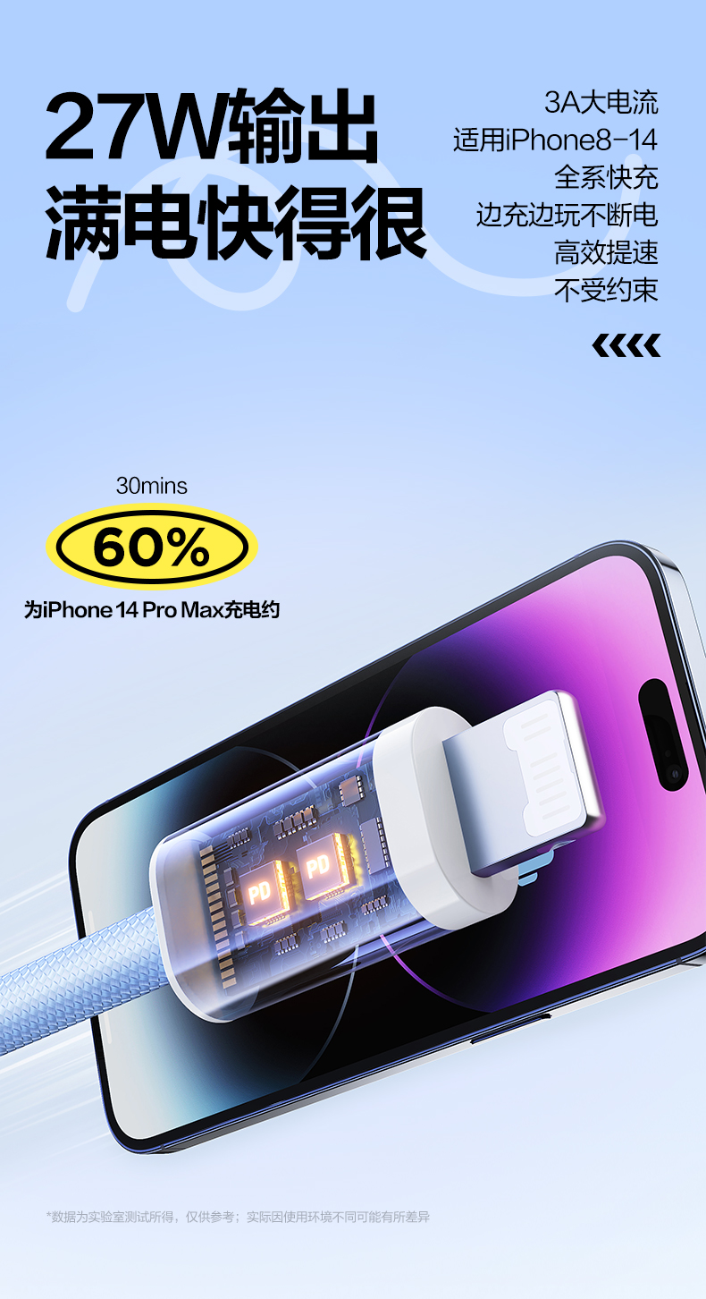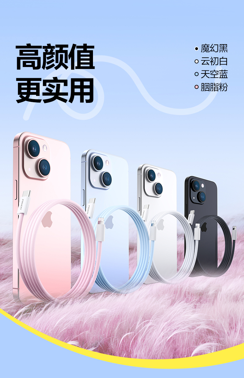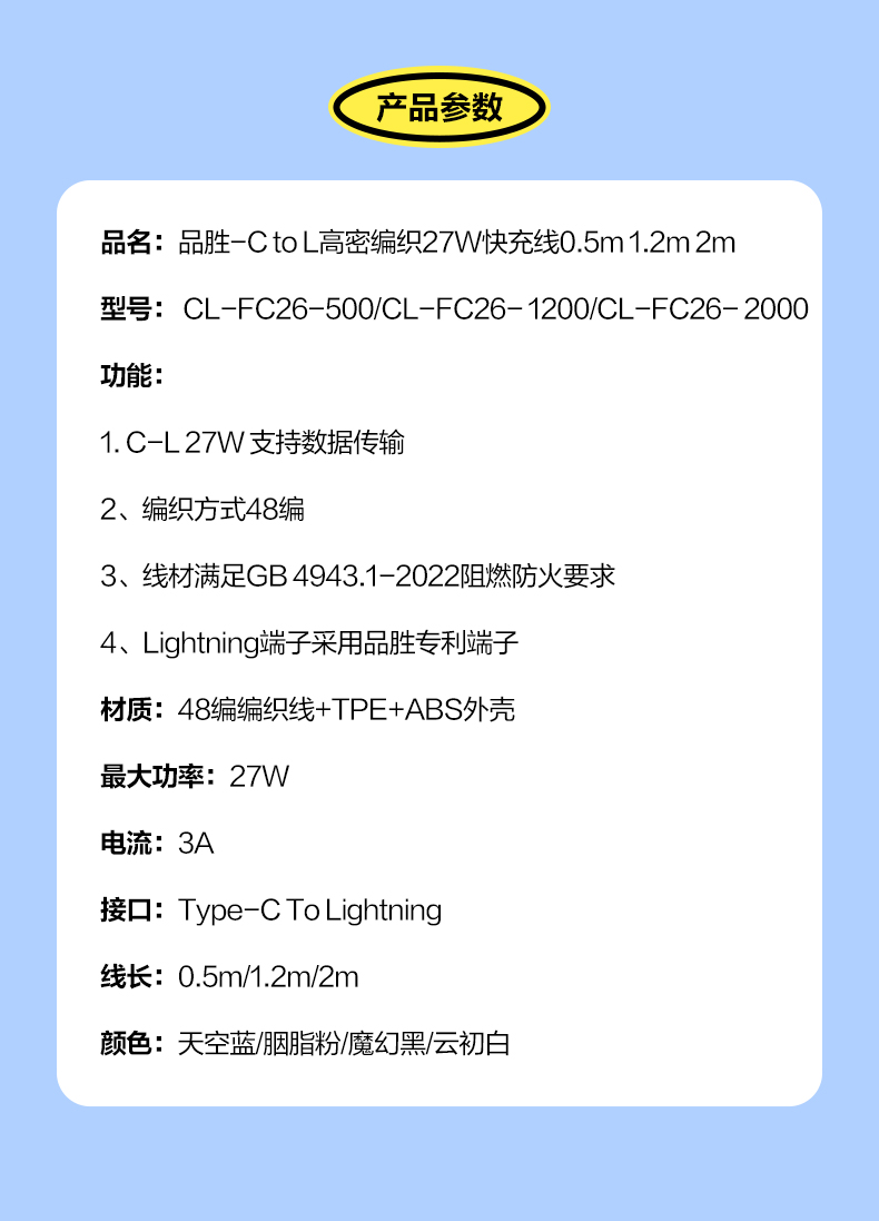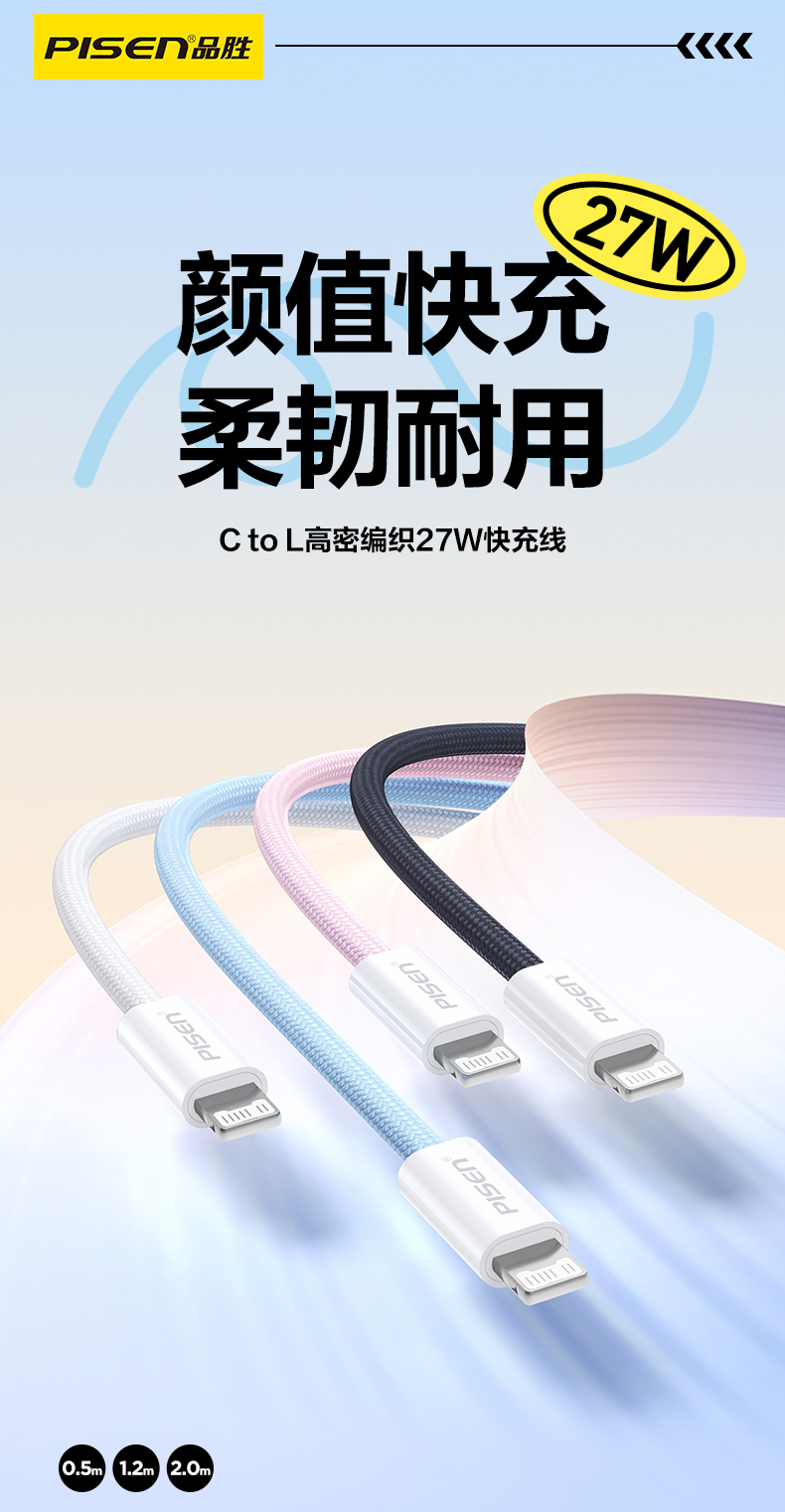 品胜 C to L高密编织27W快充线1.2米/2米 支持数据线传输苹果8-14设备充电