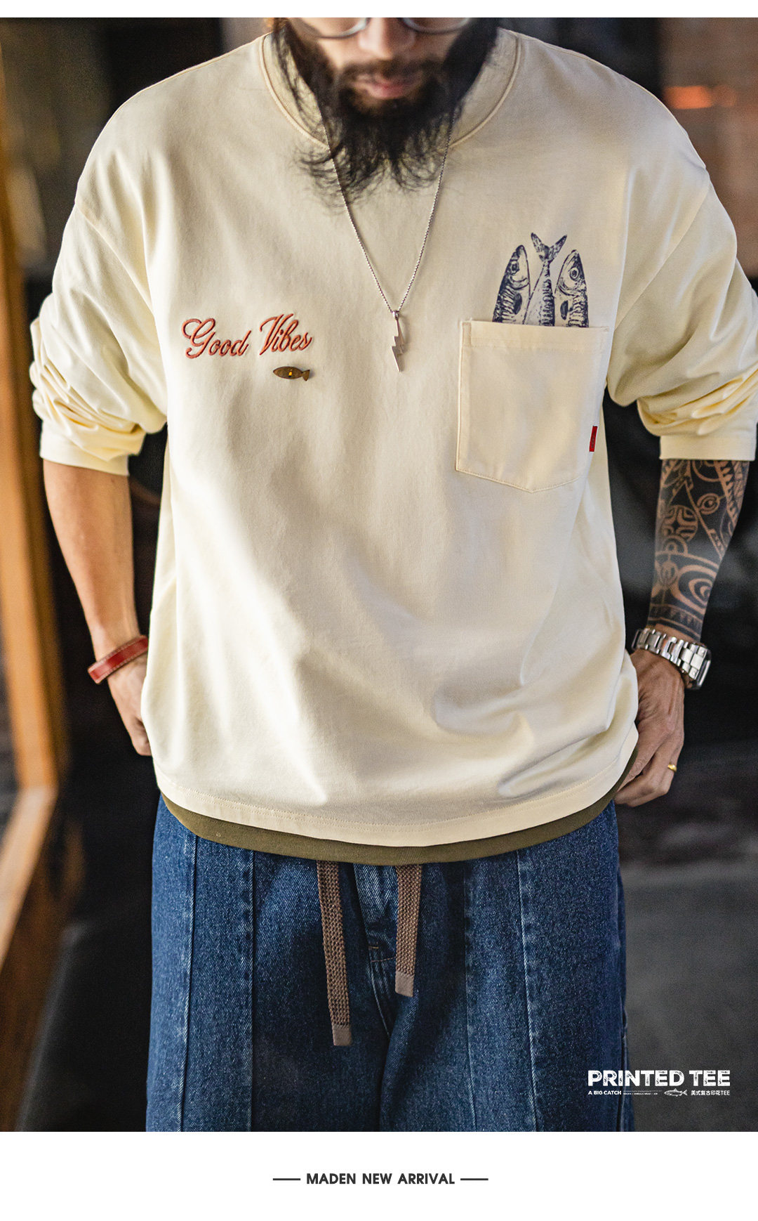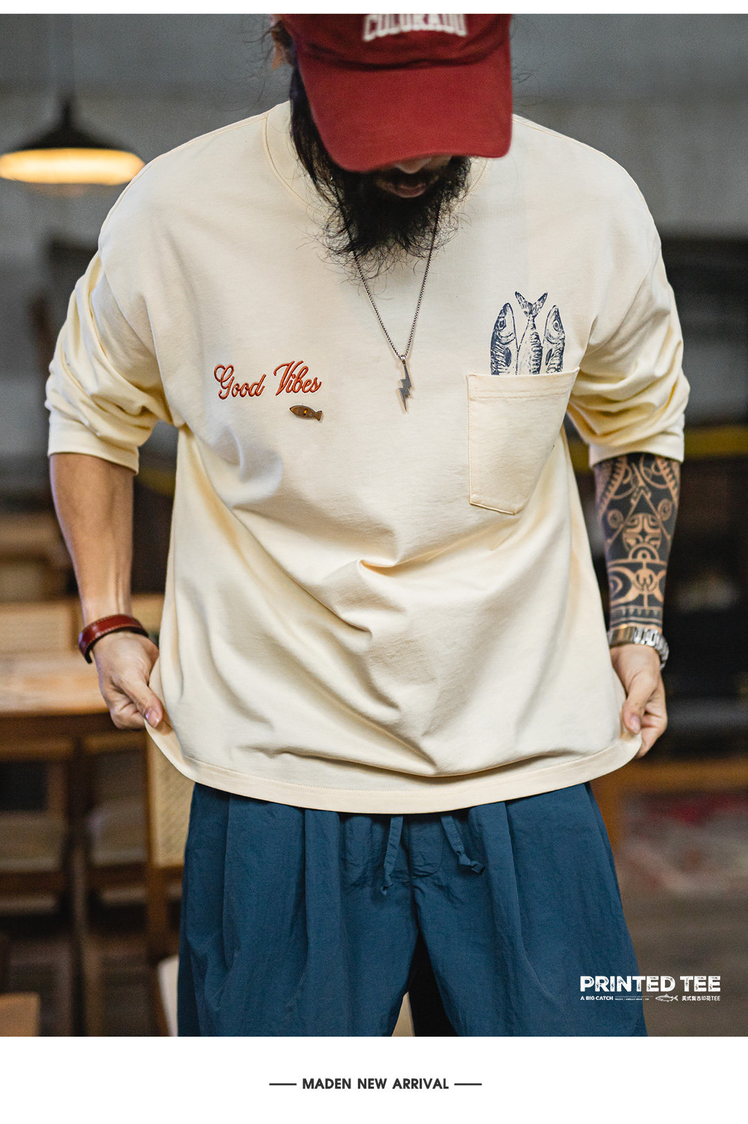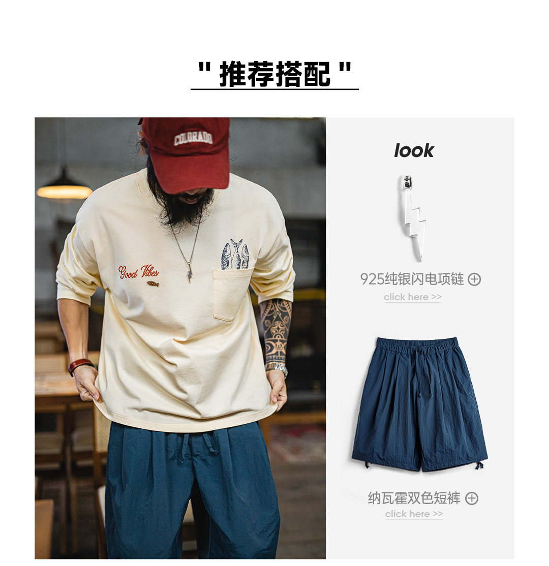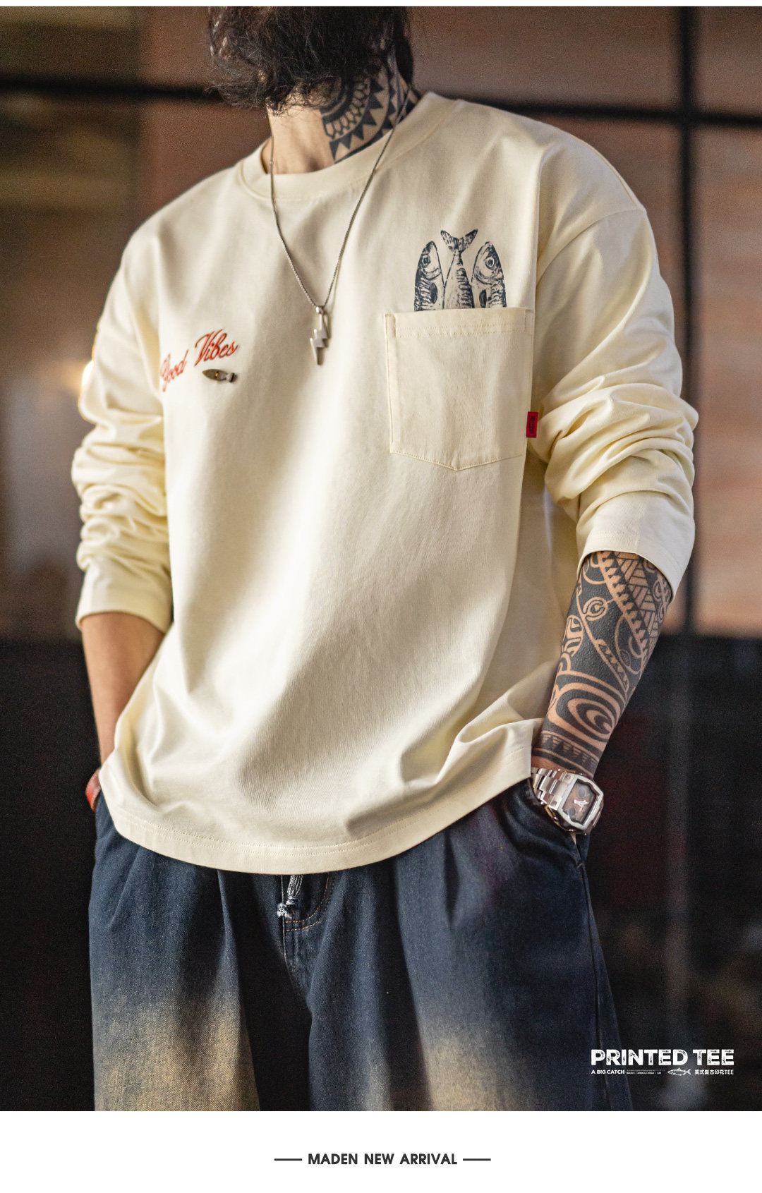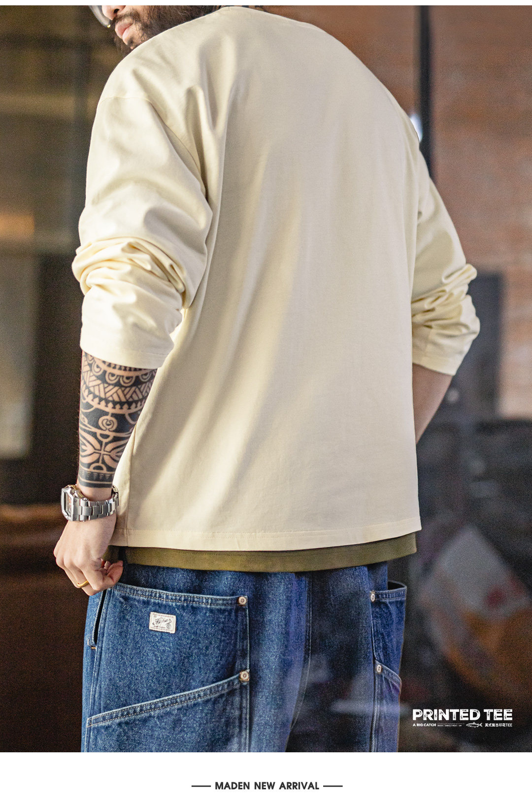 马登工装美式印花口袋长袖T恤纯全棉舒适圆领打底内搭体恤男款春