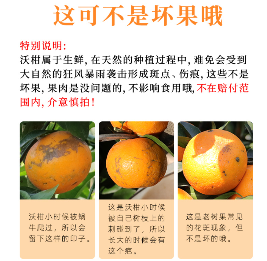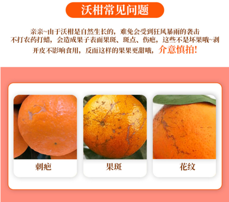 品名:千野蜜柑(沃柑)规格1:4.5斤大果彩箱 注:4.5斤中果彩箱约10-15个,果径60-70mm 4.5斤大果彩箱约8-15个,果径70-80mm 包装方式:彩箱 快递:中通 运费模板:北京、上海+1元;黑龙江、吉林、辽宁+3元;甘肃、青海、宁夏、新疆、西藏、内蒙古、港澳台不发 发货时效:48-72h 发货地/产地:云南 保质期:收到常温保存3-5天,冷藏保存5-7天 生产日期:现摘现发 销售售卖期:9月 周六周天、节假日除外,早上十点之前的订单是48小时发货 ,到货时间约为2-5天,请您耐心等待 。 |
