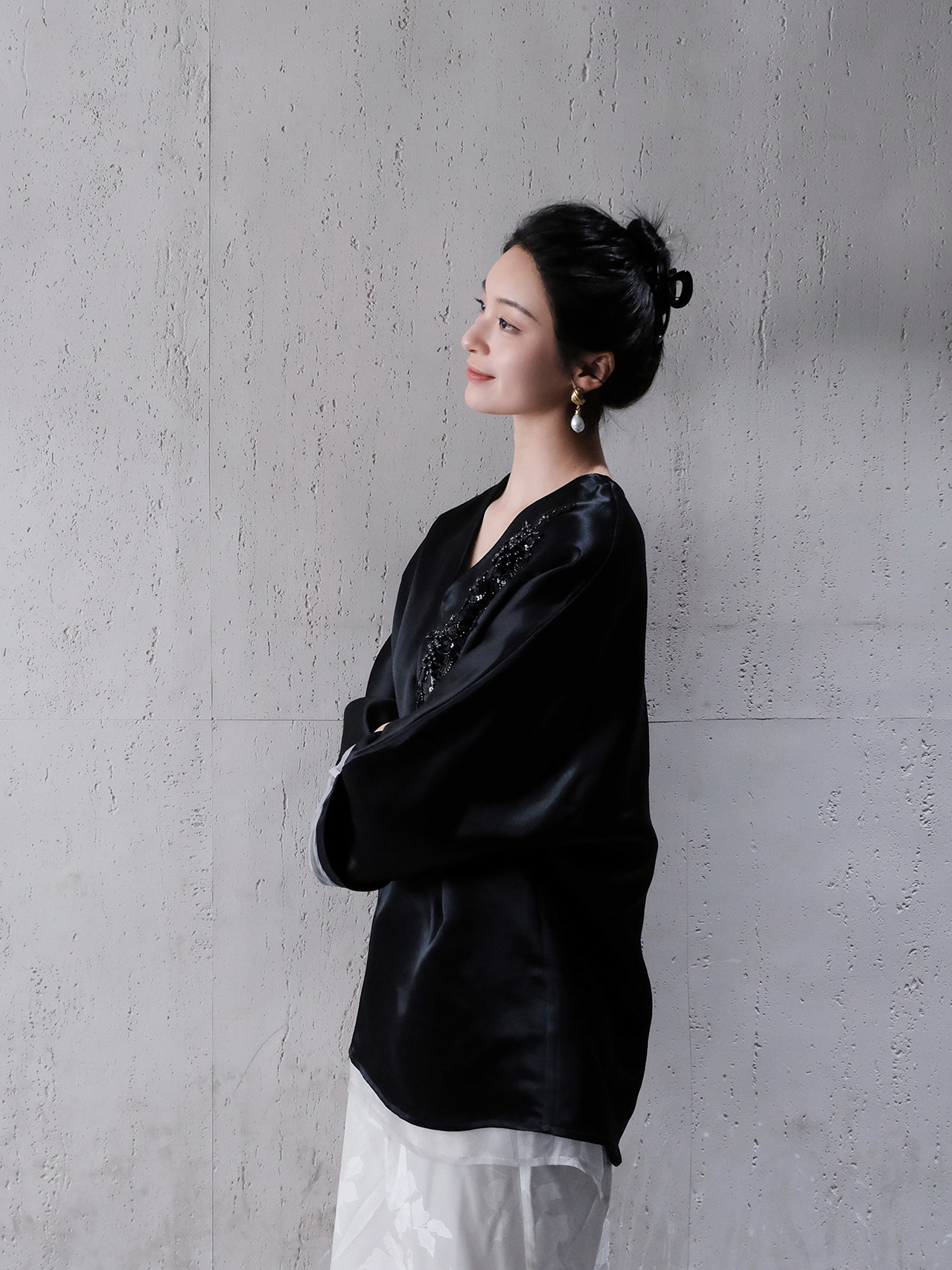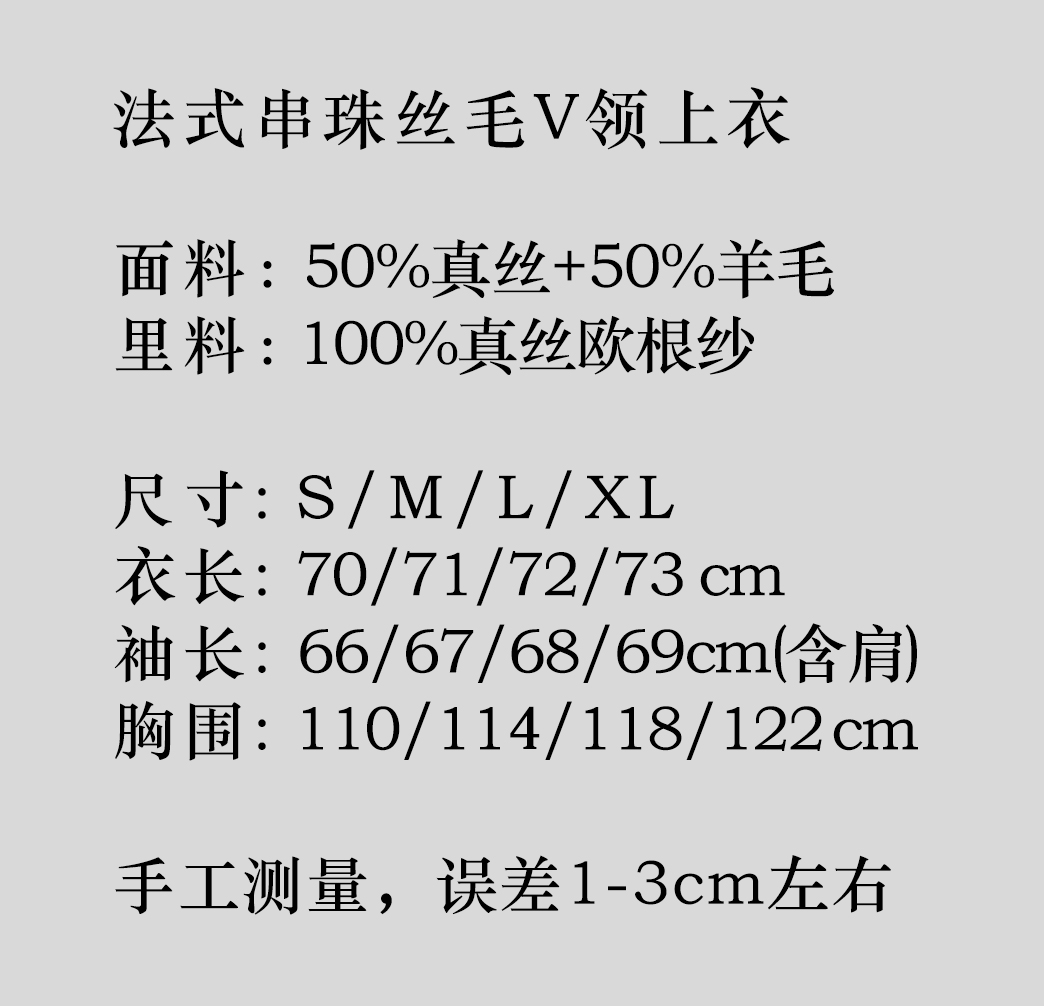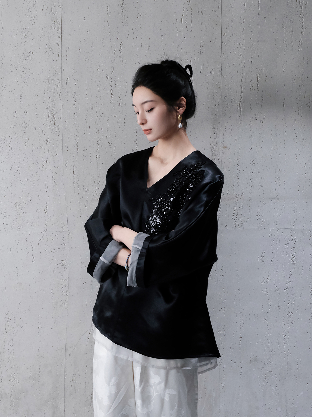 盛唐牡丹 | 法式串珠丝毛V领上衣-黑色