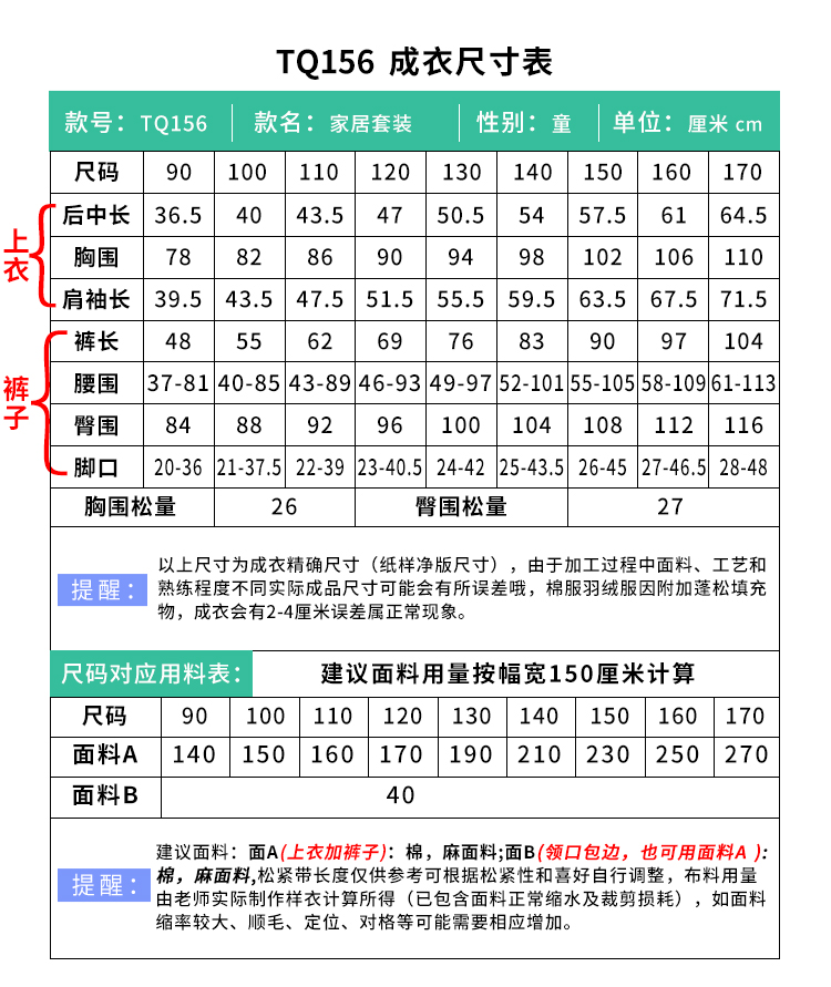 裁缝学苑TQ156家居服套装纸样儿童女童宝宝睡衣童装样板图纸