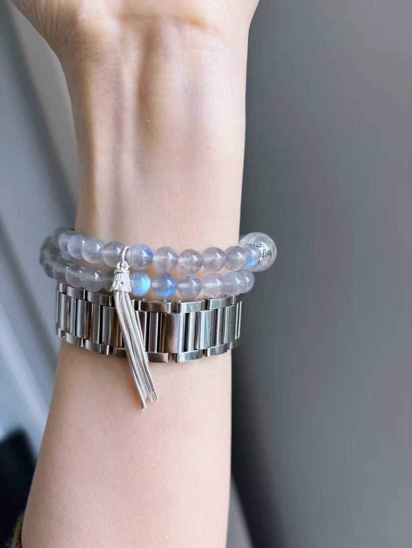 灰月光,又称"恋人之石",是拉长石家族的一个分支,属于长石家族。灰月光具有读特的光学效应,呈半透明状,底色通常为茹白色或无色。它的表面散发出如同朦胧月光般的光芒,申秘而梦幻。