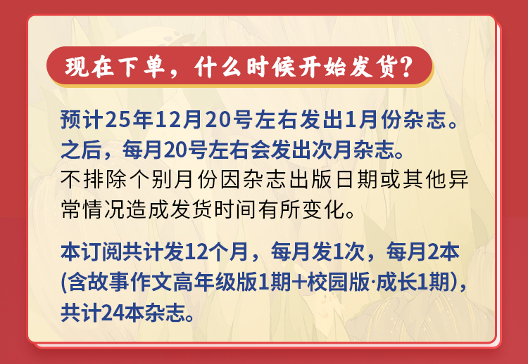 剩余月份的杂志,每月22号前发次月,举个例子,预计2025年12月22号前发2026年首期杂志(第1期)