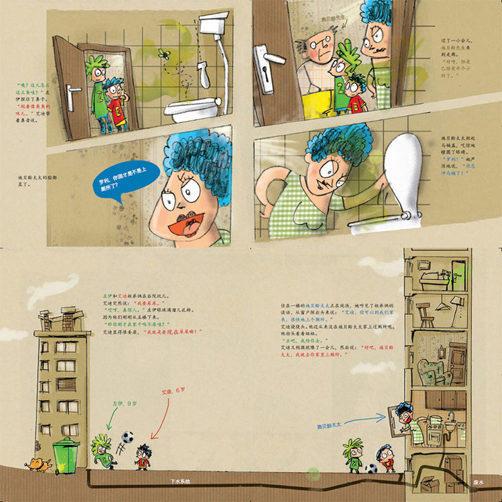 一段从厕所开始的旅程。艾迪和姐姐佐伊在楼下玩足球,艾迪突然想上厕所,可他们家住在六楼。住在一楼的施培灵夫人听见了姐弟俩的交谈,便热心地请他们到家里上厕所。可是厕所好臭啊,原来施培灵先生刚刚大便后忘了冲厕所。他不好意思地赶快冲了厕所,将自己的臭臭送上了旅程。可是,臭臭到底去了哪里?这是每个孩子都会问的问题。姐弟俩和施培灵先生一起,追踪着下水道系统来到污水处理厂。在那里,他们看到肮脏的废水一步一步被净化处理,重新成为干净的饮用水的过程。故事轻松幽默、大大方方,给孩子传递了重要的科普知识。