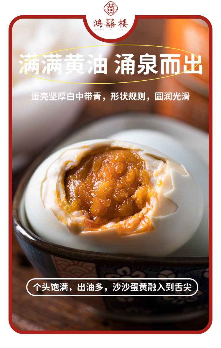 鸿喜楼海鸭蛋系列~爆油鲜香、高级新颖~高品质、纯天然、无添加,是厂家背后的用心~包装精美适合馈赠亲友拿得出手~吃到嘴里的香沙细腻,鲜香美味,一口喷香!