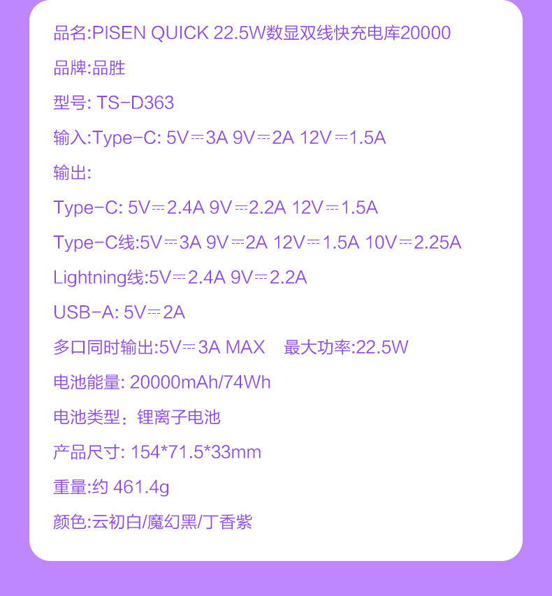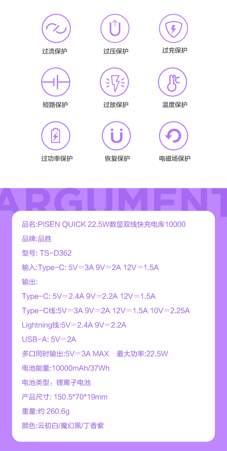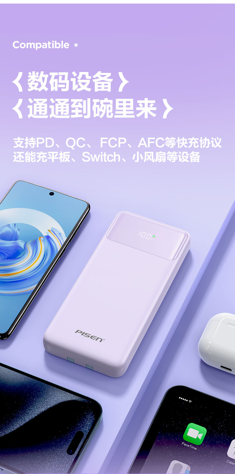 品胜 数显双线快充电库22.5W快充电宝 移动电源 10000/20000毫安支持苹果小米华为 充电宝