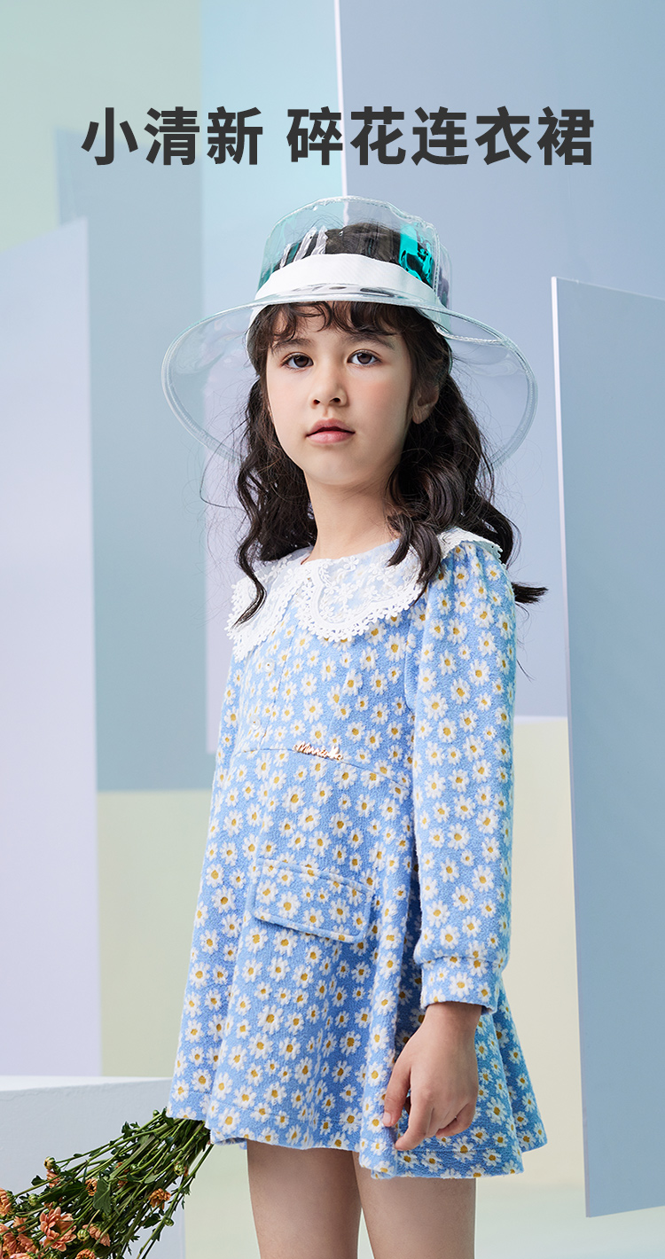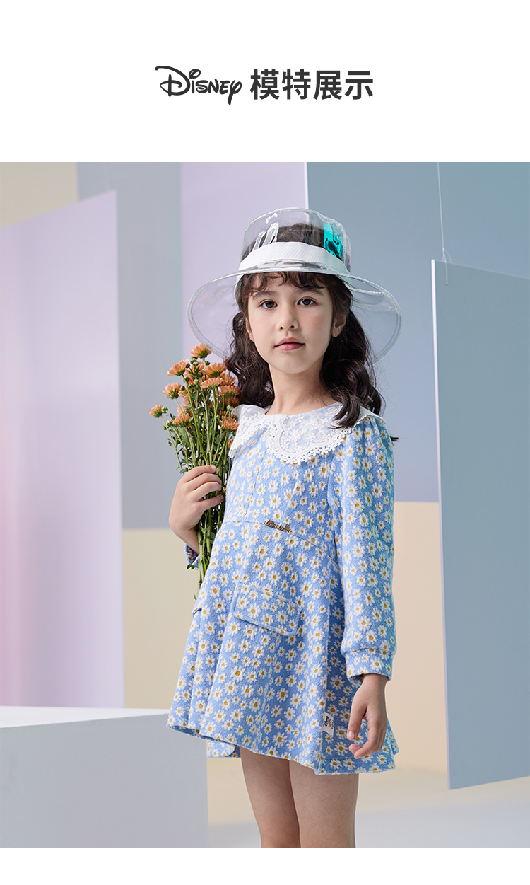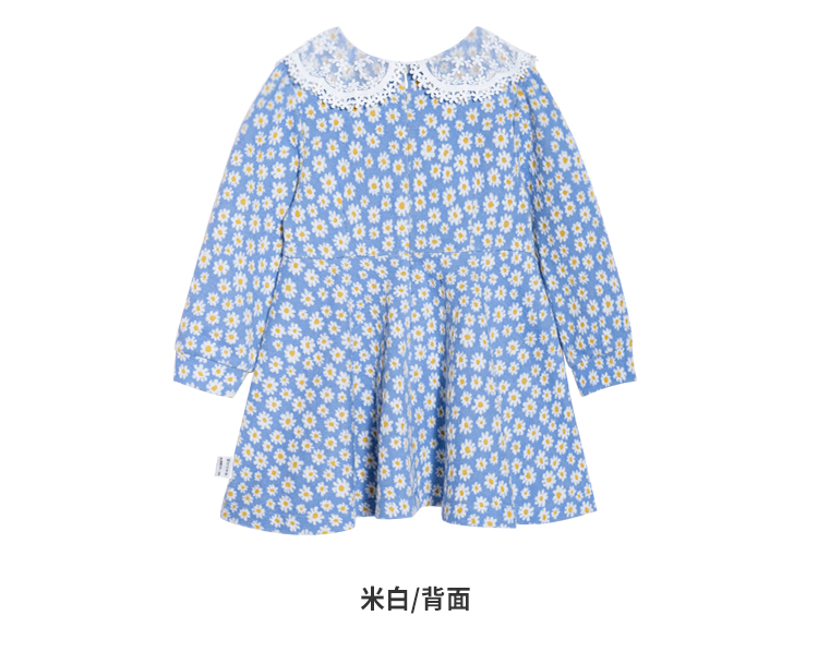 迪士尼童装女童小雏菊连衣裙中大童宝宝洋气针织布长袖裙子蕾丝领