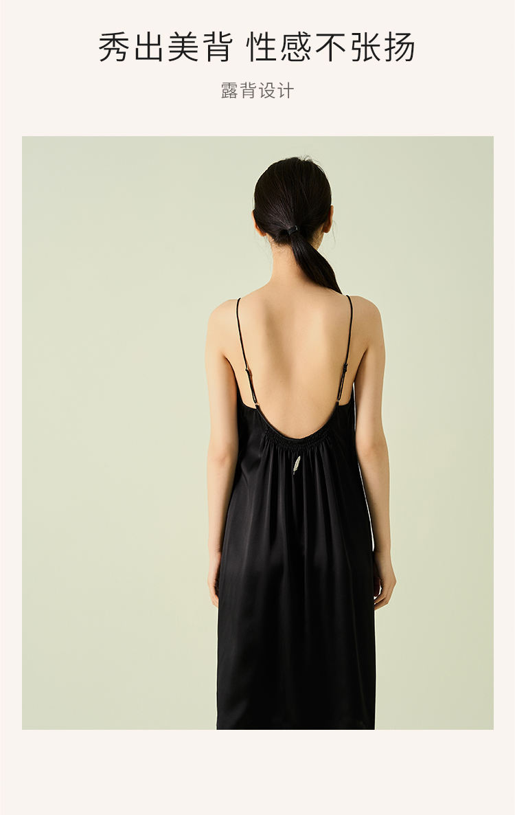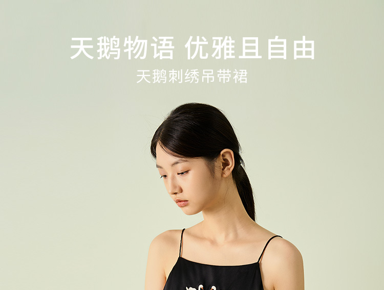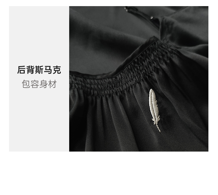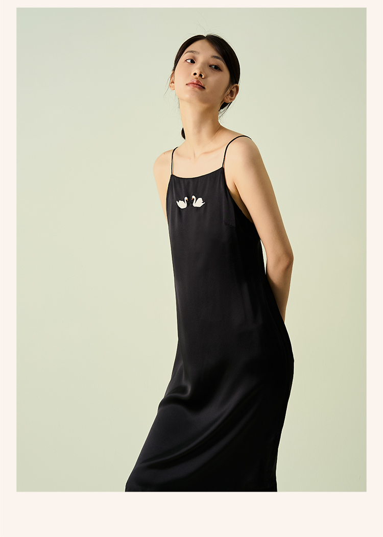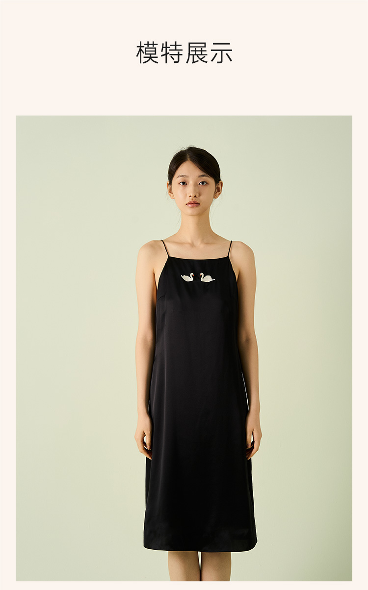桑罗天鹅刺绣真丝吊带裙黑色细肩带抹胸连衣裙收腰显瘦睡裙