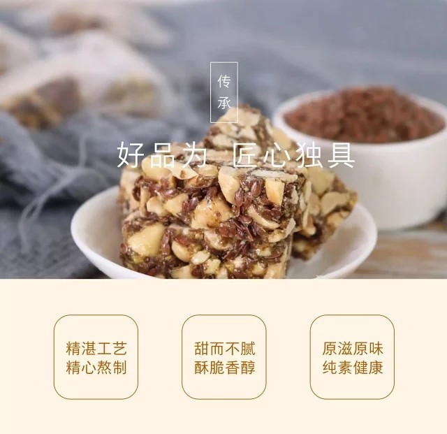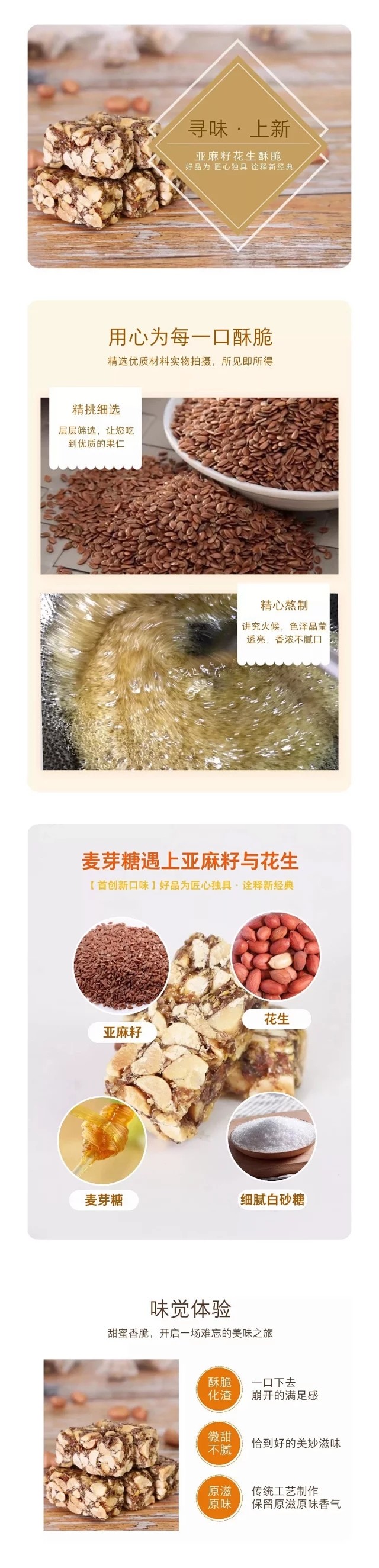 精心挑选亚麻籽,融合花生、麦芽糖、传统工艺制作,留住原滋原味香气… 用真实满足挑剔的你…