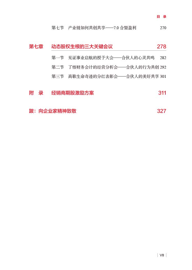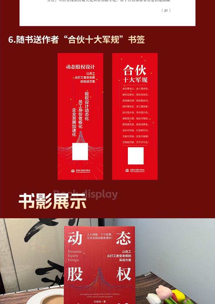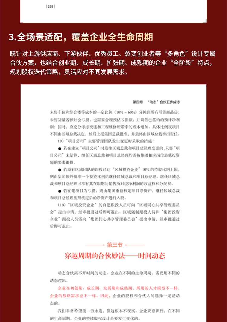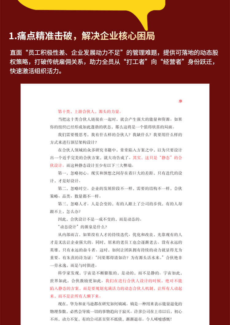 | 1.痛点精准击破,解决企业核心困局:直面;员工积极性差、企业发展动力不足的管理难题,提供可落地的动态股权策略,打破传统雇佣关系,助力全员从;打工者向;经营者身份跃迁,快速激活组织活力。2.创新模式引领,实现全员价值绑定:首创;全员动态合伙模式,让员工凭能力、业绩动态参与经营决策、共享成果,不局限于内部员工,更覆盖上游供应商、下游伙伴、裂变创业者,真正实现;人人为企业经营负责。 3.全场景适配,覆盖企业全生命周期:既针对上游供应商、下游伙伴、优秀员工、裂变创业者等;多角色设计专属合伙方案,也结合创业期、成长期、扩张期、成熟期的企业;全阶段特点,规划股权迭代策略,灵活应对不同发展需求。 4.实战干货满格,拿来即用零门槛:不止有前沿理论,更收录名企方案解读、一线咨询师打磨的实战案例及配套制度表单,无需复杂转化,创业者、管理者可直接落地应用,降低股权设计试错成本。 5.受众精准匹配,助力业绩持续增长:专为渴望激发团队活力的创业者、寻求组织变革的管理者打造,既是案头实用工具书,更是推动企业;人人主动经营、业绩稳步增长的核心助力。 |