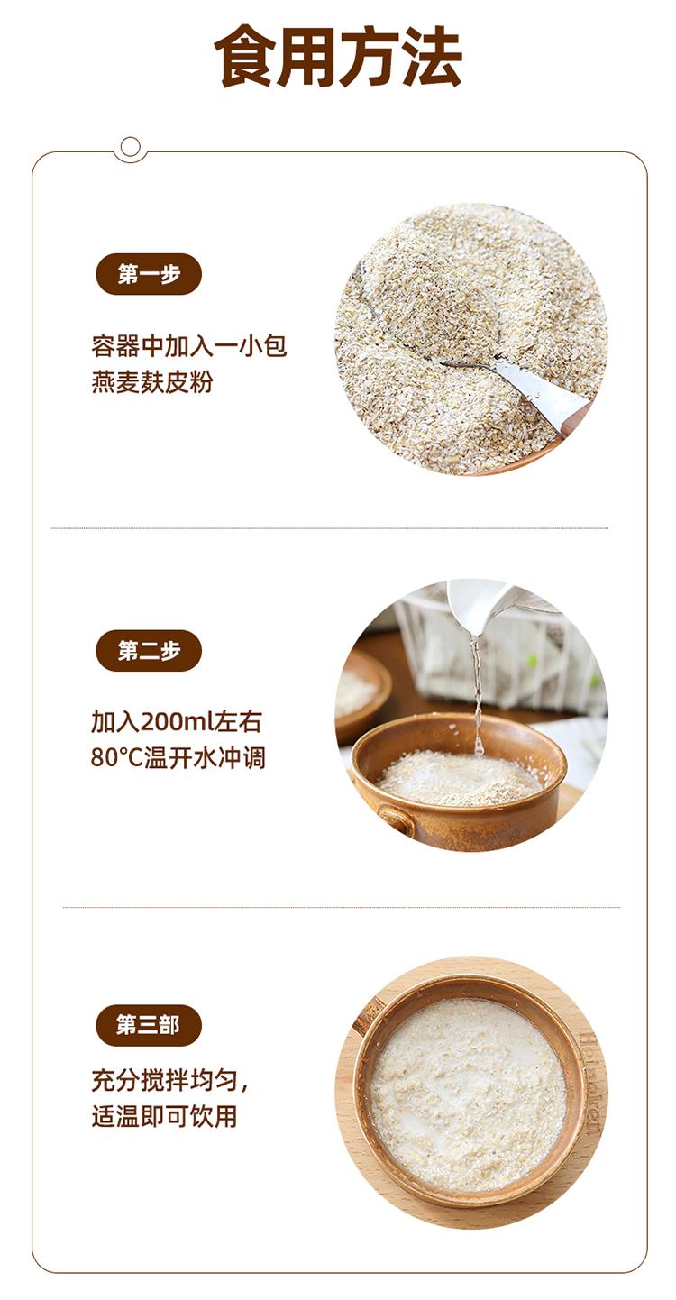 【食用方法】杯中放入一小包燕麦麸皮粉,加入200ml 左右80℃内的温开水冲调,充分搅拌均匀,适温即可饮用。