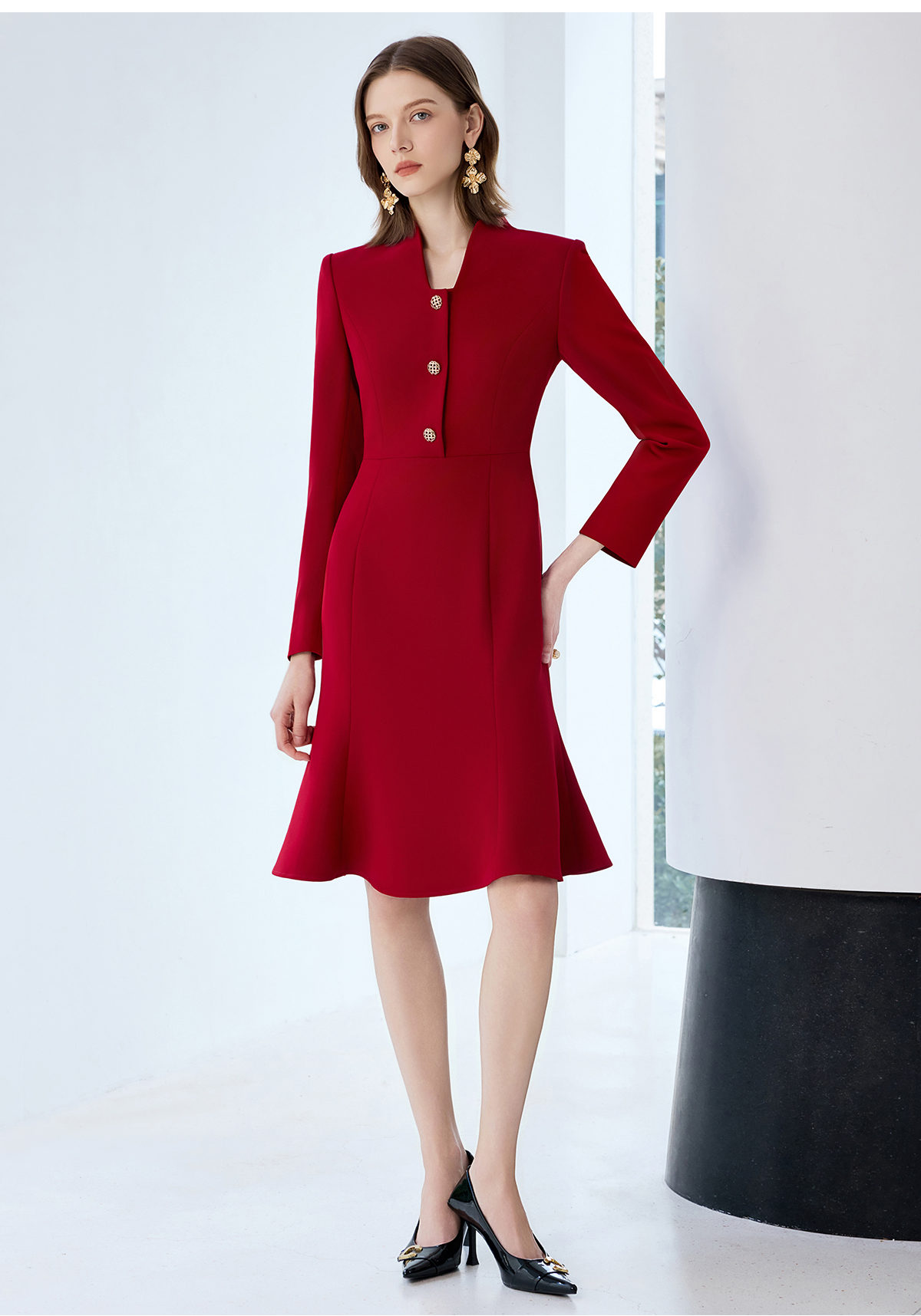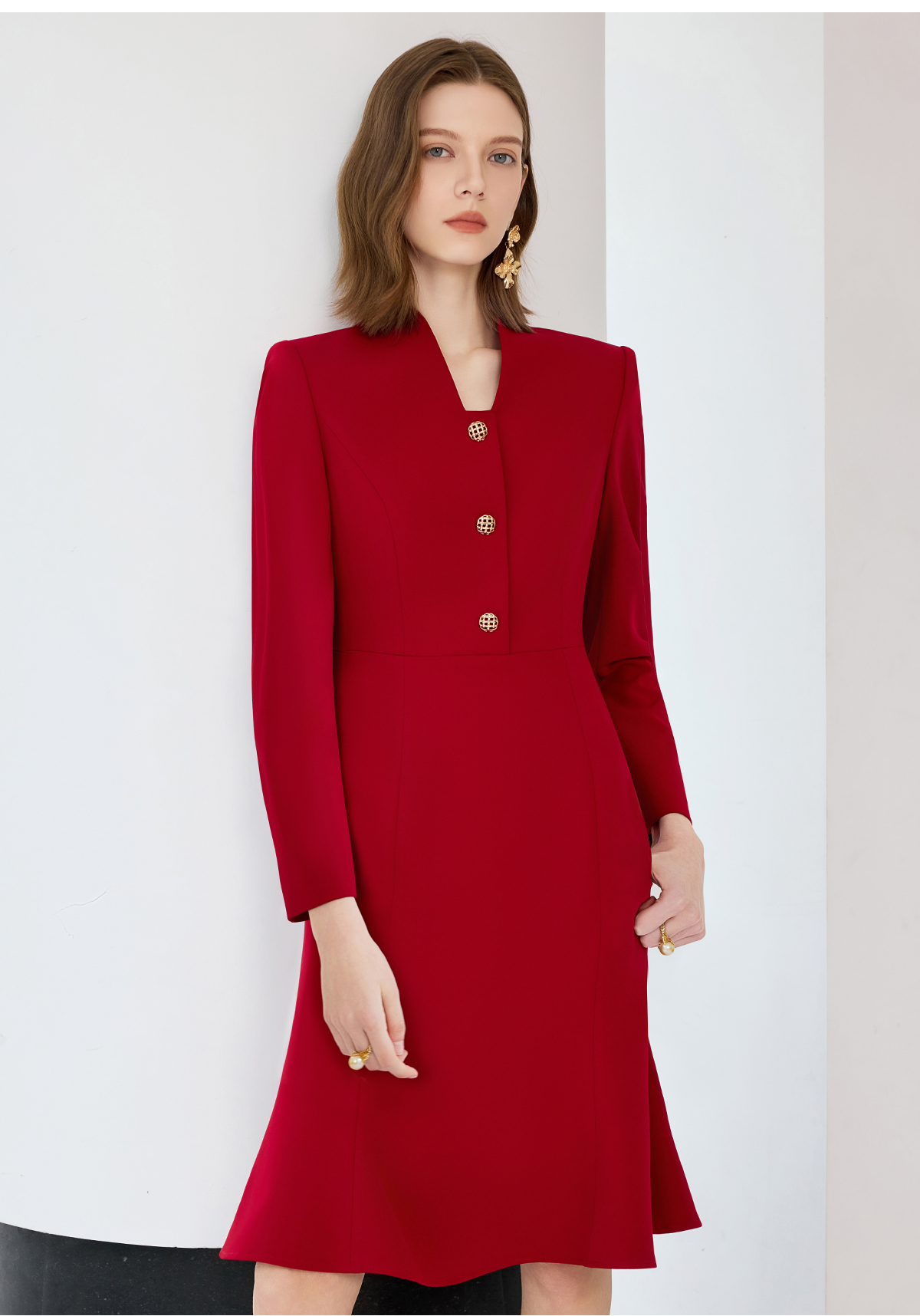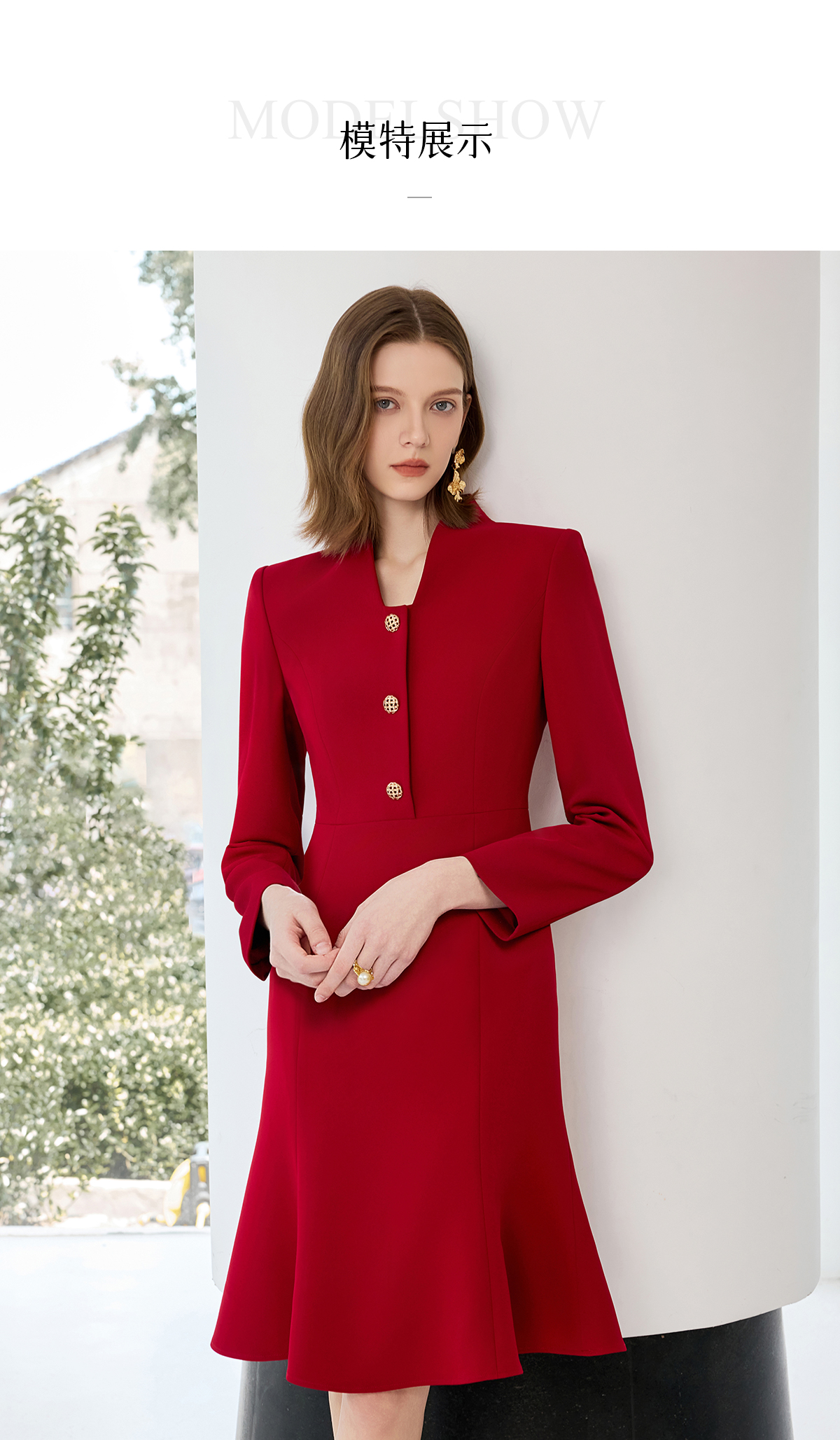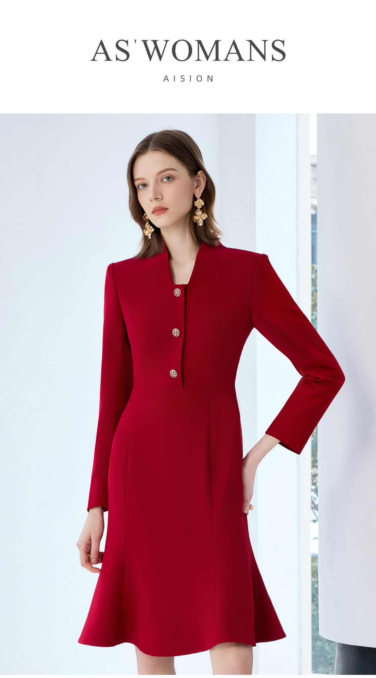 艾尚臣红色连衣裙女轻奢高级感轻熟风鱼尾裙通勤职业主持人西装裙