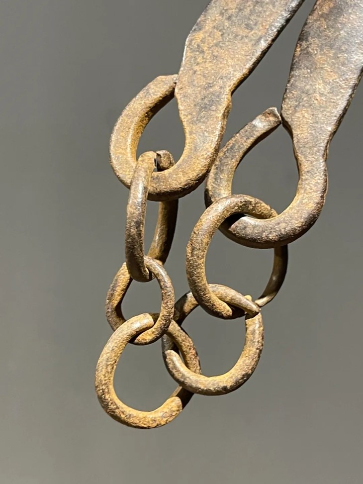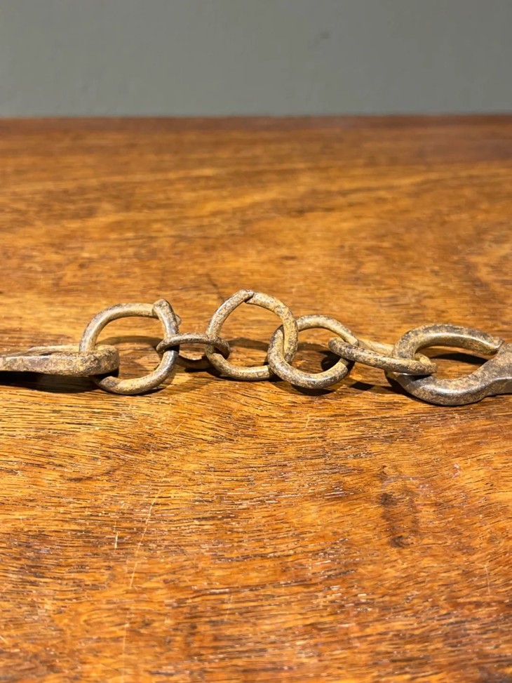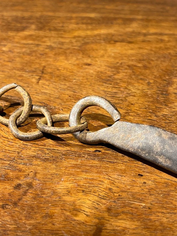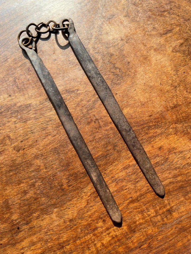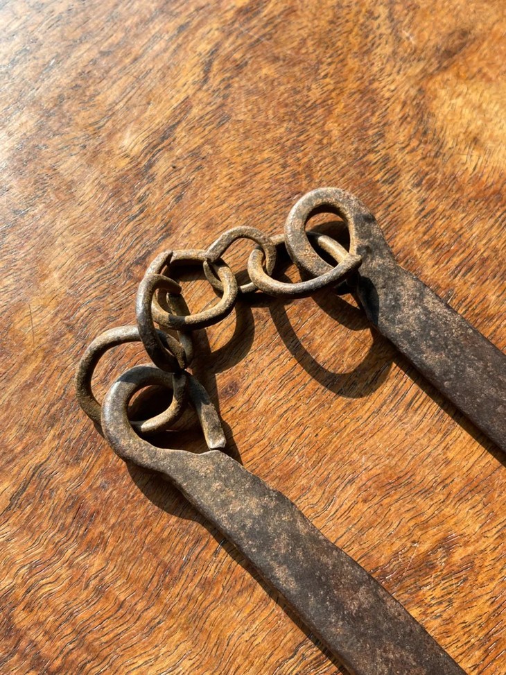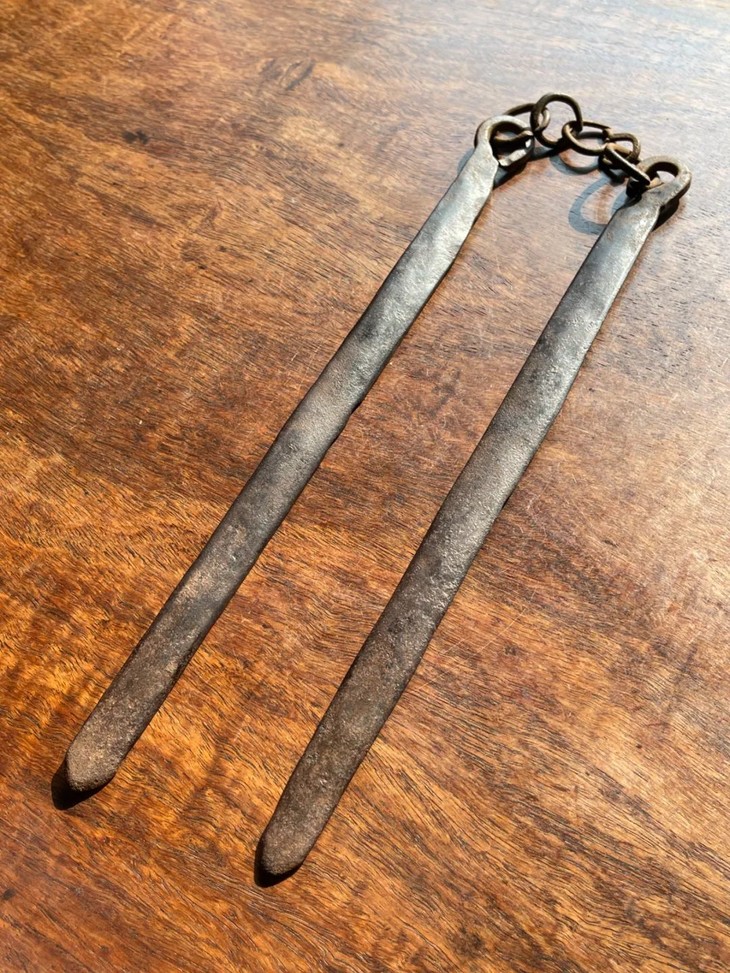 这是一件旧时代以炭火煮水泡茶时的炭火筷,以炭火炉及陶壶烧水泡茶是美好的传统,由于陶壶较厚,吸热较慢,内壁较粗糙,在加热的过程中水分子在壶内充分地碰撞翻滚,这样煮出来的水,就能充分地浸透茶中含有的微量物质,让茶释放出最好的味道,并且,陶壶因为其所使用的陶泥颗粒比较粗糙,颗粒之间的缝隙比较大,所以在煮水的过程中能够与外界的空气交换,让外界的氧气充分融入水中,这样煮出来的水,在口感上就有一种鲜活感。用炭火烧水需要以金属钳或是金属筷移动火炭,此件铸铁筷年代老,扁平铁筷上方铁链联结。