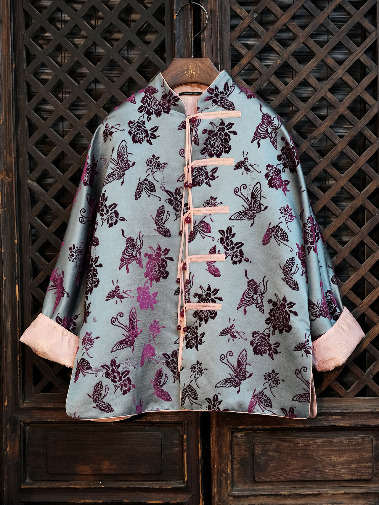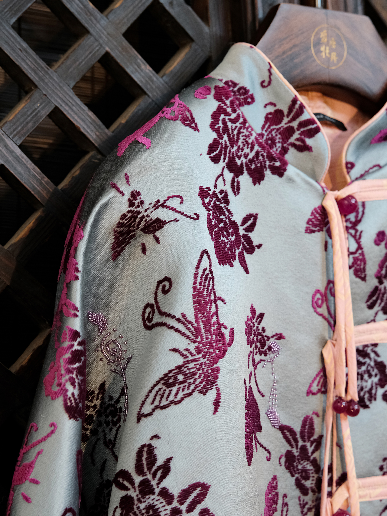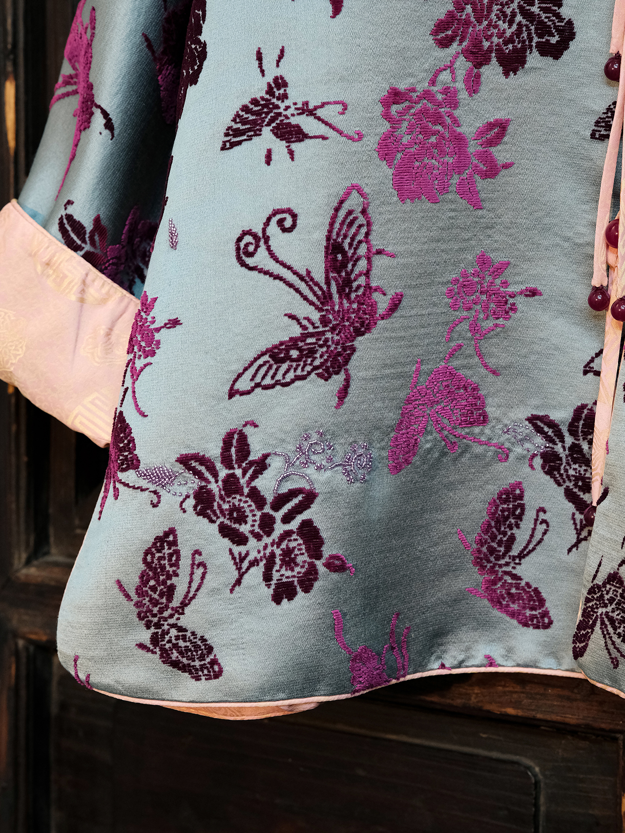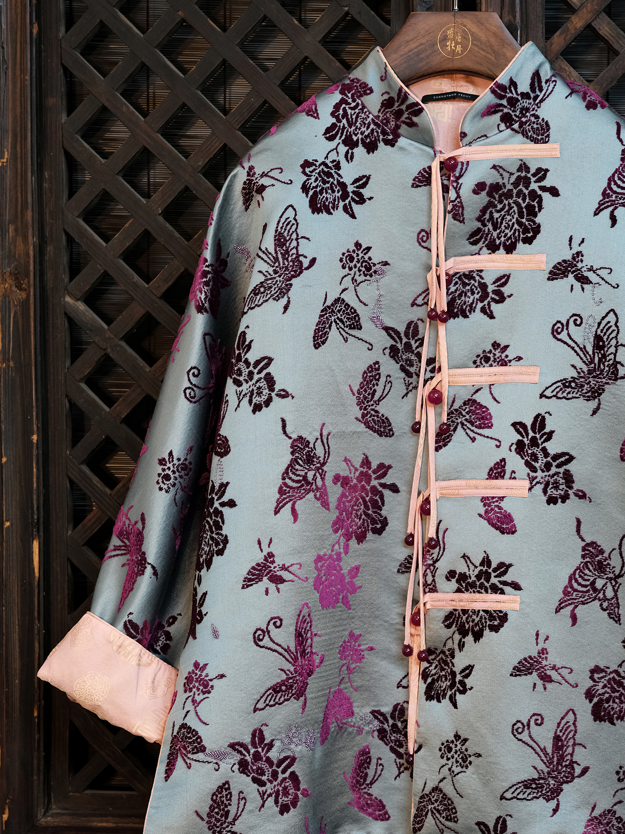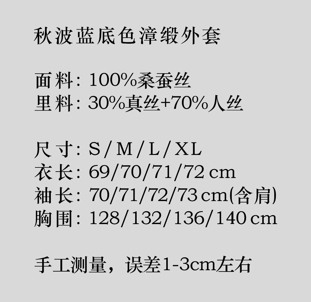 盛唐牡丹|秋波蓝底色漳缎外套-钉珠款(钉珠花纹随机)