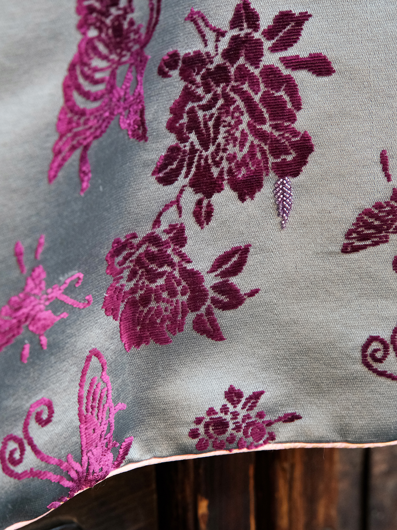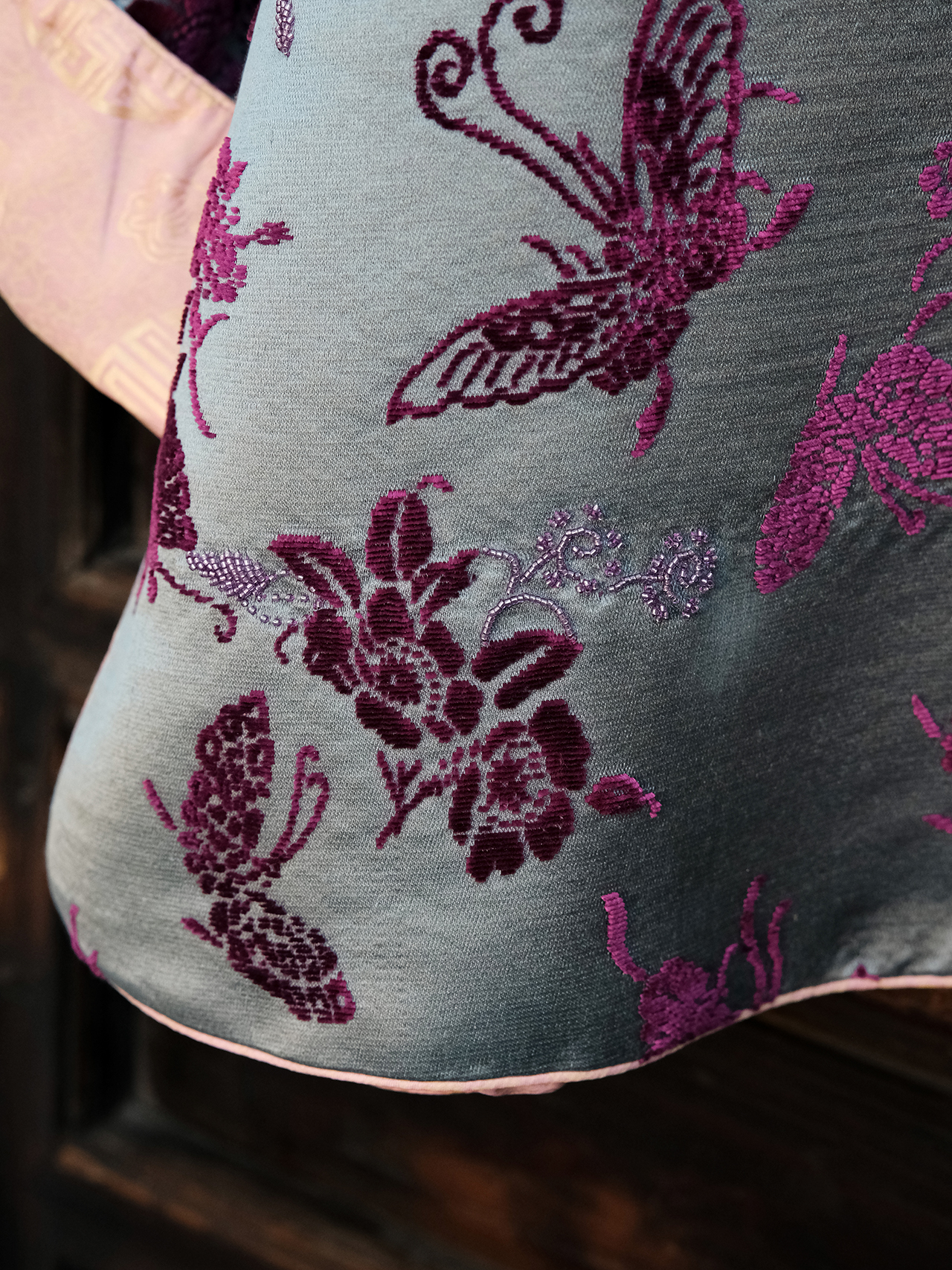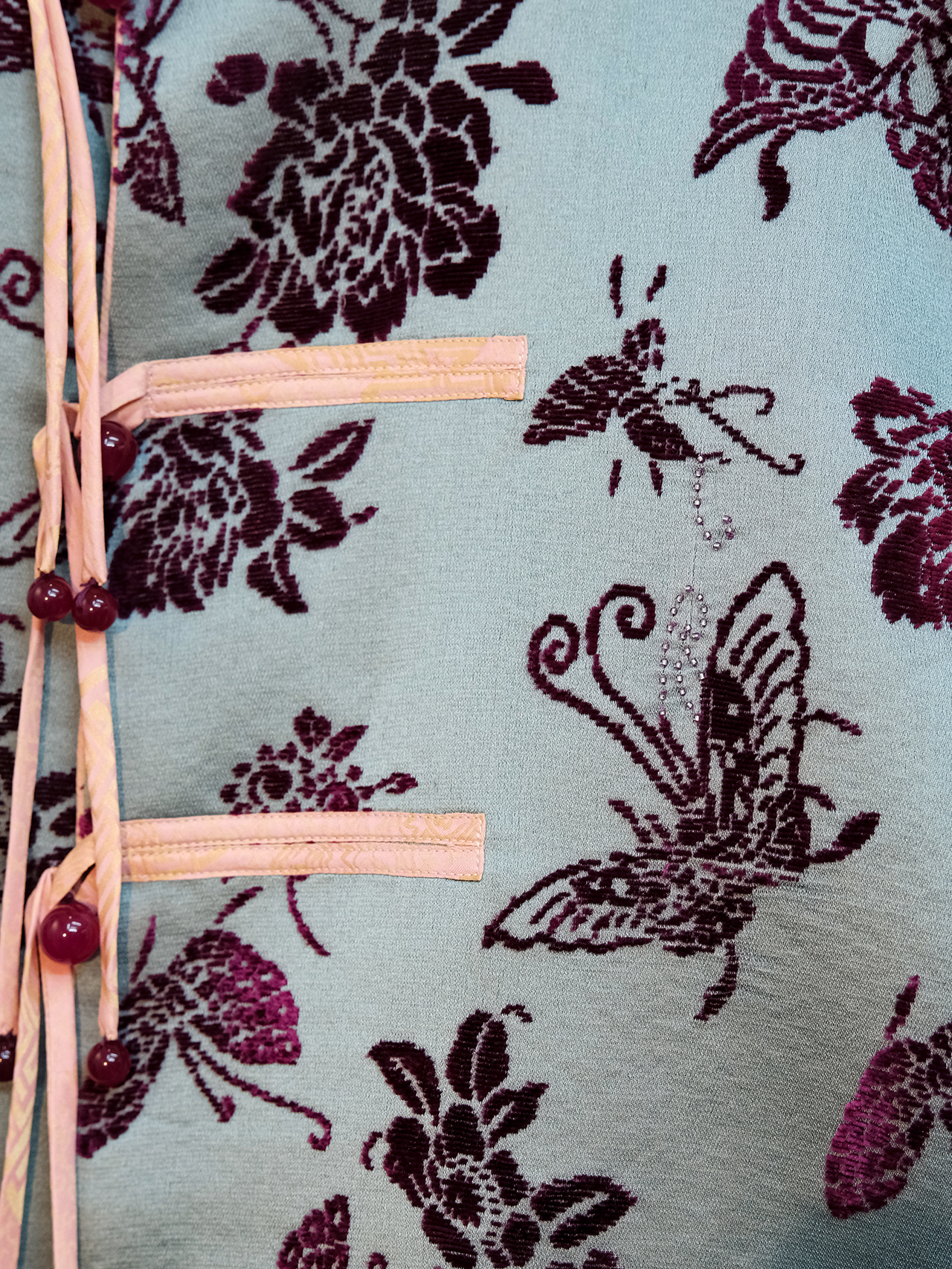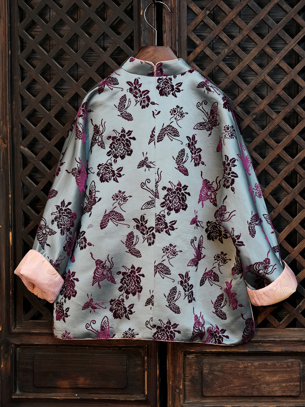 盛唐牡丹|秋波蓝底色漳缎外套-钉珠款(钉珠花纹随机)