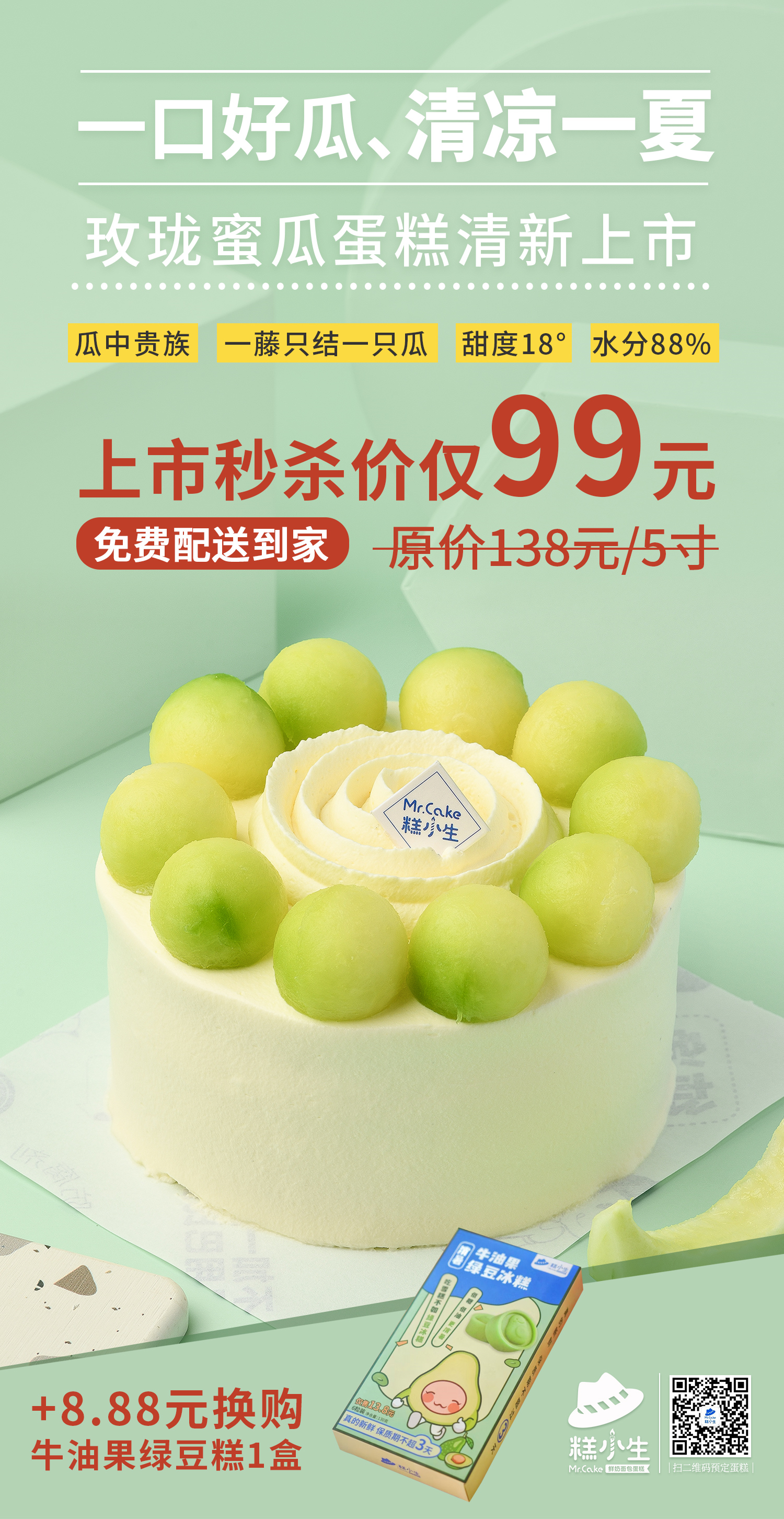 玫珑蜜瓜蛋糕5寸原价138元、上新秒杀价99元+8.88元换购绿豆糕一盒