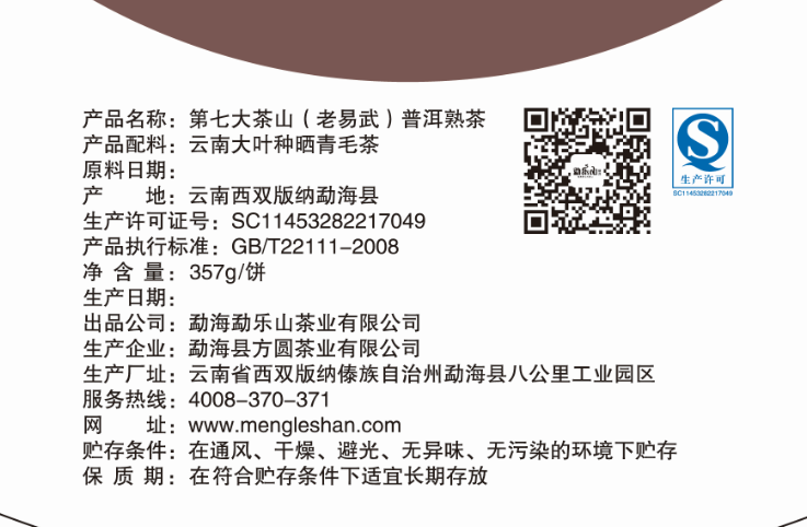 勐乐山第七大茶山普洱茶(老易武)熟茶357g