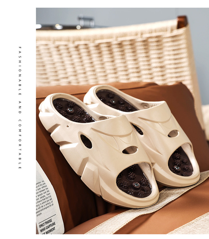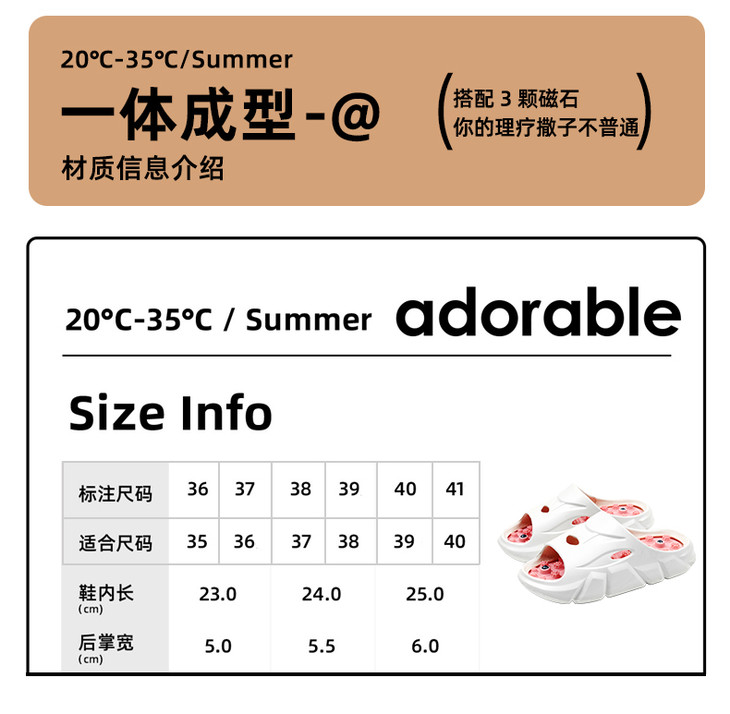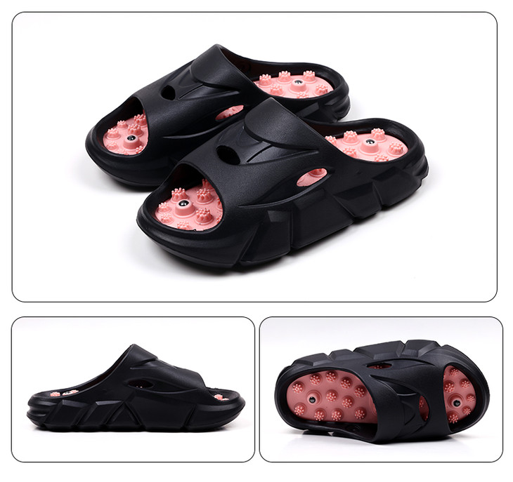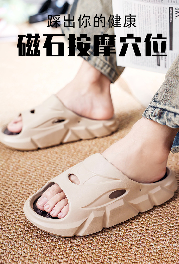 磁石按摩拖鞋的鞋身是一体成型的,核心亮点就是双重按摩设计了:鞋内分布的软弹性按摩点,贴合足底曲线,以不尖锐的指压触感包裹脚趾到脚跟,实现深度按压;升级的三颗磁石分别对应前掌、足弓、足跟关键区域,与按摩点形成互补,每天穿十分钟,就能放松紧张的足底筋膜、促进全身血液循环,让一天的疲惫随脚步慢慢消散。安全细节也毫不含糊,鞋底加入防滑纹理,凹凸纹路牢牢抓附地面,居家行走更安心。