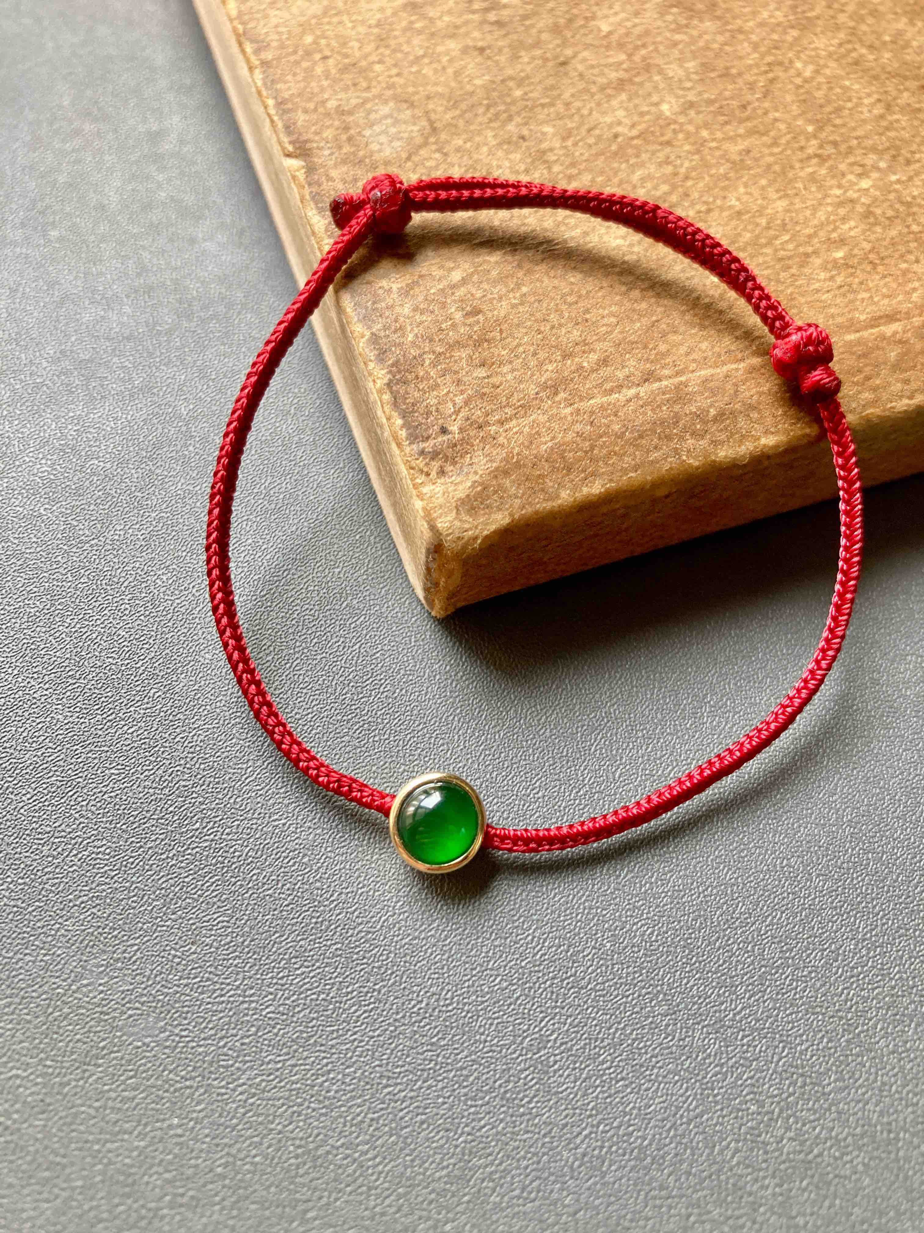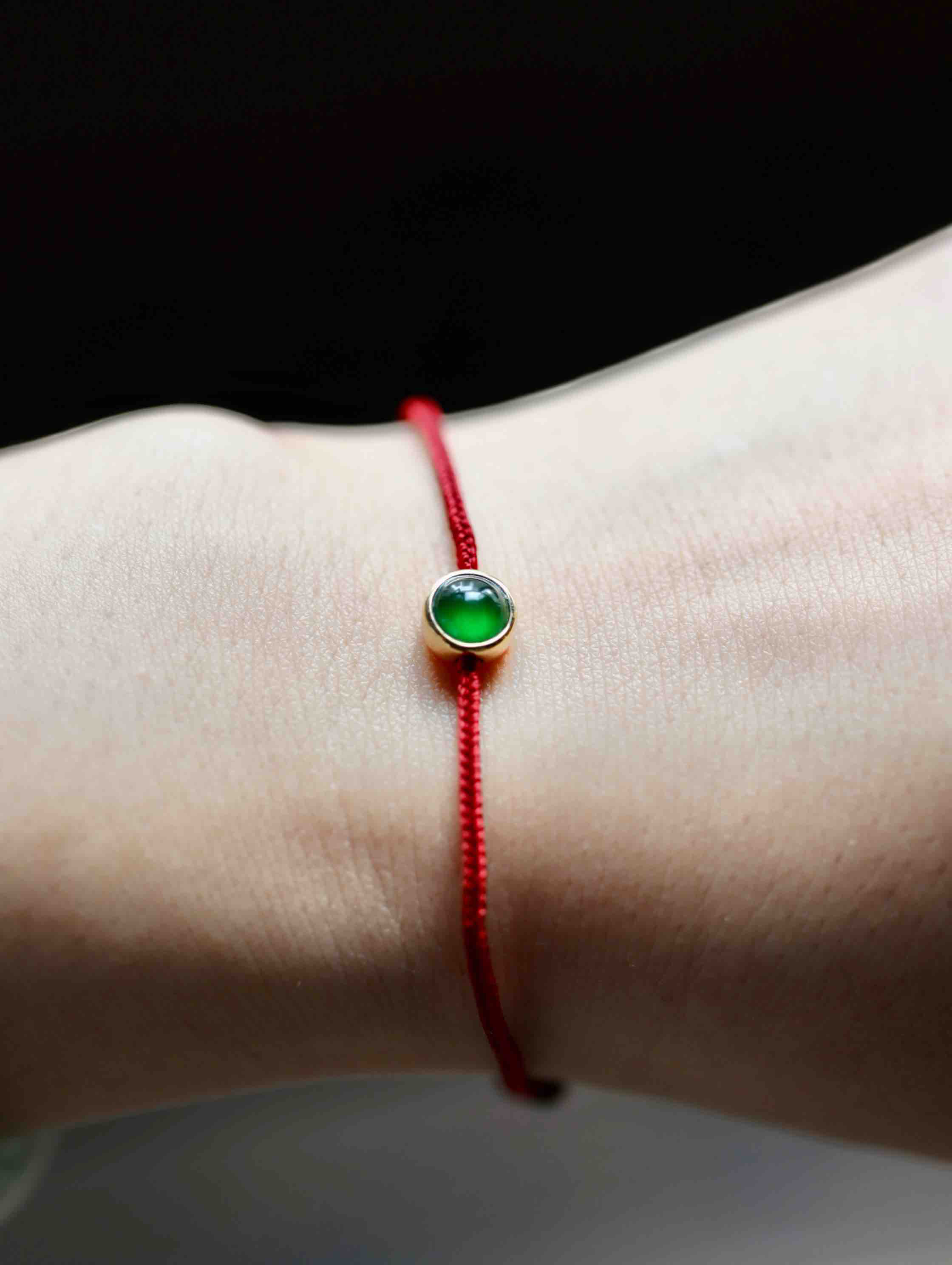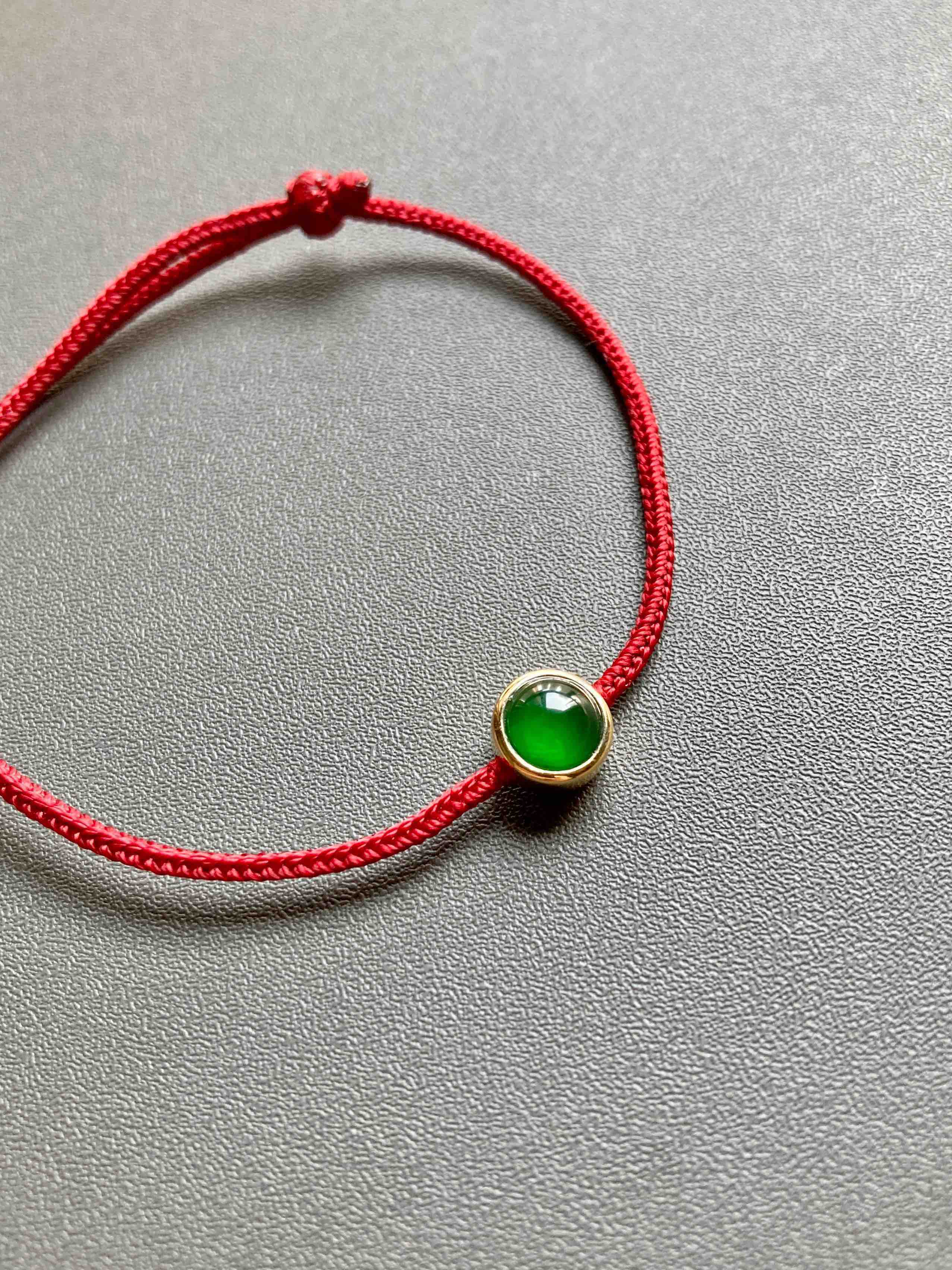 经典包镶款蛋面手绳,极致简约,有时候不设计就是最好的设计,稀有正圆高冰种阳绿翡翠蛋面,种水晶莹剔透,阳绿艳丽无比,和镶嵌款式简直天作之合,18k黄金镶嵌,绑红绳,上身太好看了,日常百搭,价格超划算,蛋面6.5mm,镶嵌后7.5×7.5×5.4mm