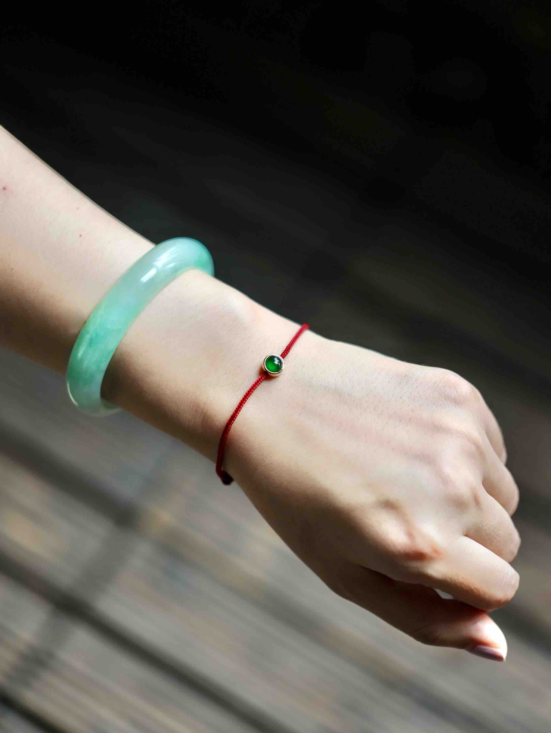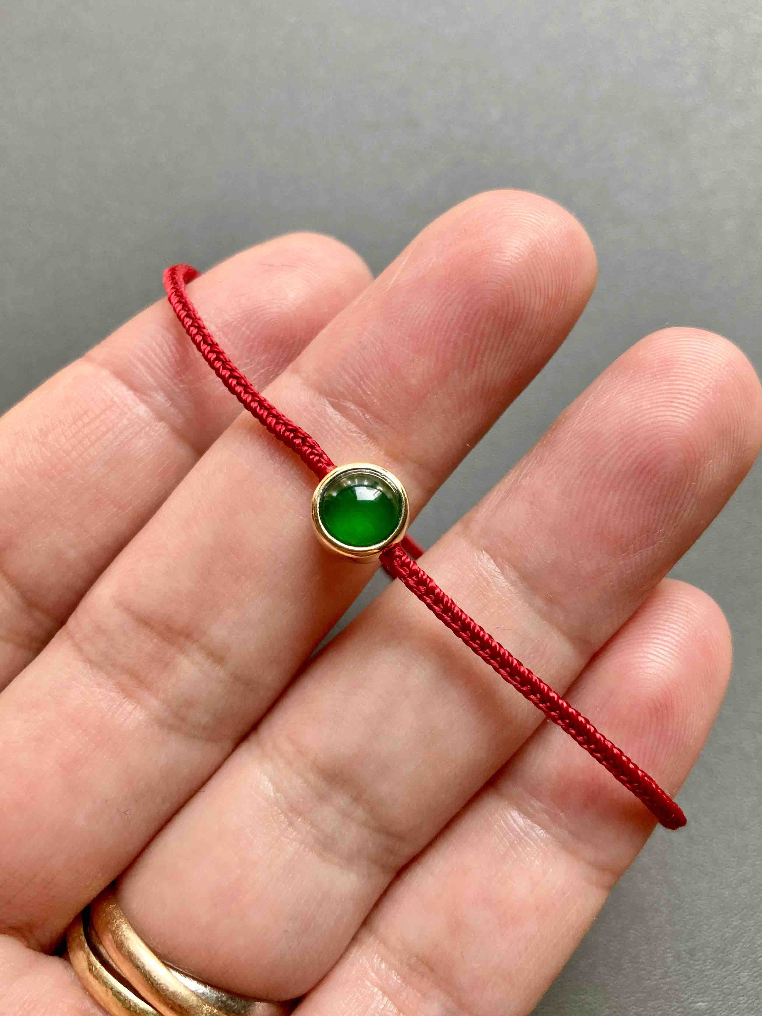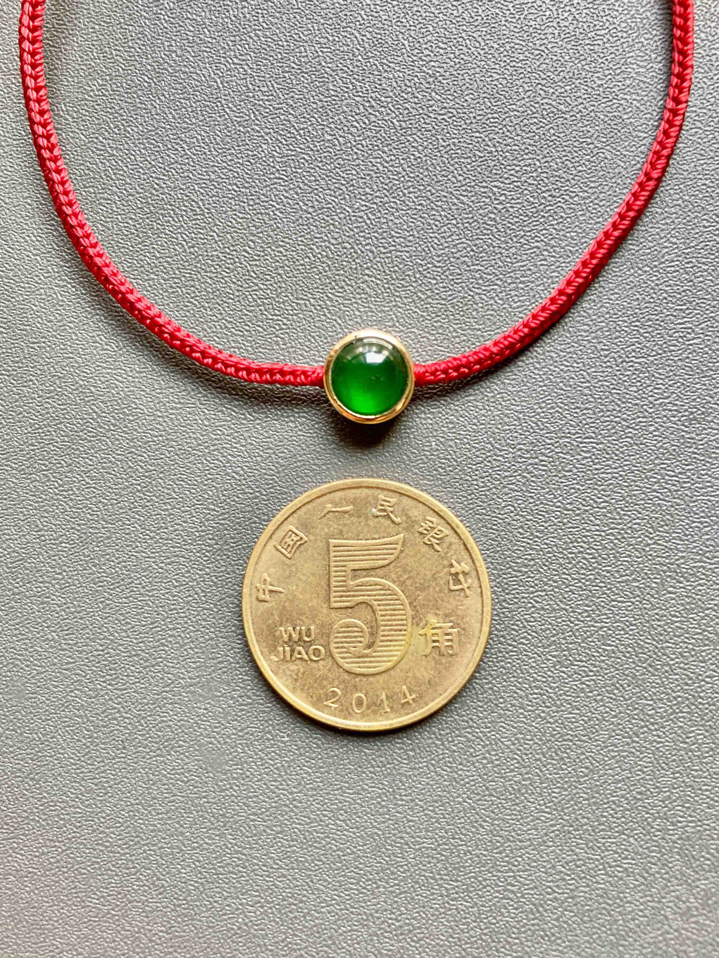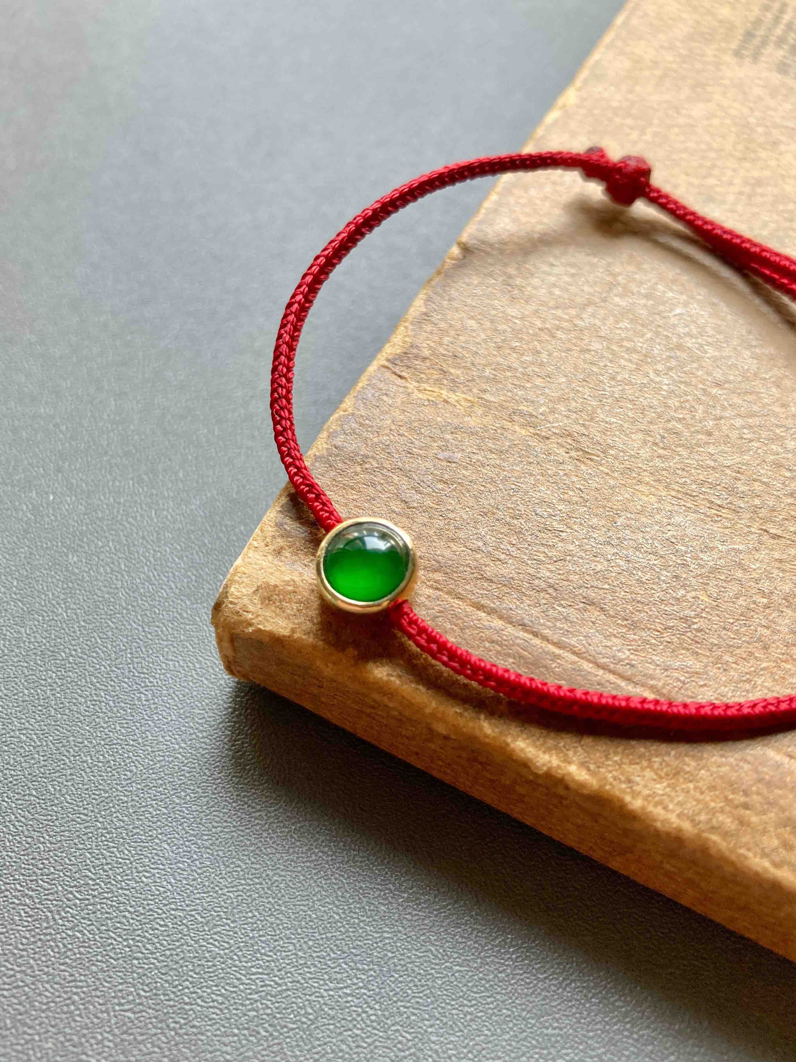 经典包镶款蛋面手绳,极致简约,有时候不设计就是最好的设计,稀有正圆高冰种阳绿翡翠蛋面,种水晶莹剔透,阳绿艳丽无比,和镶嵌款式简直天作之合,18k黄金镶嵌,绑红绳,上身太好看了,日常百搭,价格超划算,蛋面6.5mm,镶嵌后7.5×7.5×5.4mm