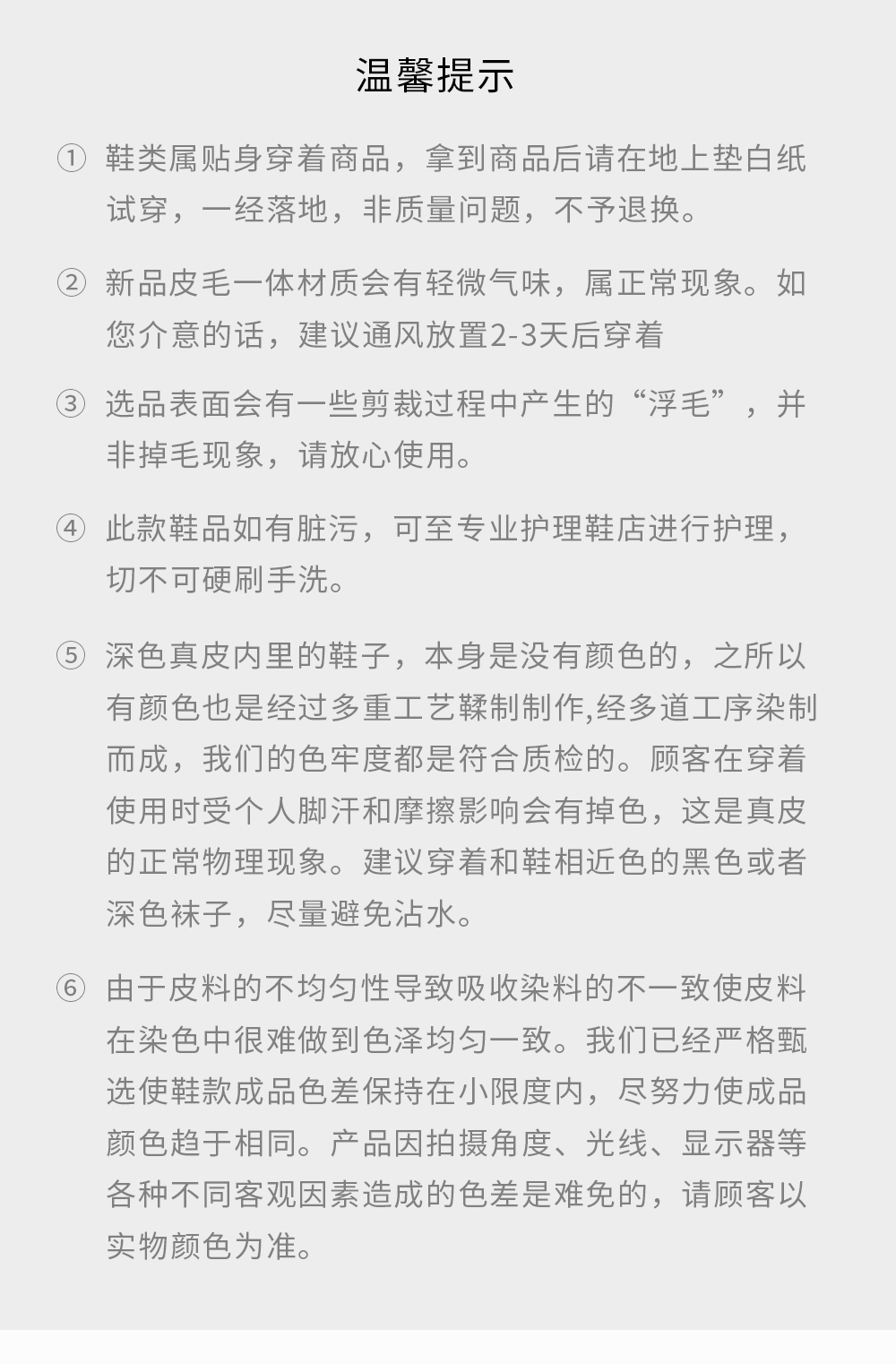 【售后政策】 支持7天无理由退换货质量问题我们承担调换货运费 (注:请务必使用原装鞋盒寄回(如鞋盒有遗失需扣款20元)。