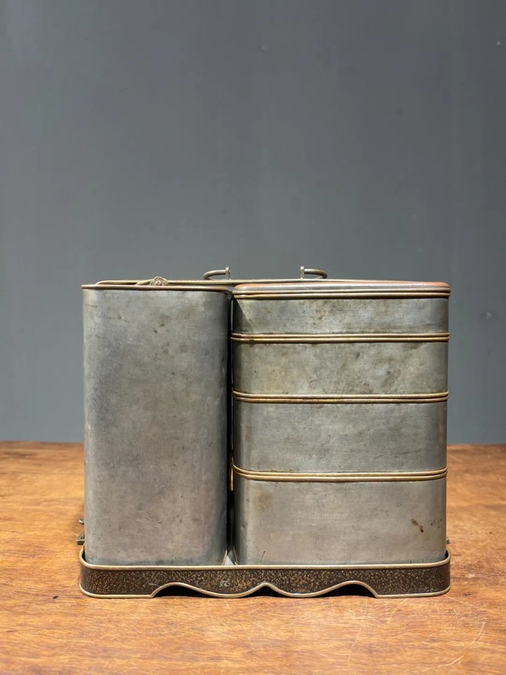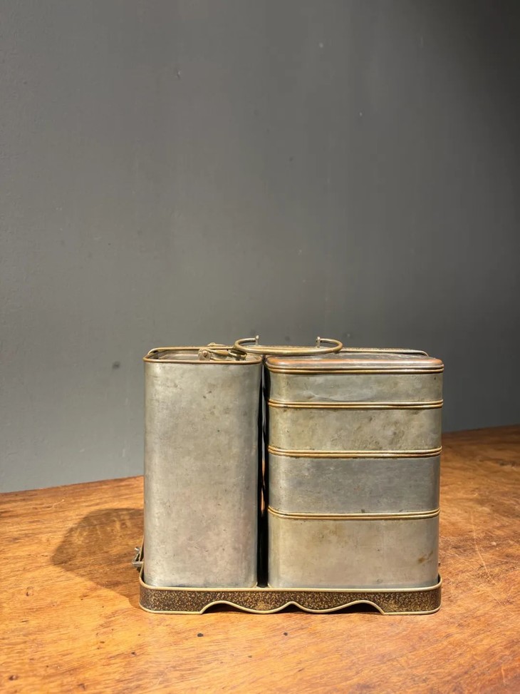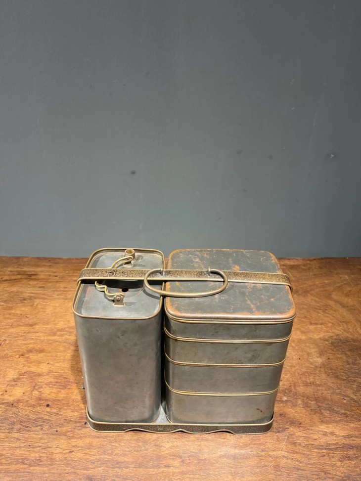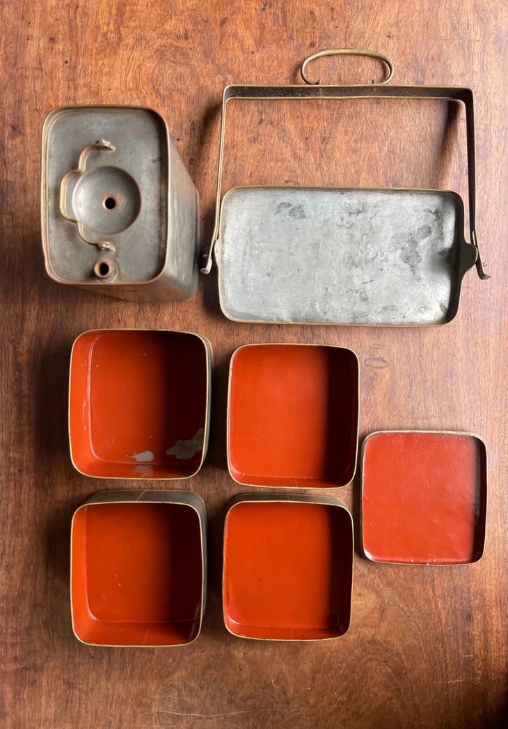 这是一套设计精巧、制作精緻严谨的携带式多层餐盒与饮料容器,手工錾铜鎏银,内部髹红漆四层食物盒,以及饮料罐,并置于设计奇巧的扣环提把,取材精良,制作严谨,是日本十九世纪的高端携带式餐饮容器。
