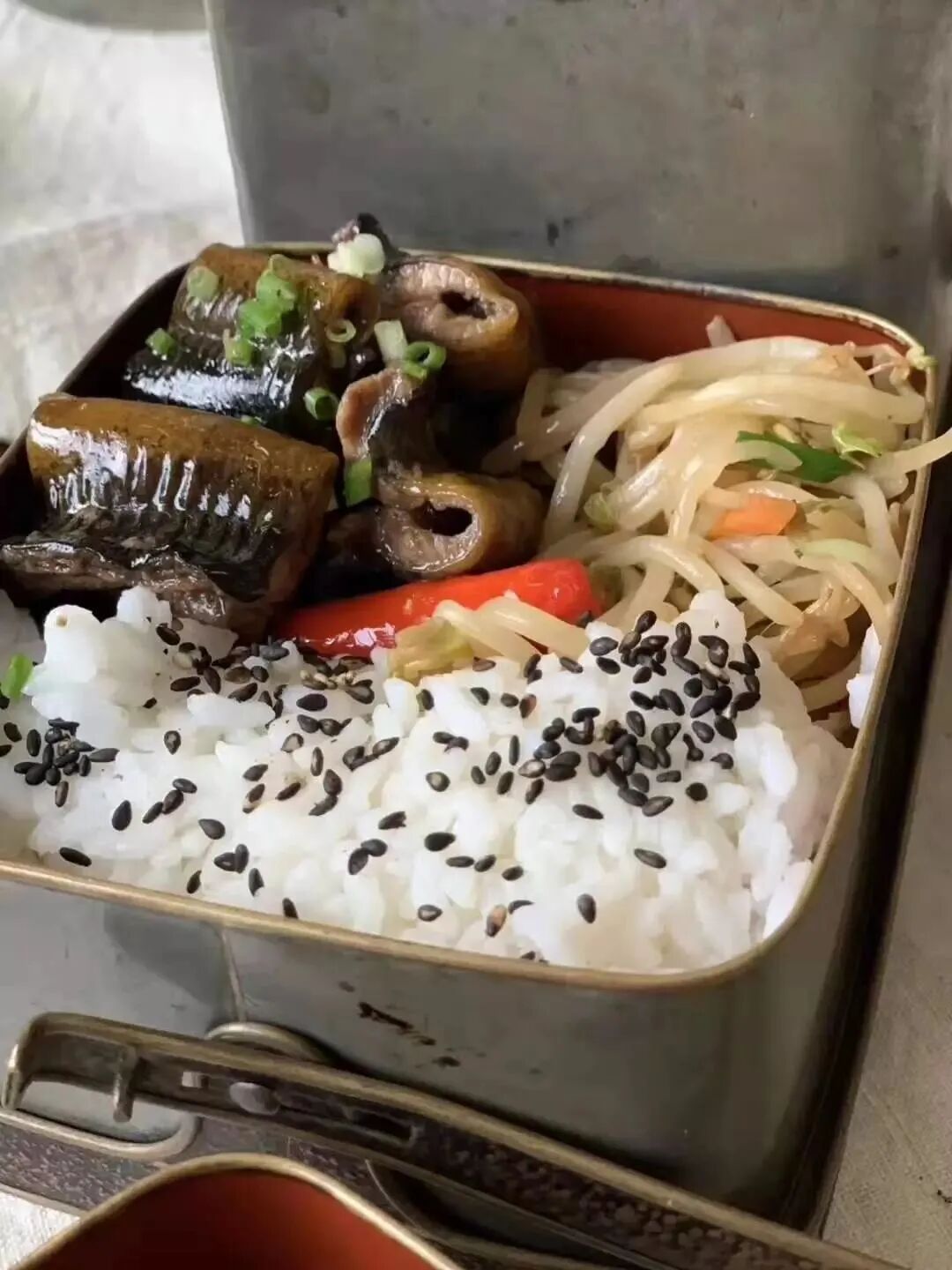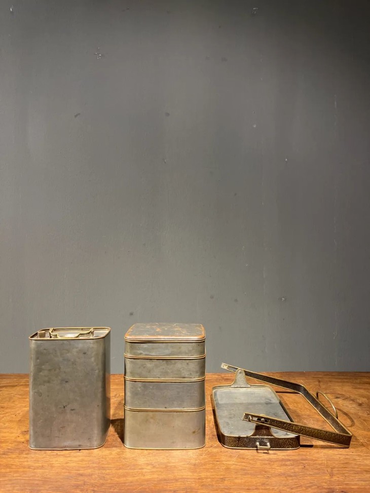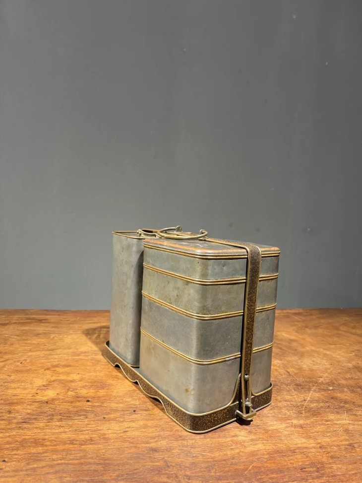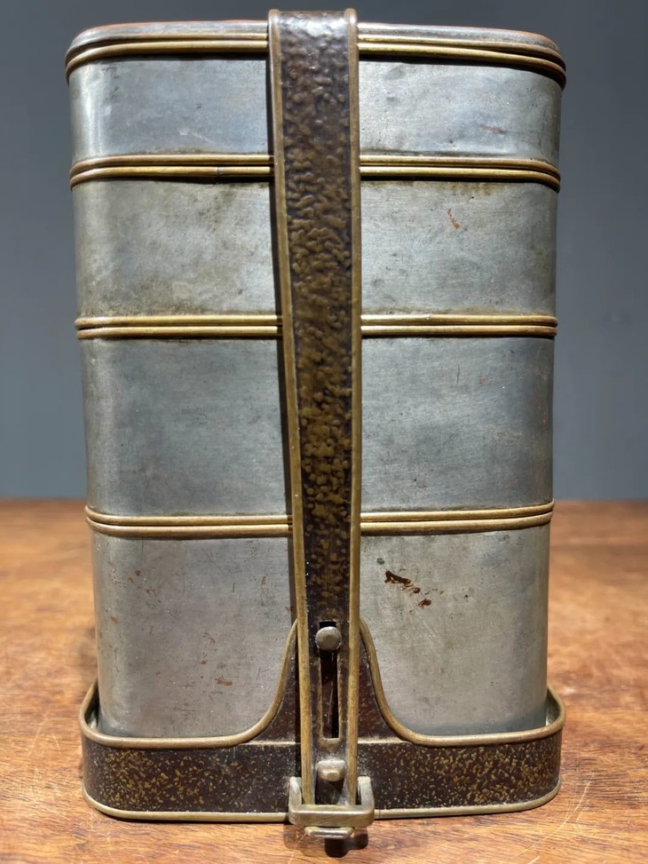 这是一套设计精巧、制作精緻严谨的携带式多层餐盒与饮料容器,手工錾铜鎏银,内部髹红漆四层食物盒,以及饮料罐,并置于设计奇巧的扣环提把,取材精良,制作严谨,是日本十九世纪的高端携带式餐饮容器。