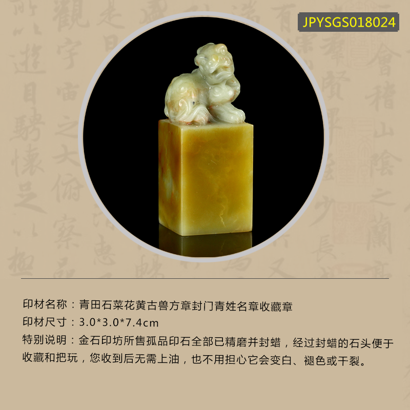孤品18024青田石菜花黄古兽方章封门青姓名章收藏章3.0*3.0*7.4cm