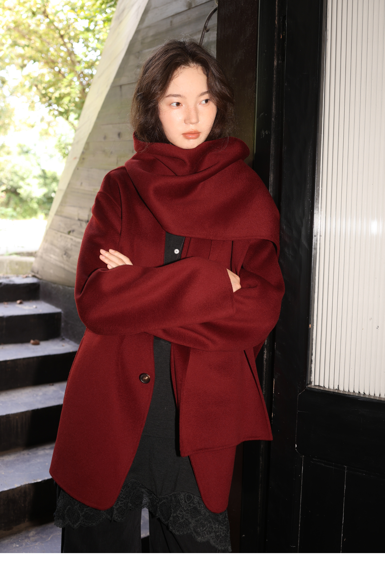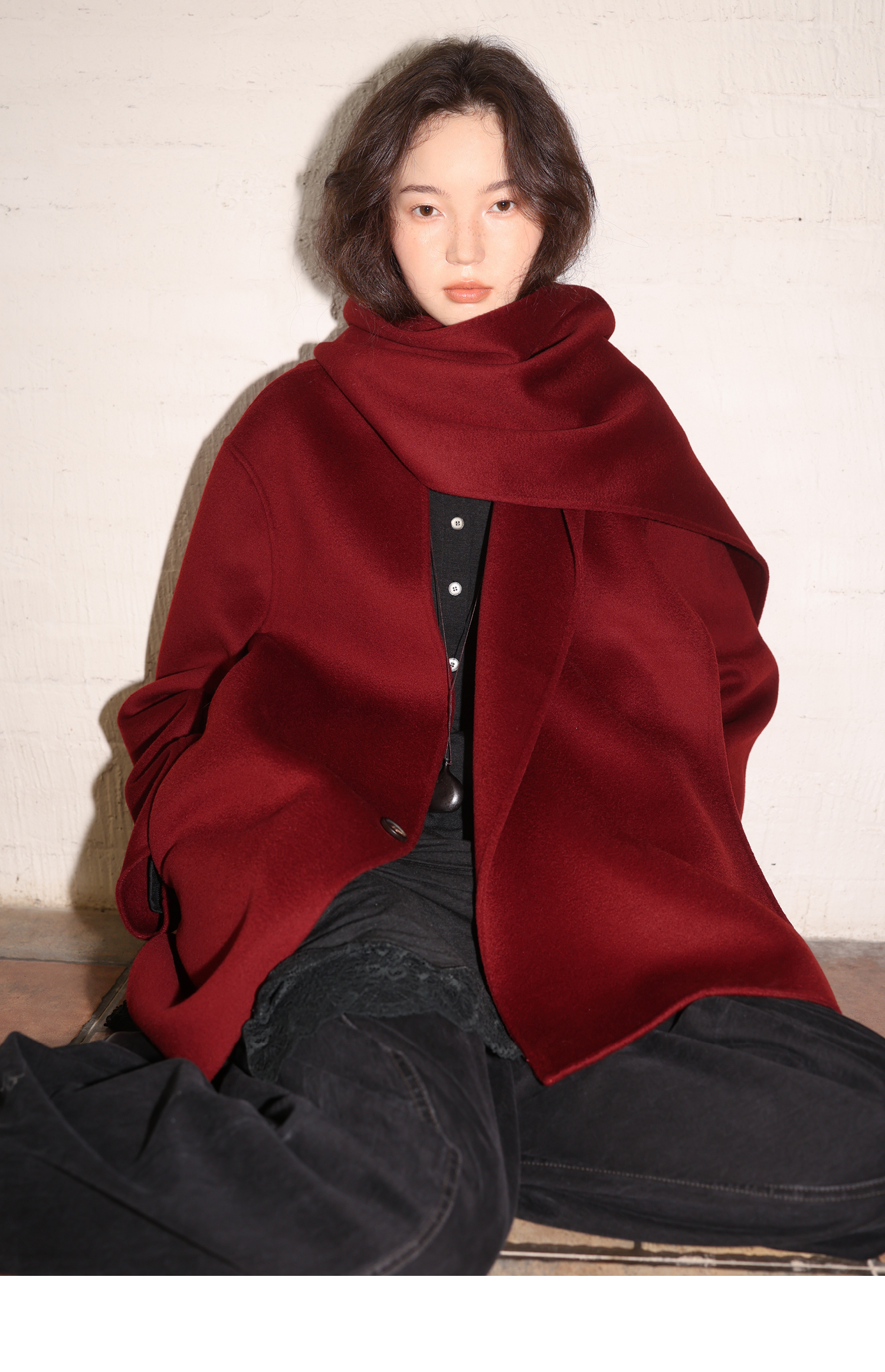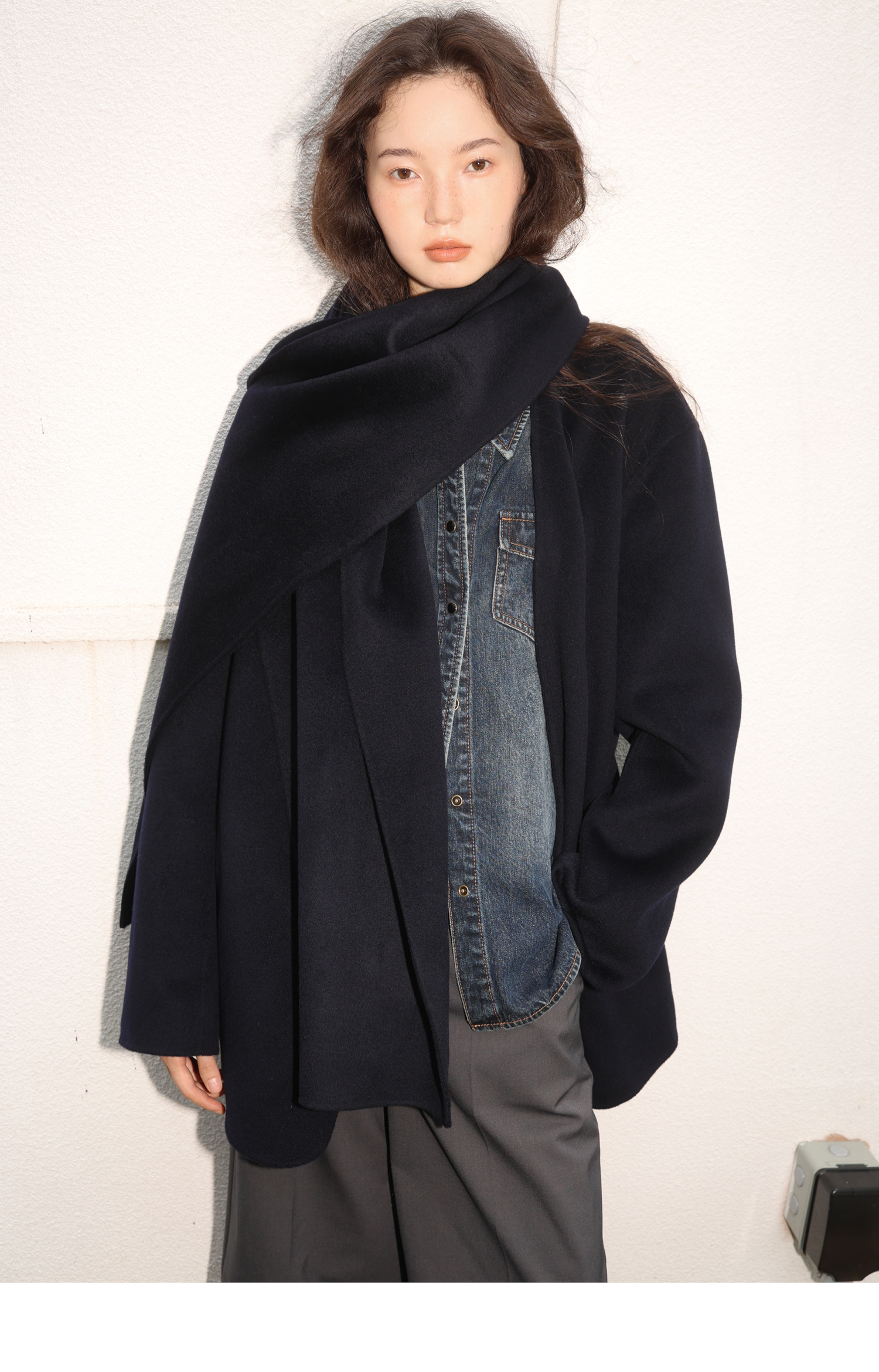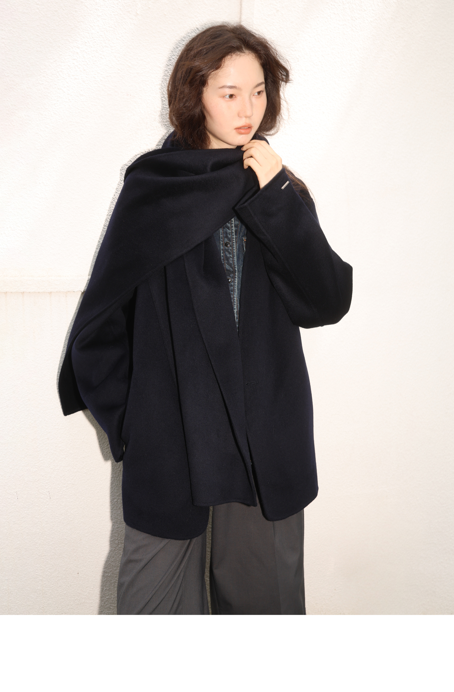 素舶 细支绵羊毛v领宽松可拆卸围巾短款双面呢大衣