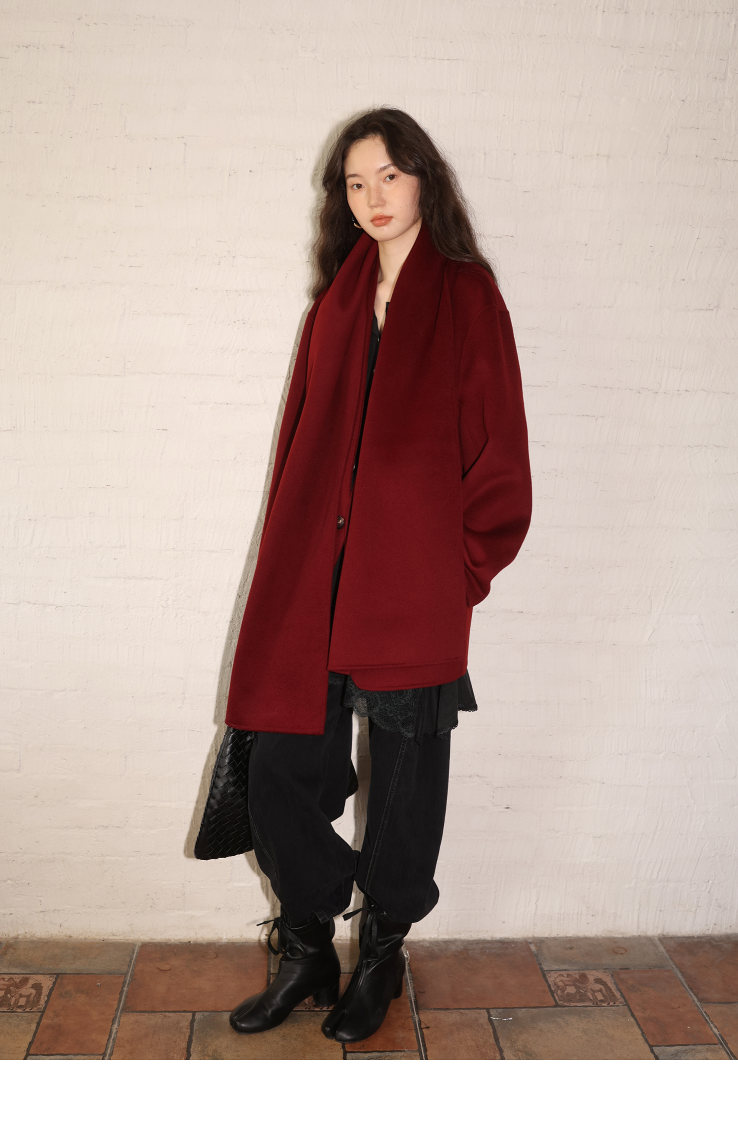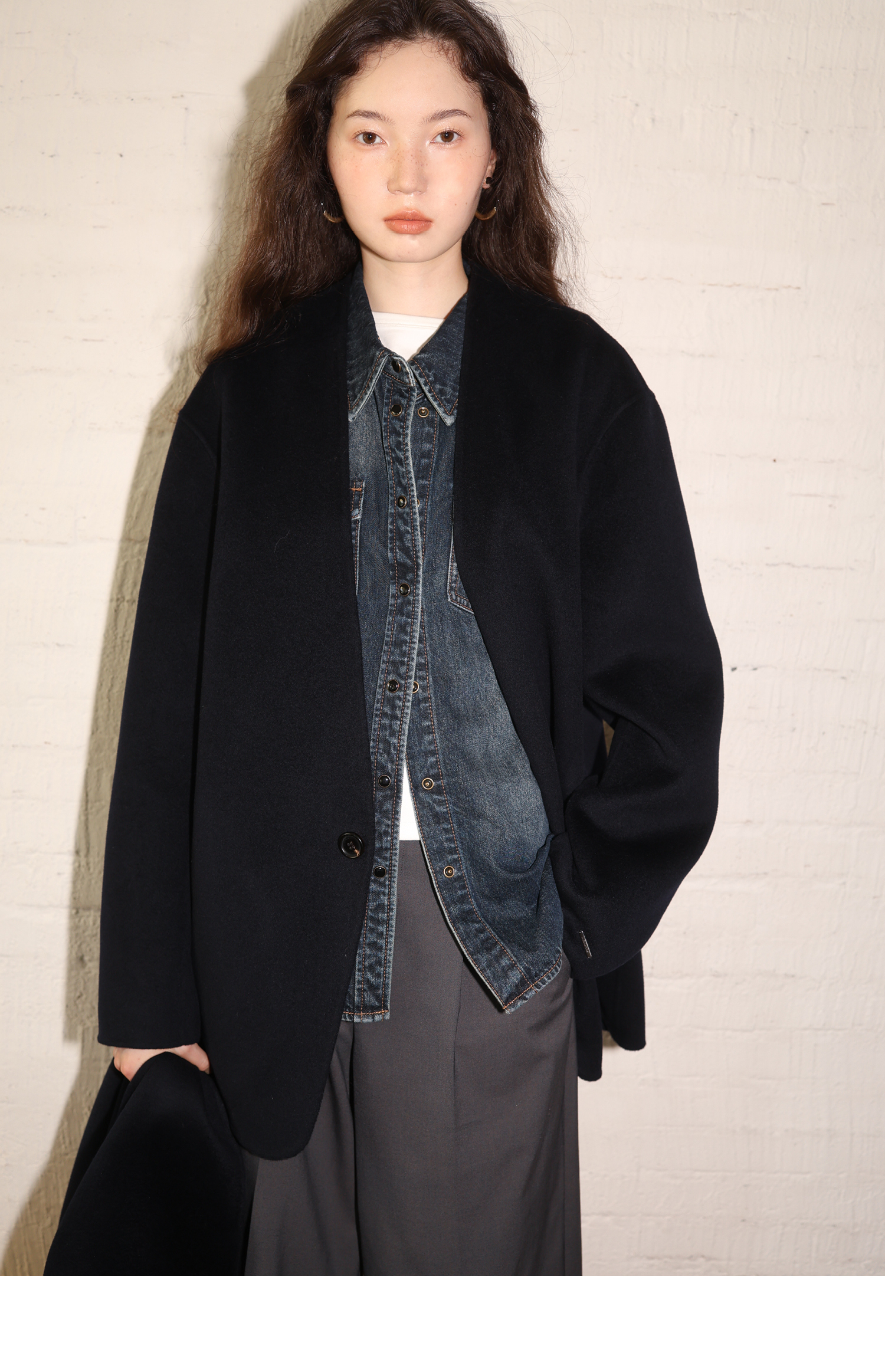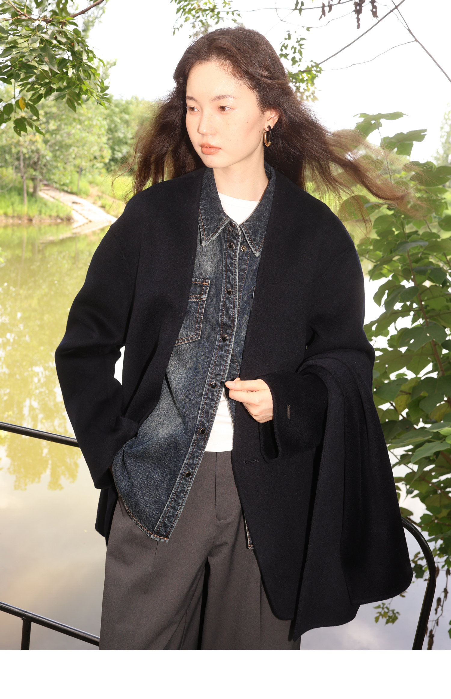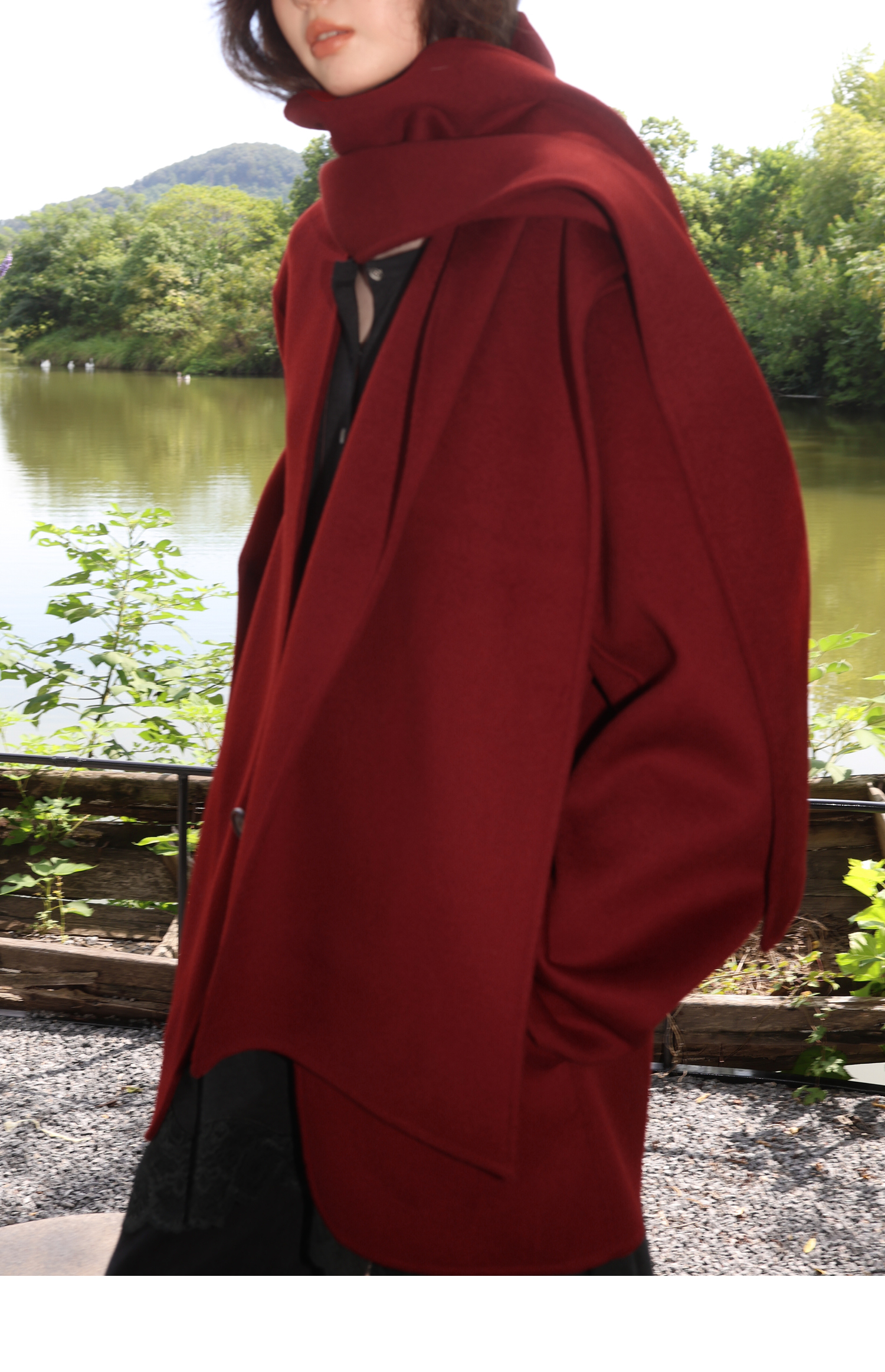 素舶 细支绵羊毛v领宽松可拆卸围巾短款双面呢大衣
