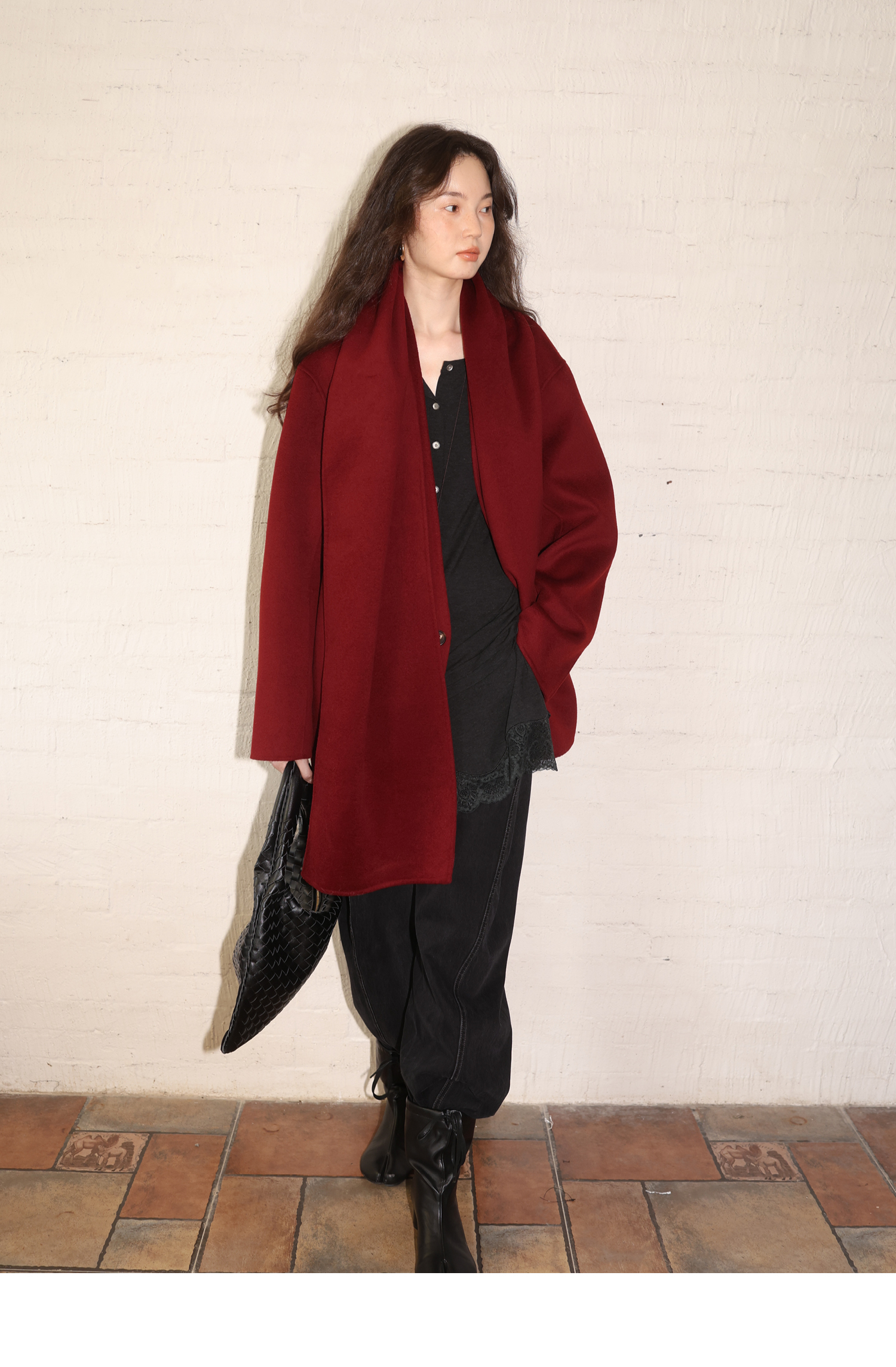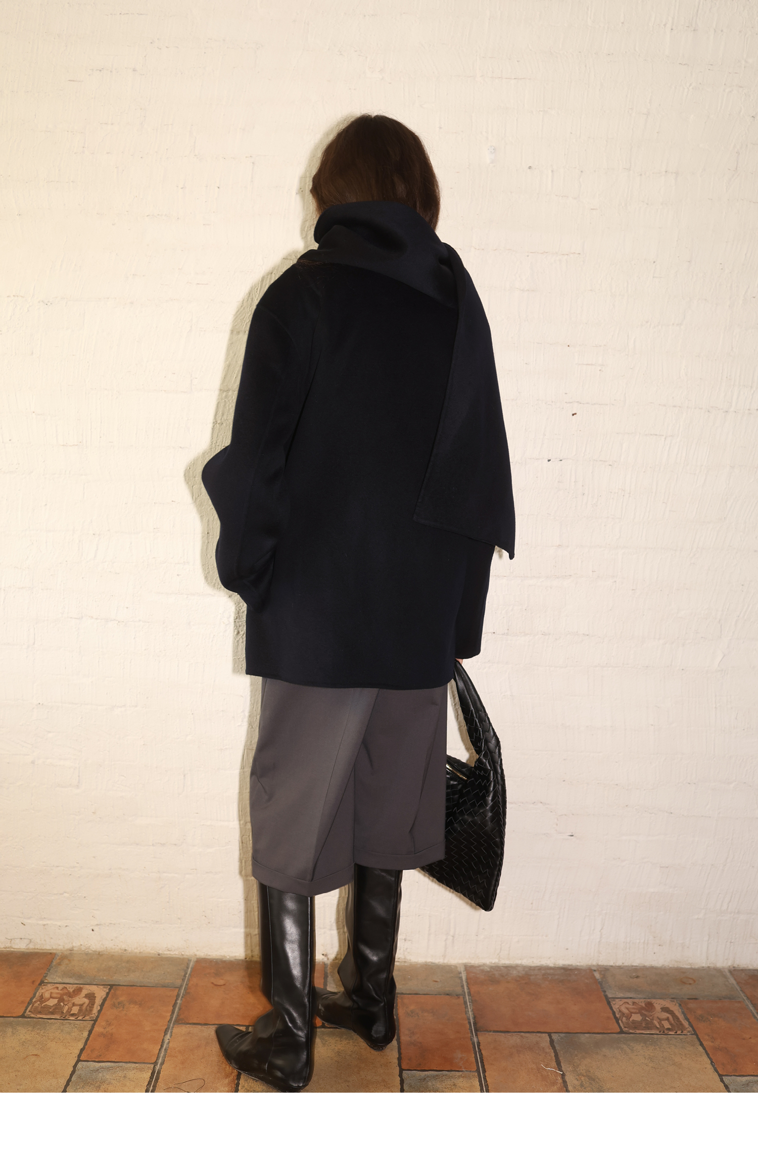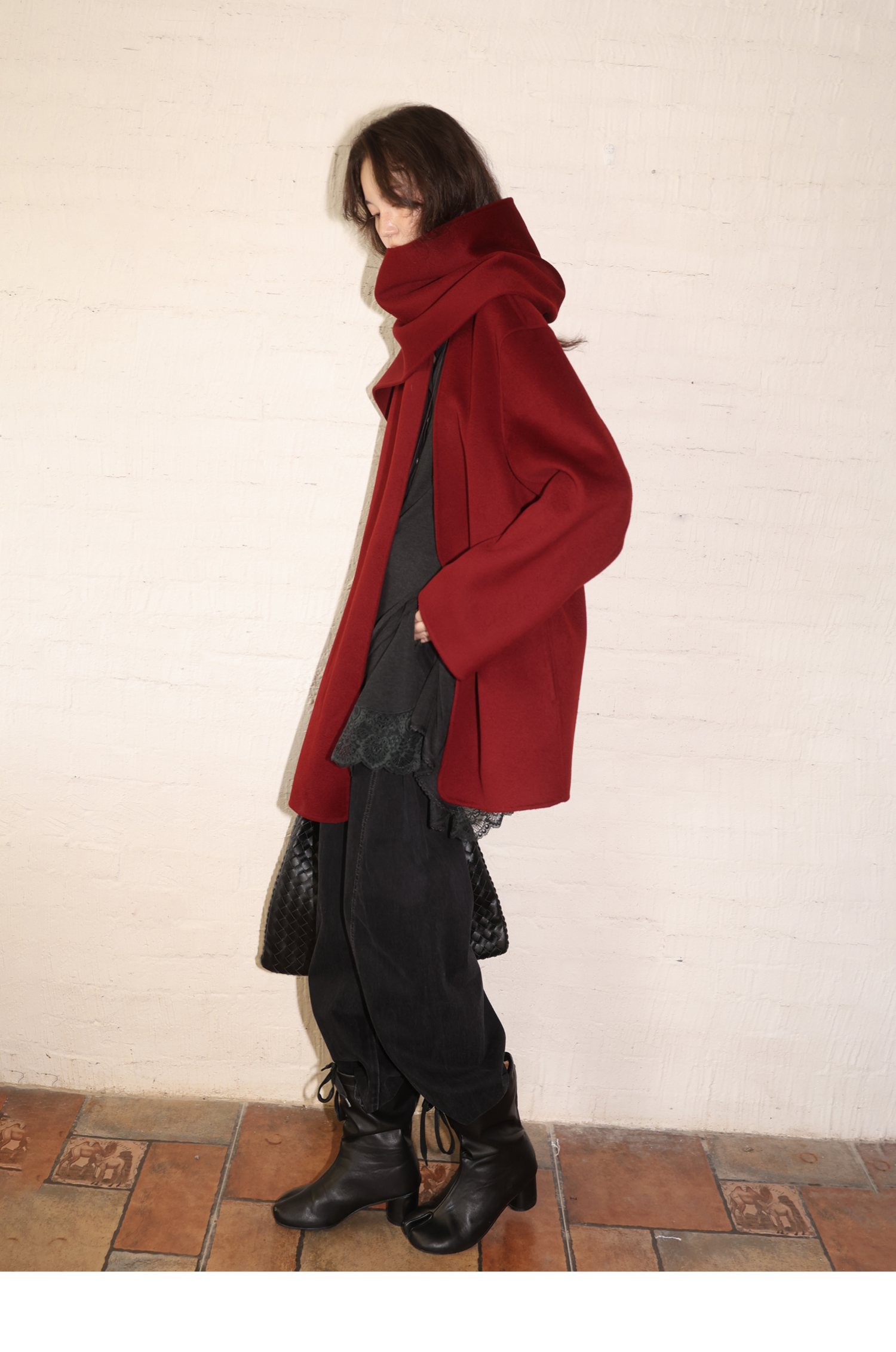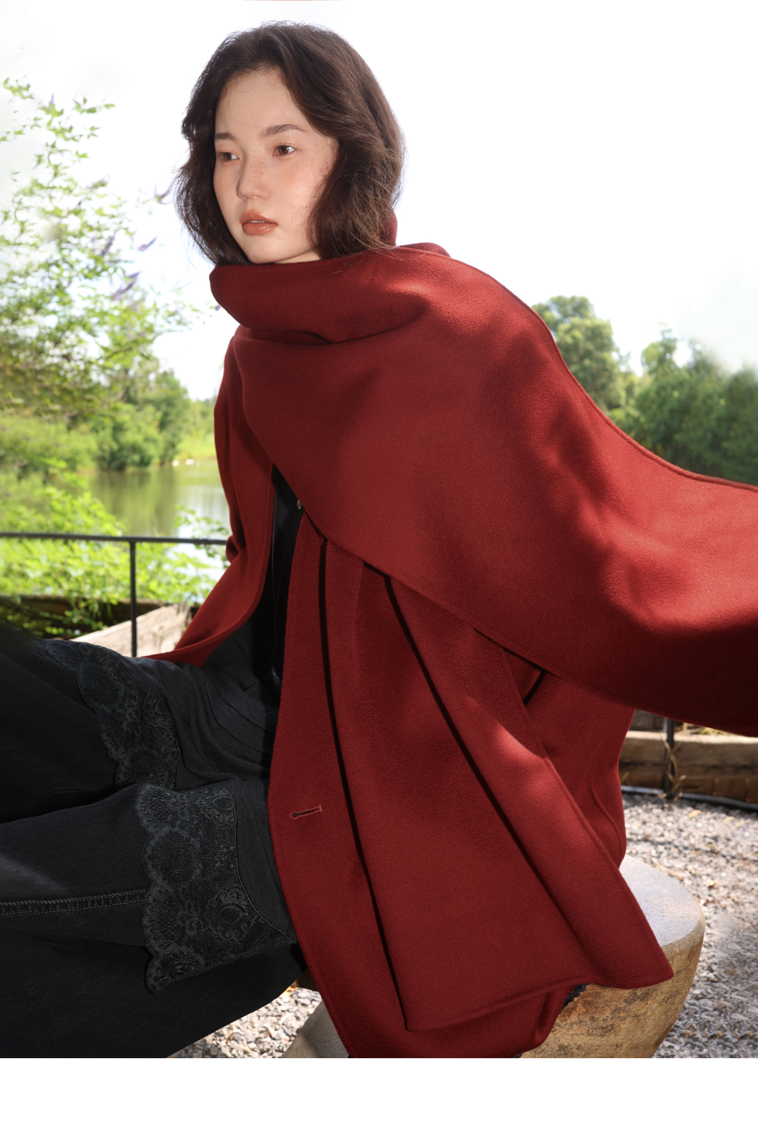 素舶 细支绵羊毛v领宽松可拆卸围巾短款双面呢大衣