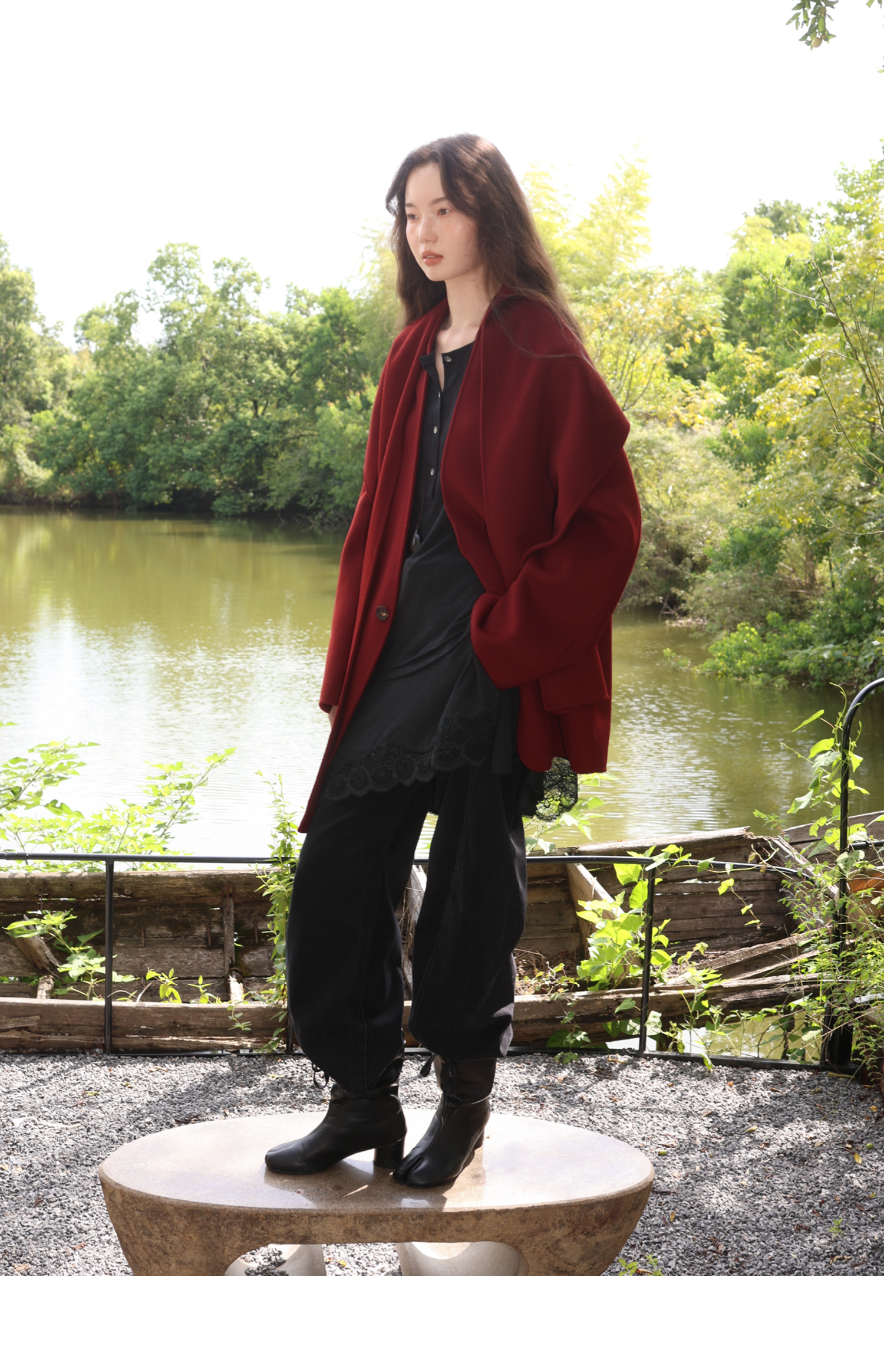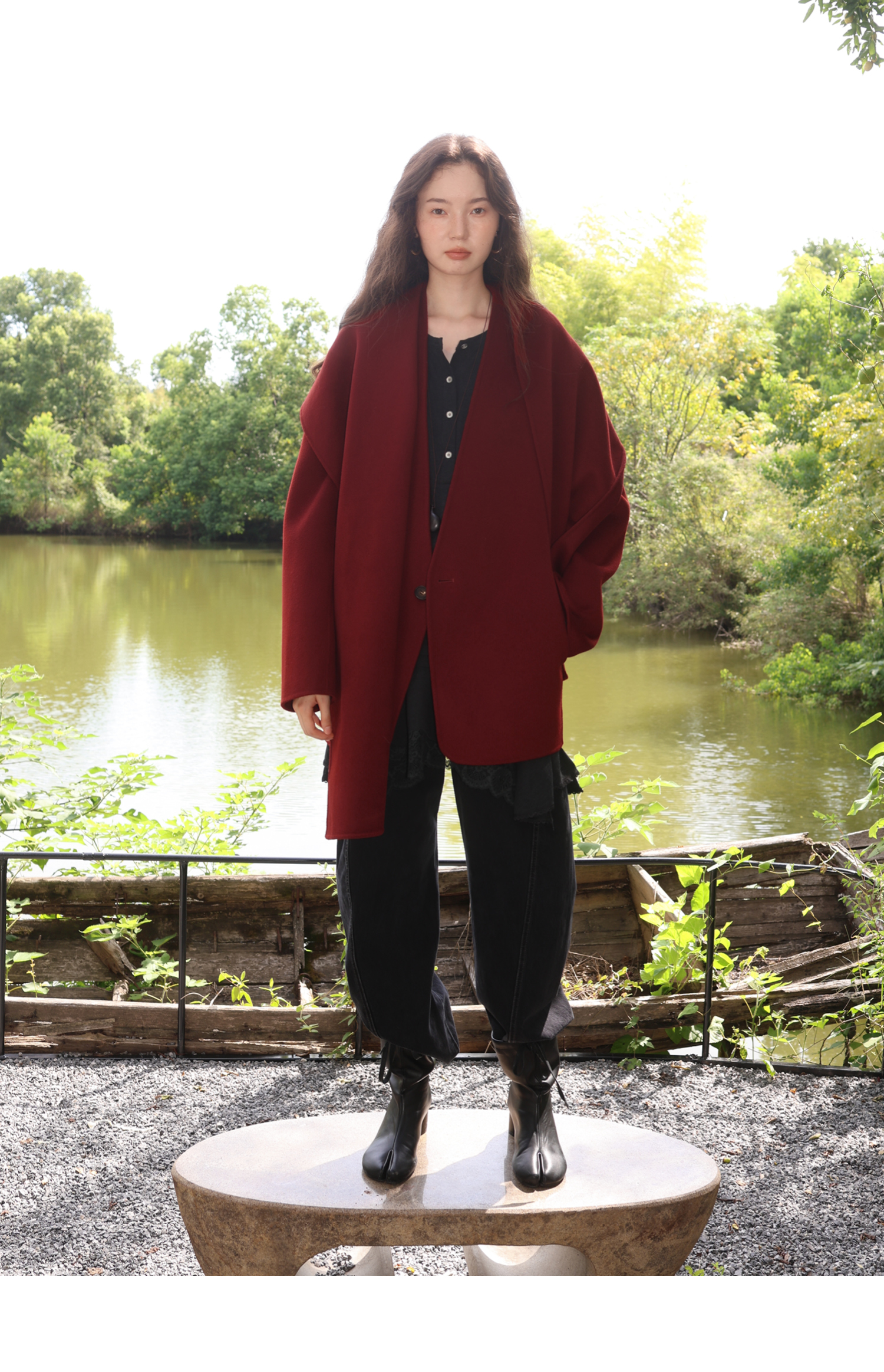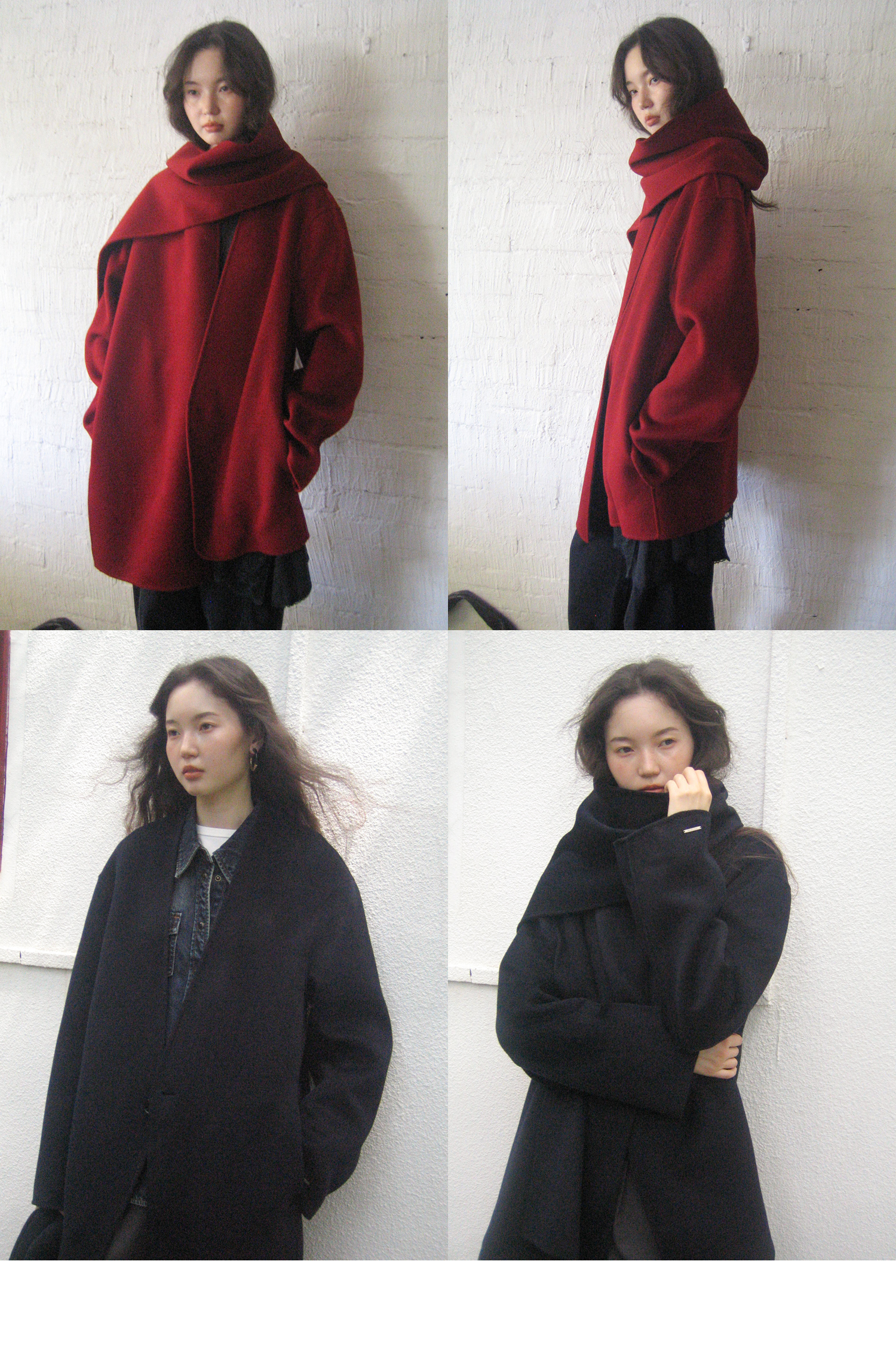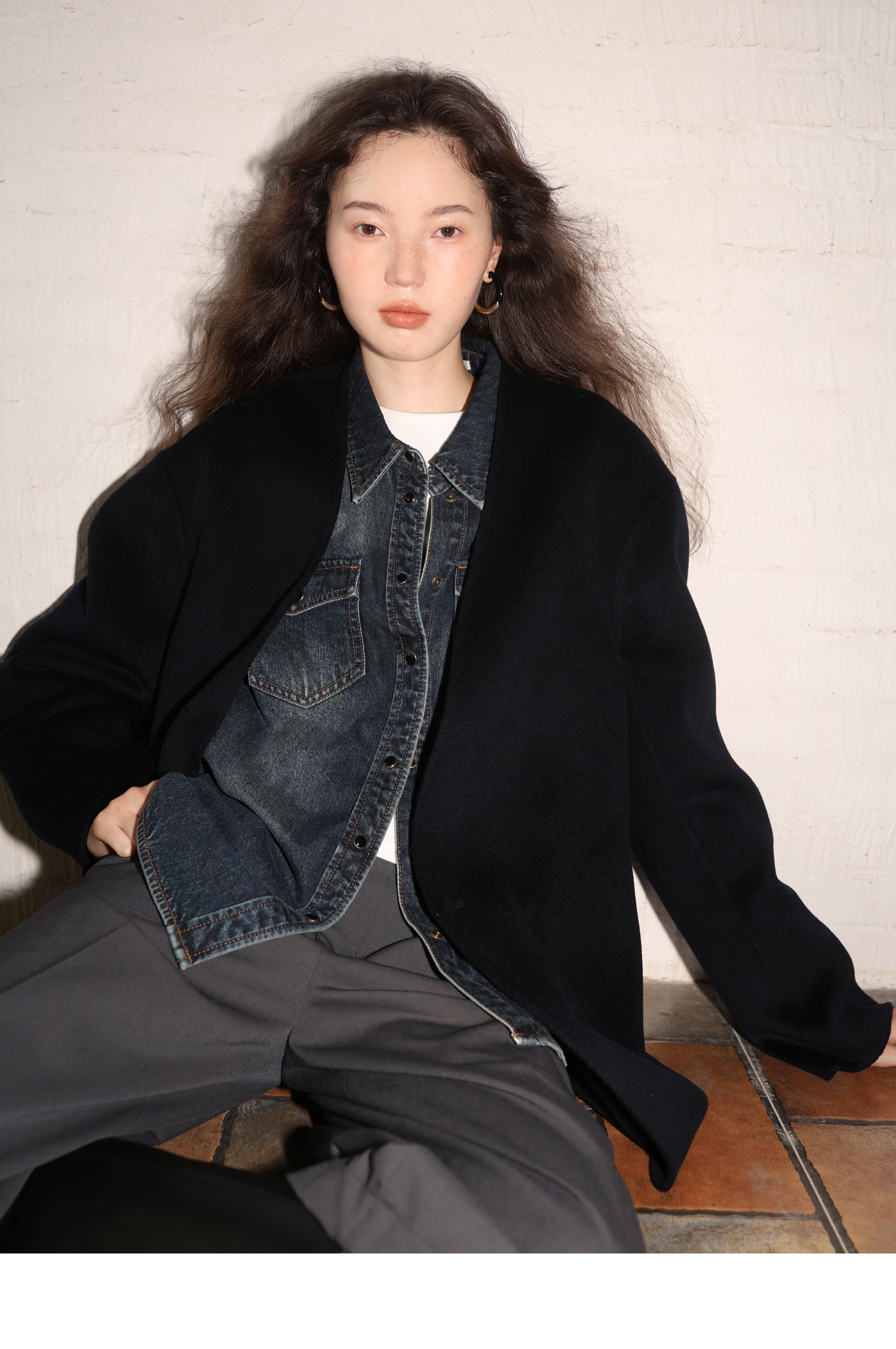 素舶 细支绵羊毛v领宽松可拆卸围巾短款双面呢大衣